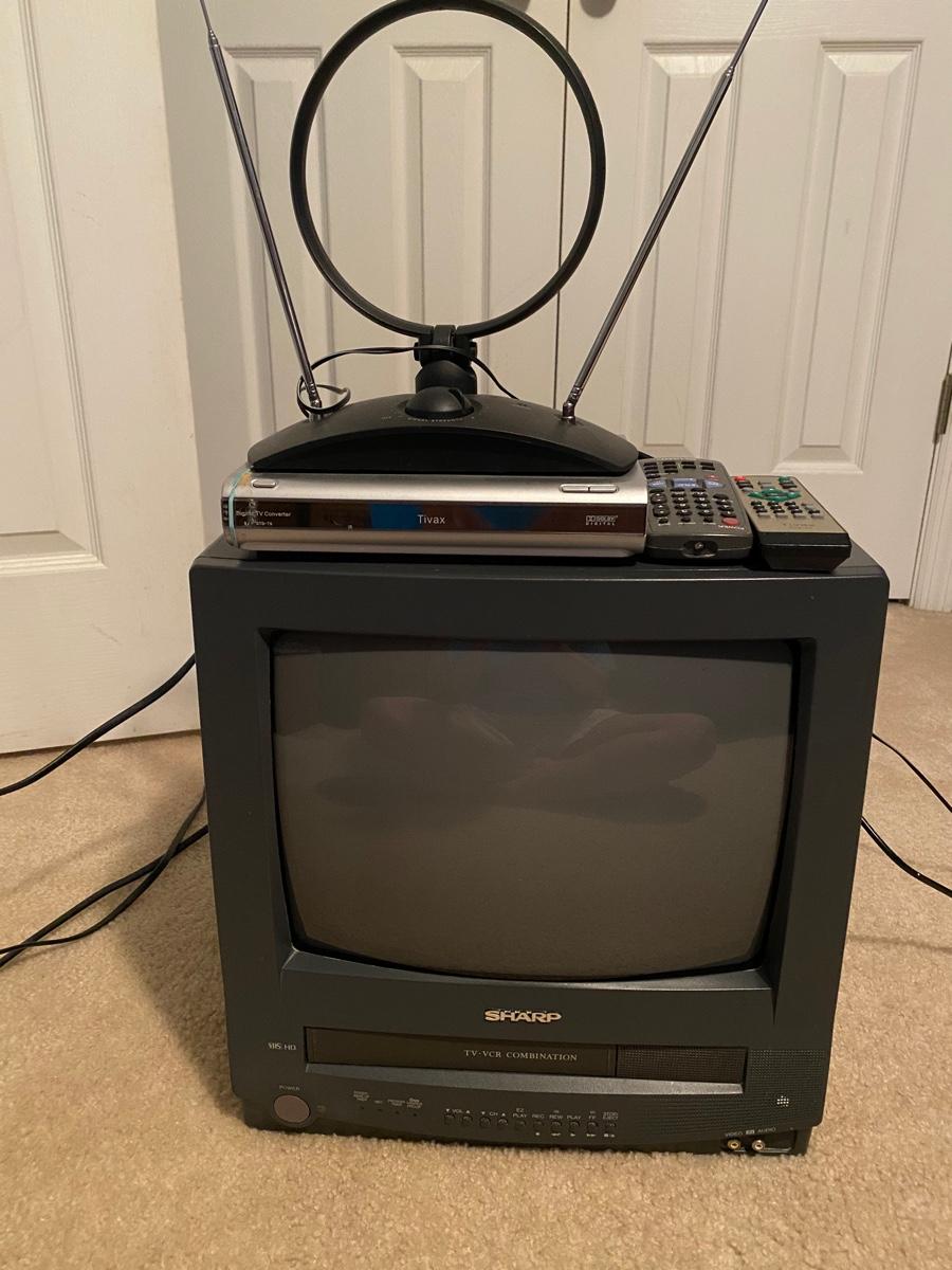 13” TV with VCR player and remote. VCR works, but will not rewind. Need to have another method to rewind. TIVO analog to digital converter with remote and antenna.