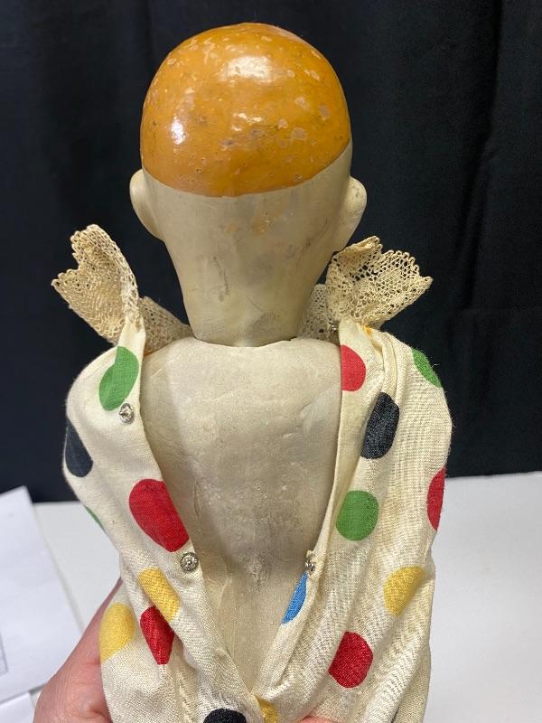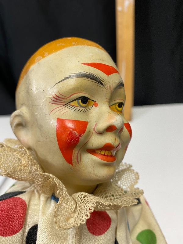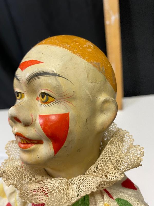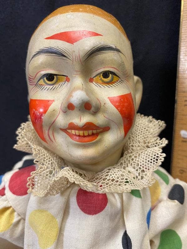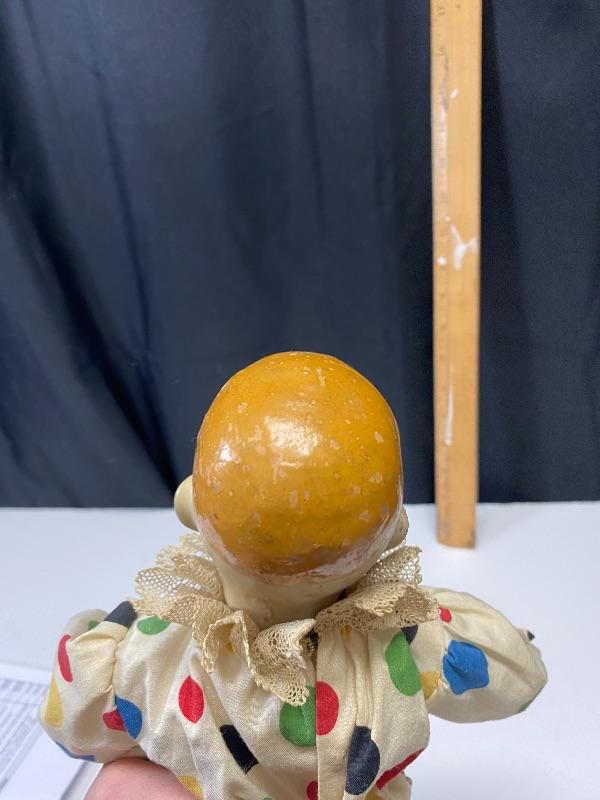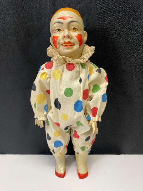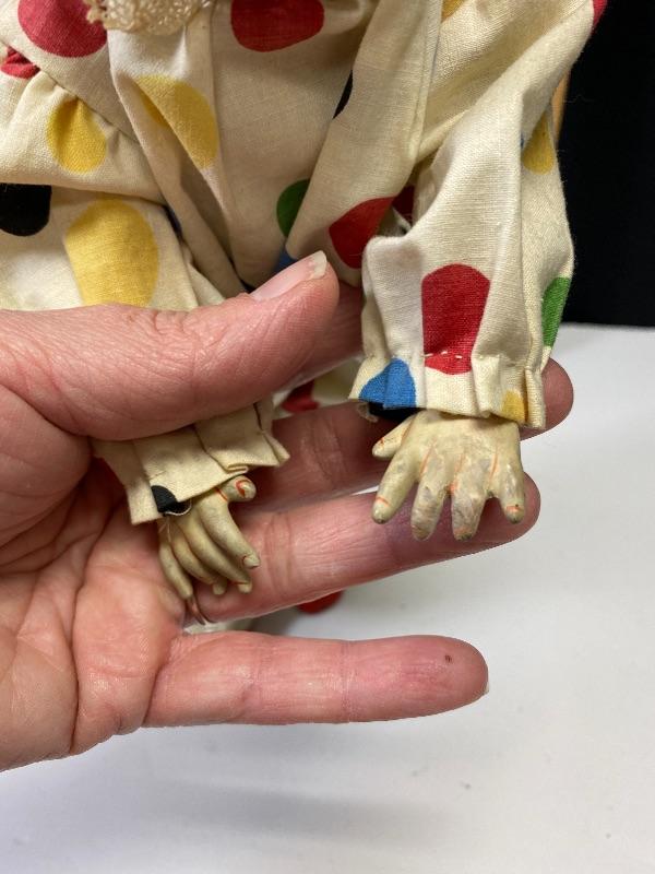 13" classic circus clown doll. Light weight composite, almost like paper mache. Polka Dot outfit. Light wear and discolor to face paint, someone tried to fix his right cheek paint, but in good condition for age. Looks 1940s 1950s.Hands are in ok shape. Legs may have been repainted or touched up.