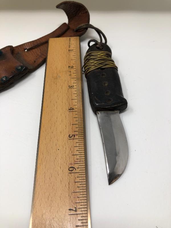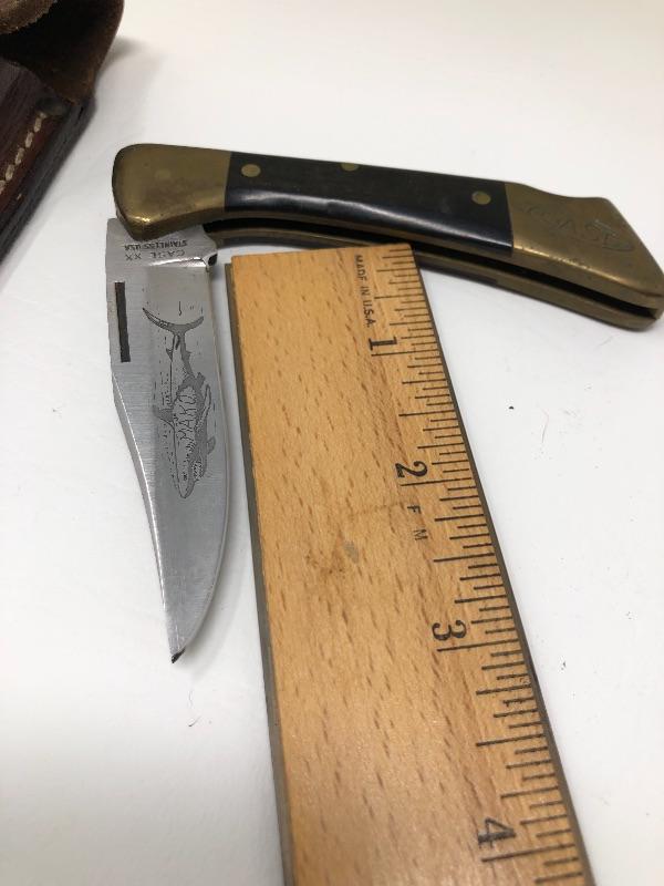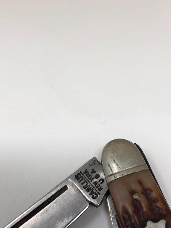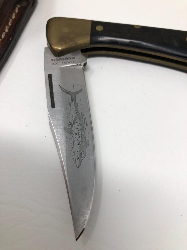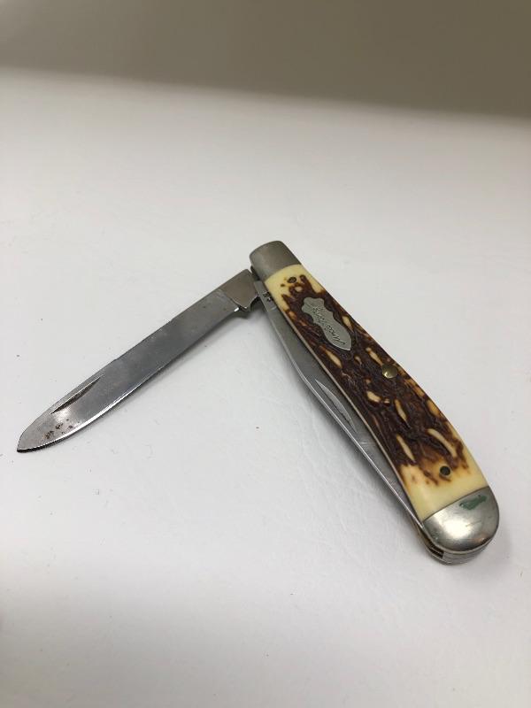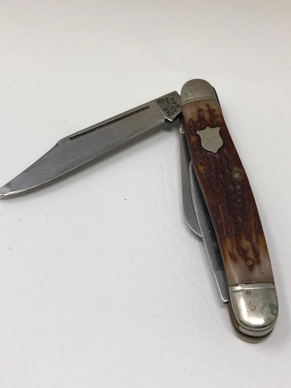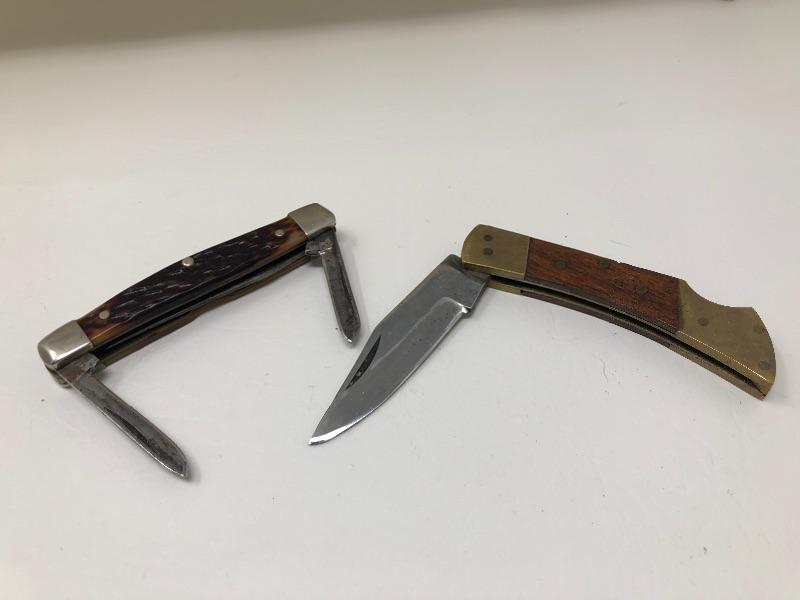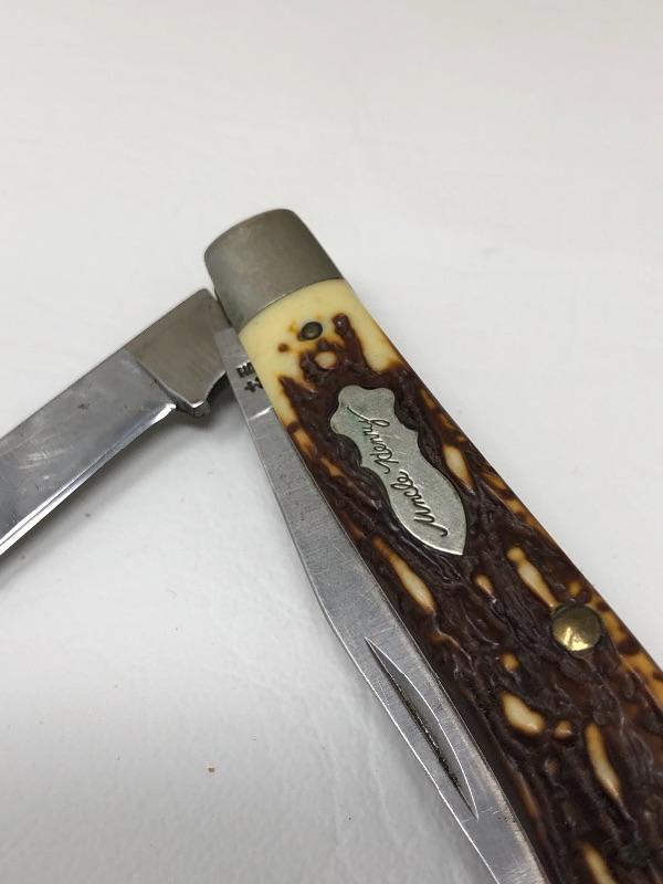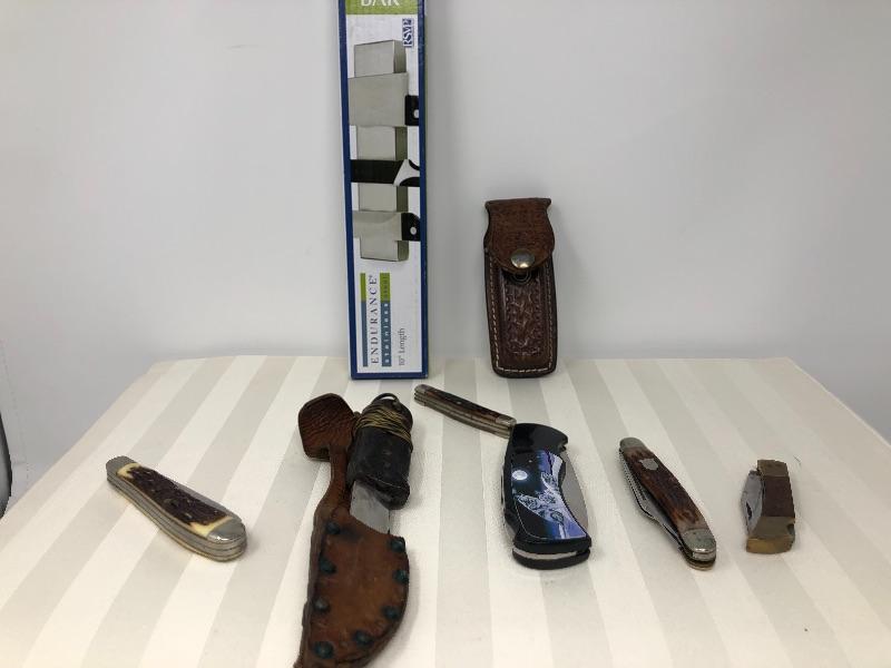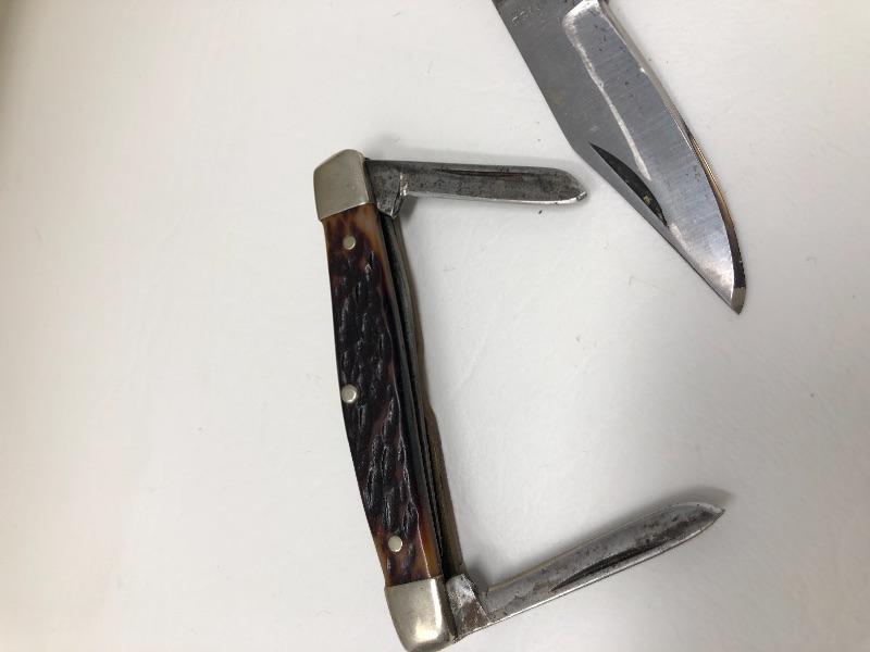 Uncle Henry and other pocket knives, see photos for closeups. The short blade knife is very old and was hand crafted. Sharpener new in box included.