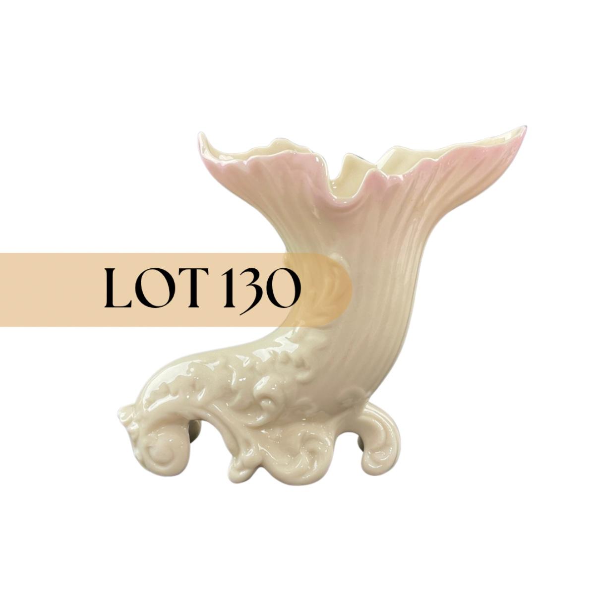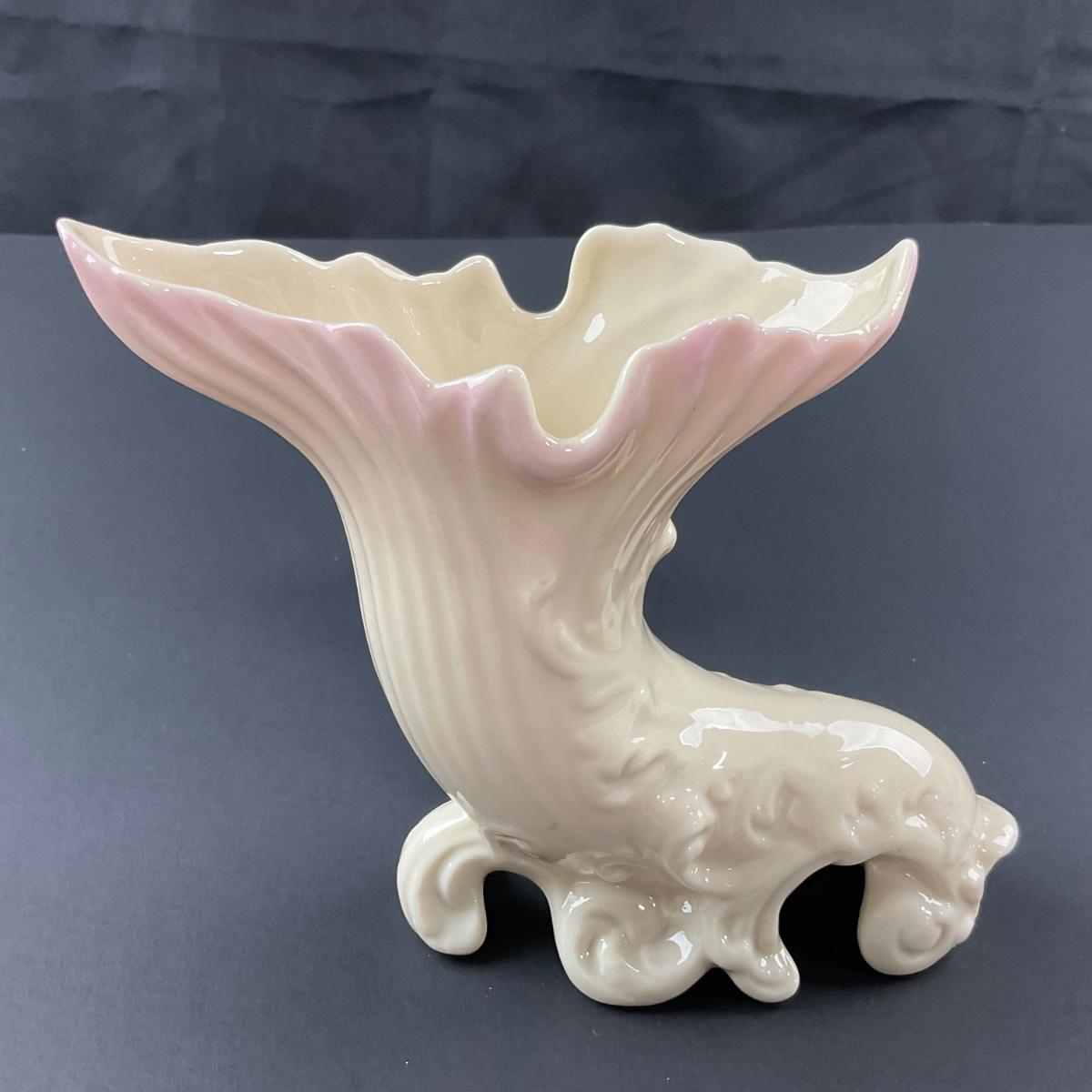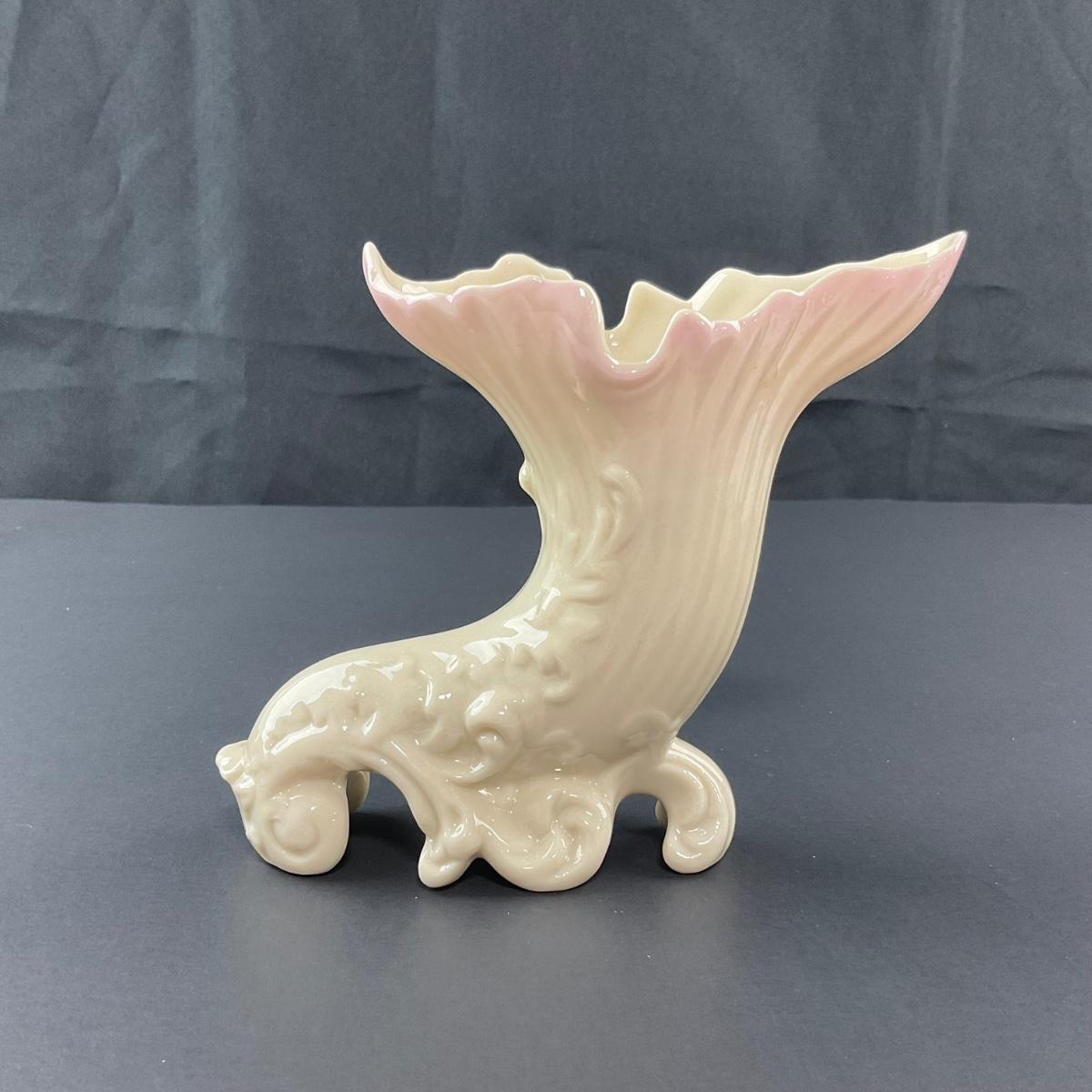 One Belleek Fermanagh cornucopia spill vase with pink. This piece has a 6th mark (1965-1980). This piece has no damage, and appears to be in great shape with no visable chips, cracks, or broken pieces. Please see photos for details and condition. Any condition statement is given as a courtesy to a client, is an opinion, and should not be treated as a statement of fact. Reference to condition written, oral or within a condition report shall not be regarded as a full account of condition and may not include all defects, alterations, or restorations. Absence of a condition report does not imply a lot is flawless or lacking imperfections or damage. Katherine’s Auction & Appraisal Service shall have no responsibility for any error or omission. Returns shall not be accepted on the basis of condition. ::: Shipping is available on this lot. If you require shipping you must let us know at the close of the auction. We will coordinate with you after the item has been won. Shipping fees will include insurance up to or exceeding the value of all items being mailed. If you have any questions regarding this lot please contact the auctioneer either via this website, by direct email or by phone. PICK UP TIMES and other important information can be found in the TERMS and DESCRIPTION of the auction. Please take a look for pertinent information. Thanks!