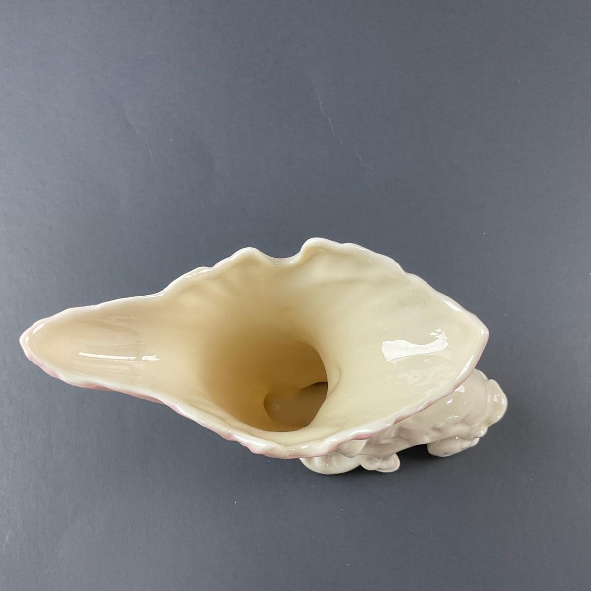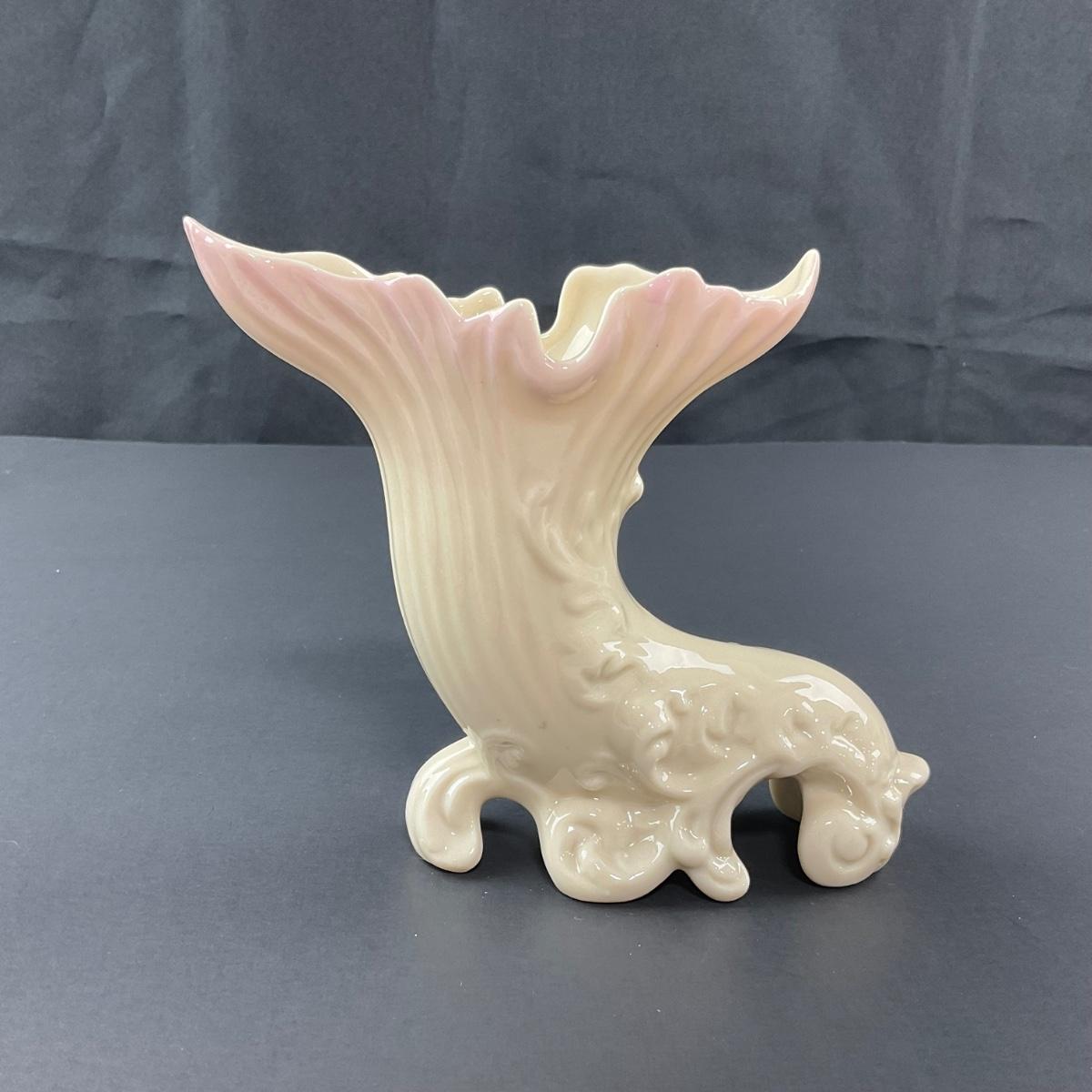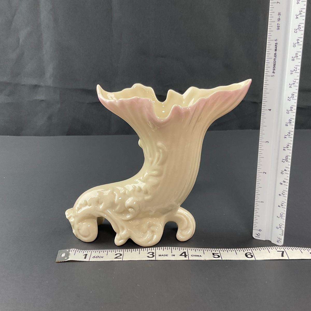 One Belleek Fermanagh cornucopia spill vase with pink. This piece has a 6th mark (1965-1980). This piece has no damage, and appears to be in great shape with no visable chips, cracks, or broken pieces. Please see photos for details and condition. Any condition statement is given as a courtesy to a client, is an opinion, and should not be treated as a statement of fact. Reference to condition written, oral or within a condition report shall not be regarded as a full account of condition and may not include all defects, alterations, or restorations. Absence of a condition report does not imply a lot is flawless or lacking imperfections or damage. Katherine’s Auction & Appraisal Service shall have no responsibility for any error or omission. Returns shall not be accepted on the basis of condition. ::: Shipping is available on this lot. If you require shipping you must let us know at the close of the auction. We will coordinate with you after the item has been won. Shipping fees will include insurance up to or exceeding the value of all items being mailed. If you have any questions regarding this lot please contact the auctioneer either via this website, by direct email or by phone. PICK UP TIMES and other important information can be found in the TERMS and DESCRIPTION of the auction. Please take a look for pertinent information. Thanks!