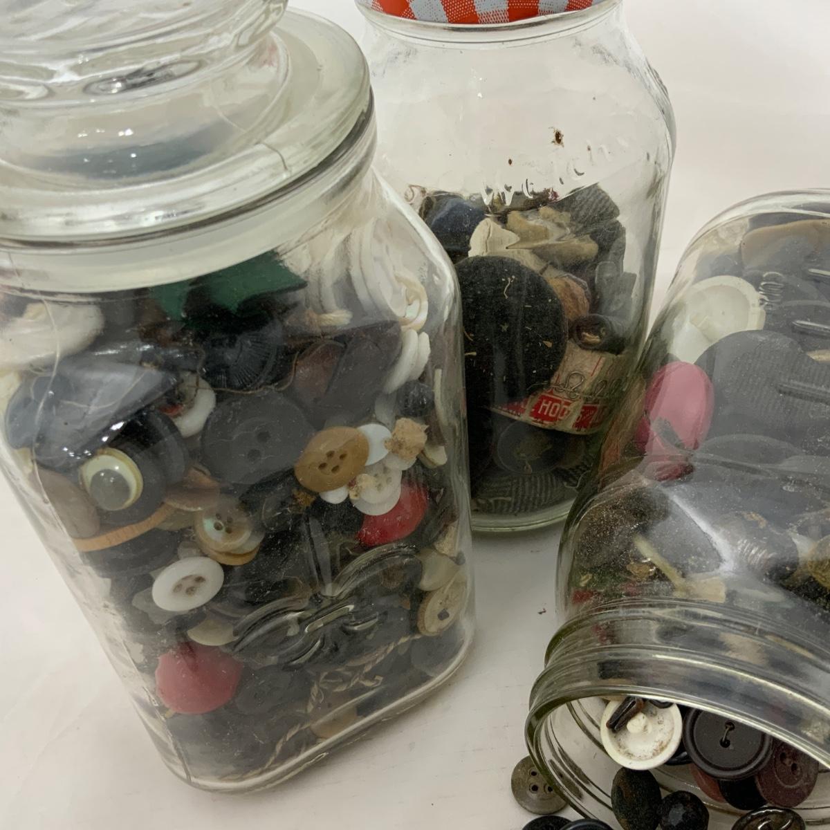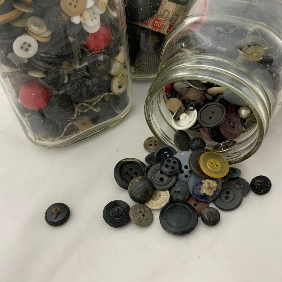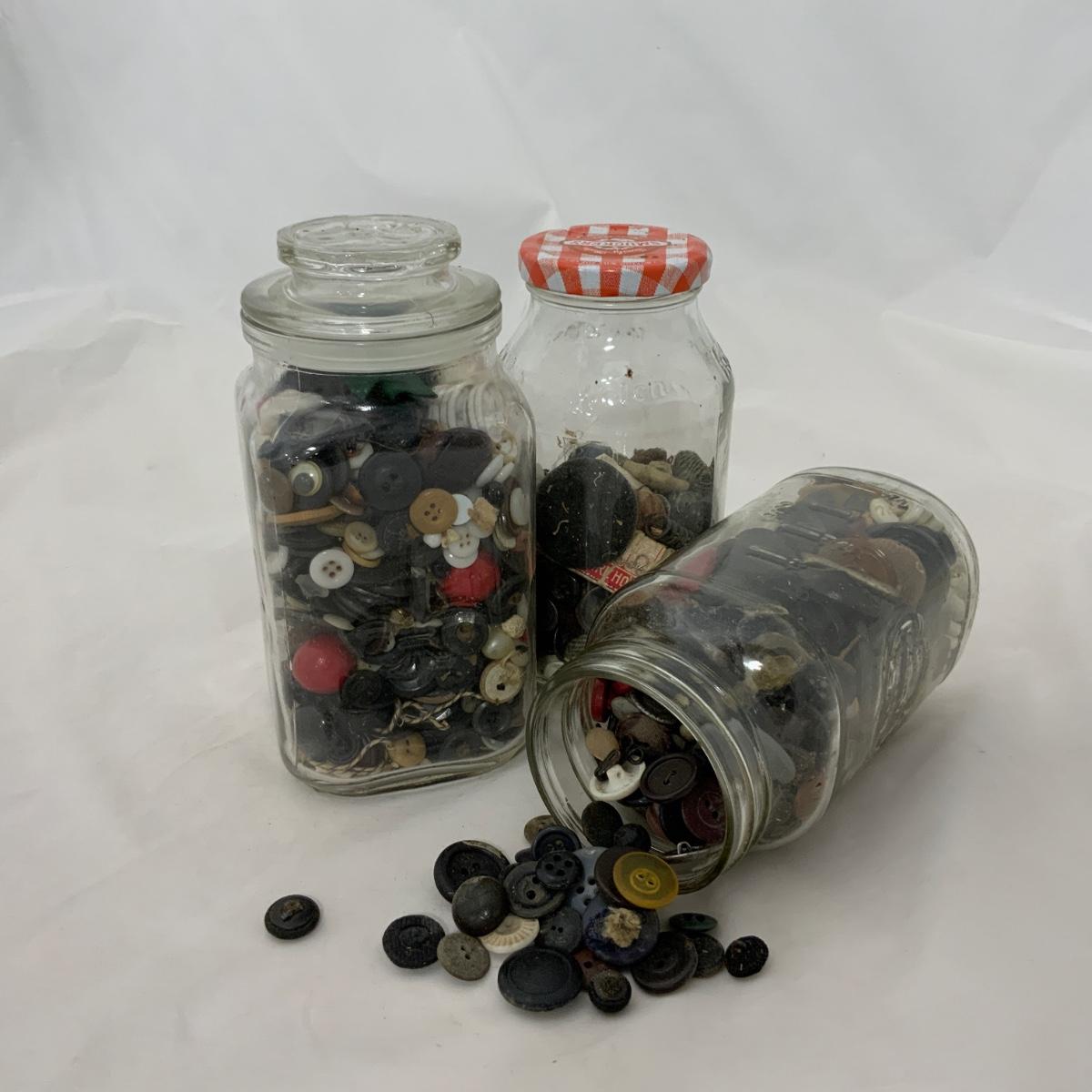 Three Jars of Antique and Vintage Buttons. The jars are newer, the buttons are older. Please see photos for details and condition. ::: Shipping is NOT available on this lot. If you have any questions regarding this lot please contact the auctioneer either via this website, by direct email or by phone. PICK UP TIMES and other important information can be found in the TERMS and DESCRIPTION of the auction. Please take a look for pertinent information. Thanks!