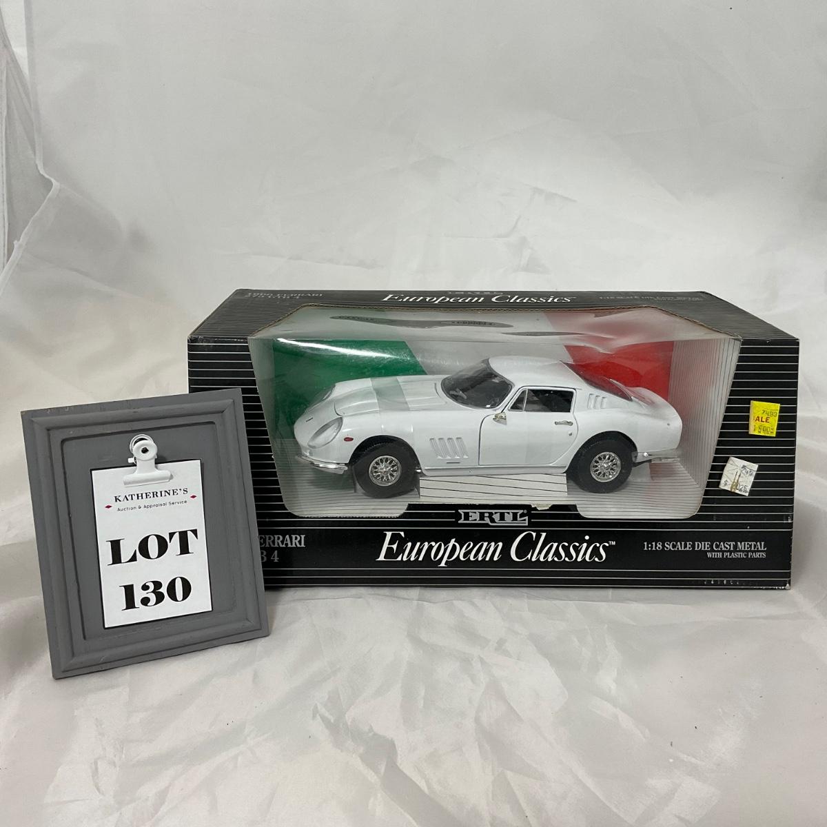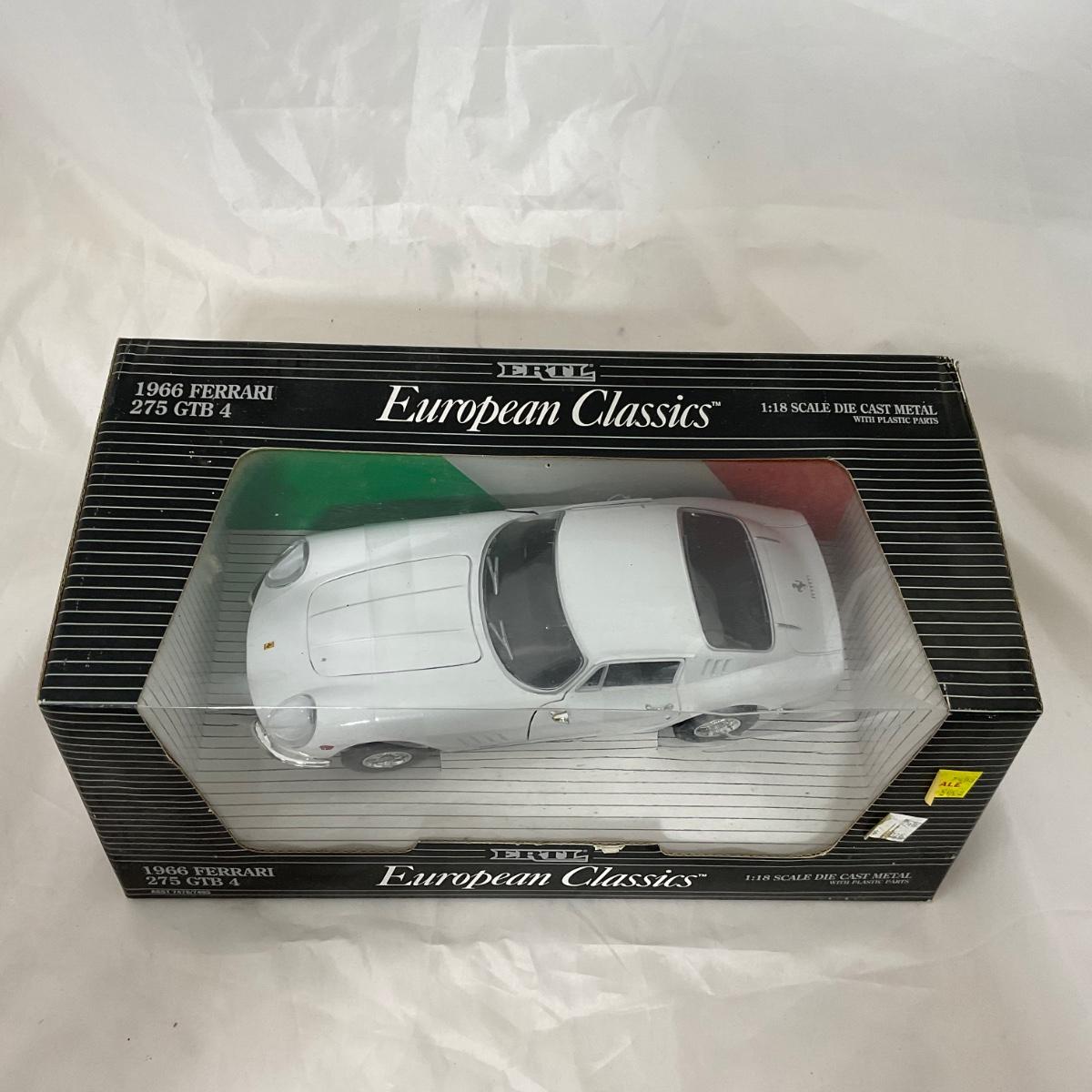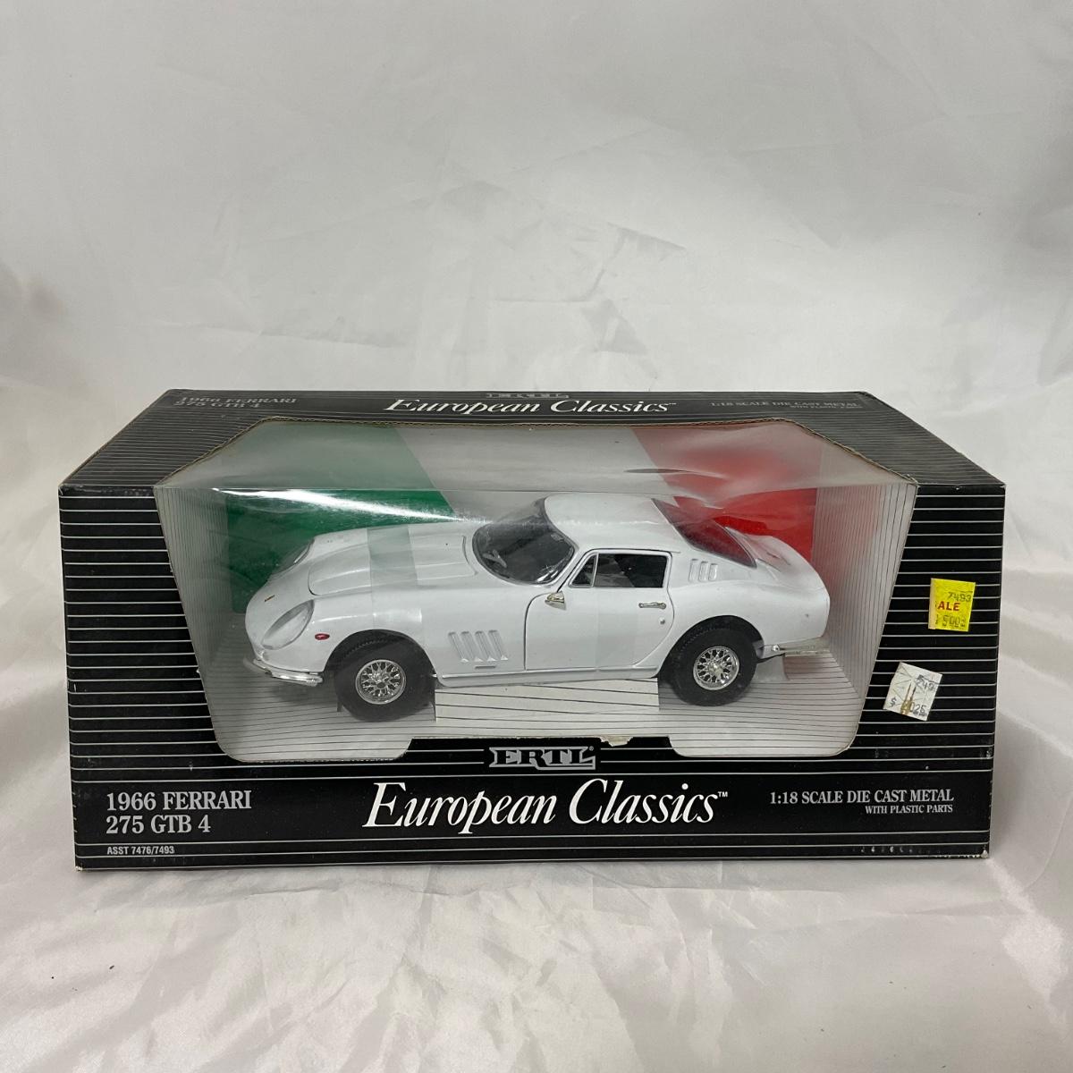One European Classic die cast 1:18 scale 1966 Ferrari 27S GTB4 white in color in box. Please see photos for details and condition. ::: Shipping is available on this lot. If you require shipping you must let us know at the close of the auction. We will coordinate with you after the item has been won. Shipping fees will include insurance up to or exceeding the value of all items being mailed. If you have any questions regarding this lot please contact the auctioneer either via this website, by direct email or by phone. PICK UP TIMES and other important information can be found in the TERMS and DESCRIPTION of the auction. Please take a look for pertinent information. Thanks!