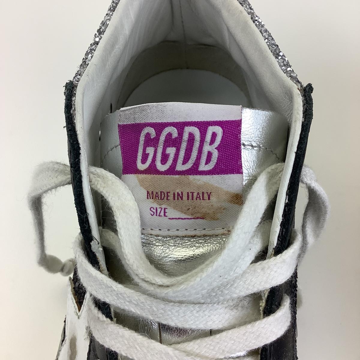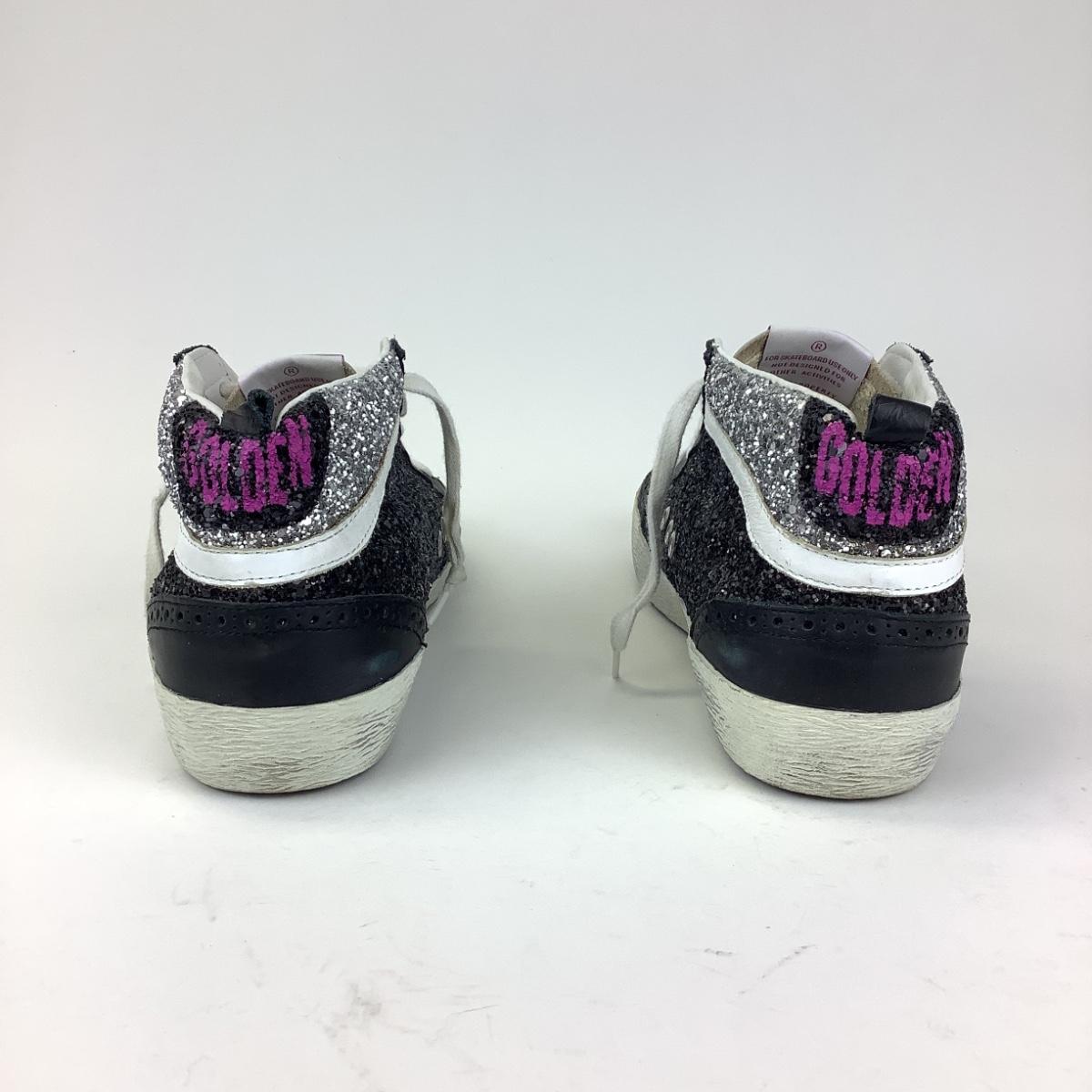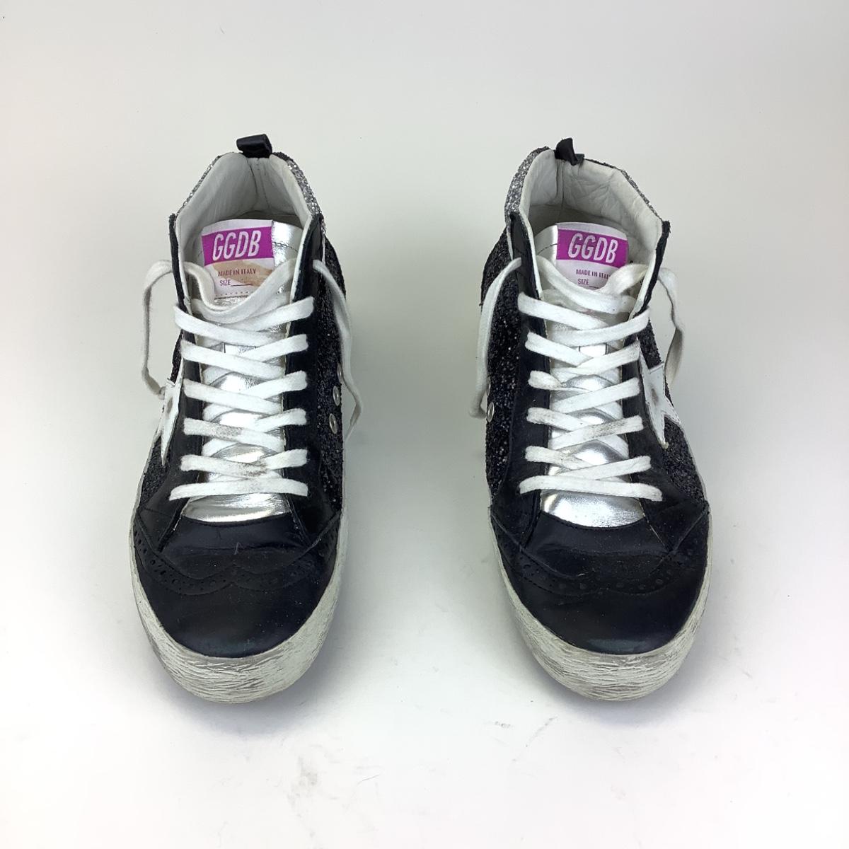 Worn Golden Goose Midstar silver glitter heel, black and white suede, made in Venice, Italy.