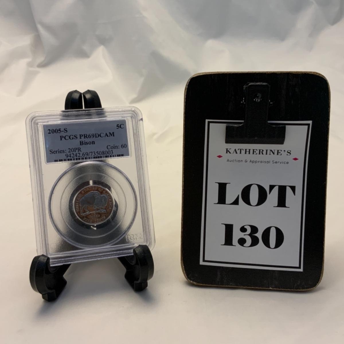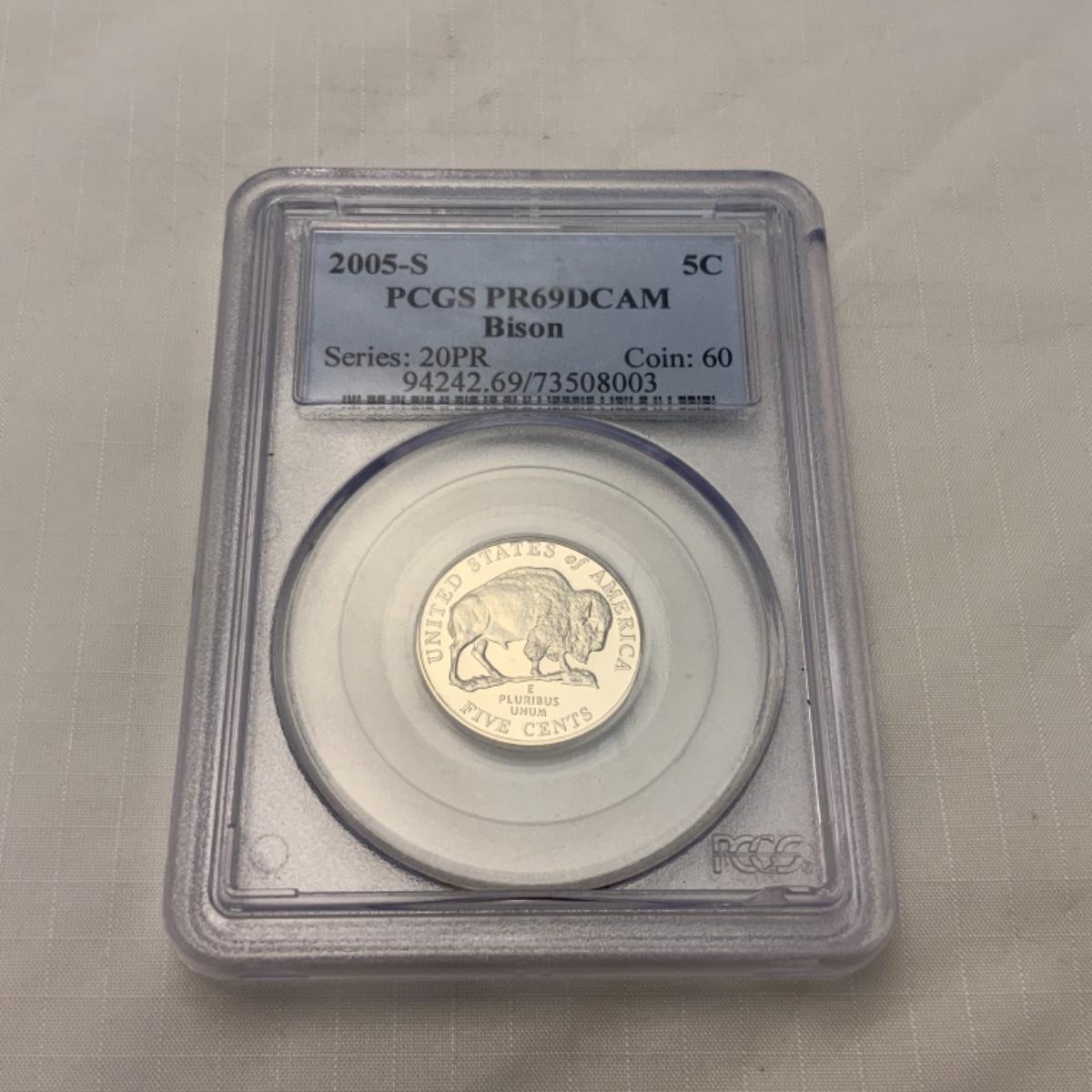 Graded 2005 S Bison Nickel. Graded PR 69 by PCGS. Please see photos for details and condition. ::: Shipping is available on this lot. If you require shipping you must let us know at the close of the auction. We will coordinate with you after the item has been won. Shipping fees will include insurance up to or exceeding the value of all items being mailed. If you have any questions regarding this lot please contact the auctioneer either via this website, by direct email or by phone. PICK UP TIMES and other important information can be found in the TERMS and DESCRIPTION of the auction. Please take a look for pertinent information. Thanks!