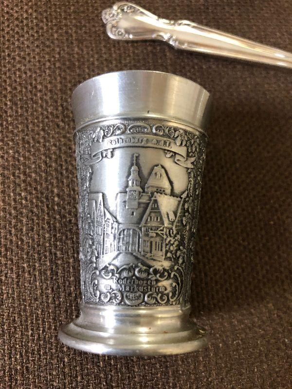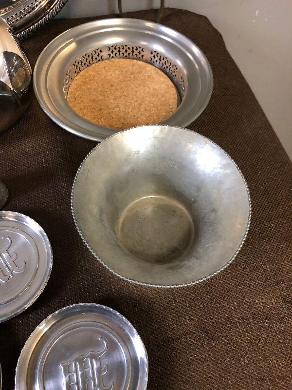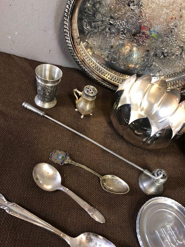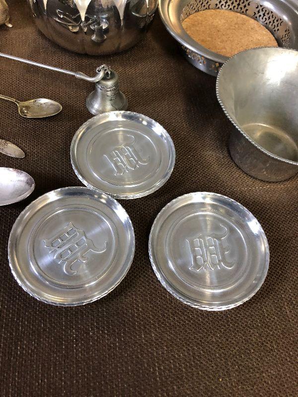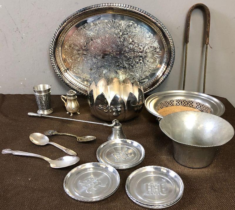 Aluminum, Silver Plated, Pewter: Candle Snuffer, Spoons, tray Coasters and ice tongs cup etc.