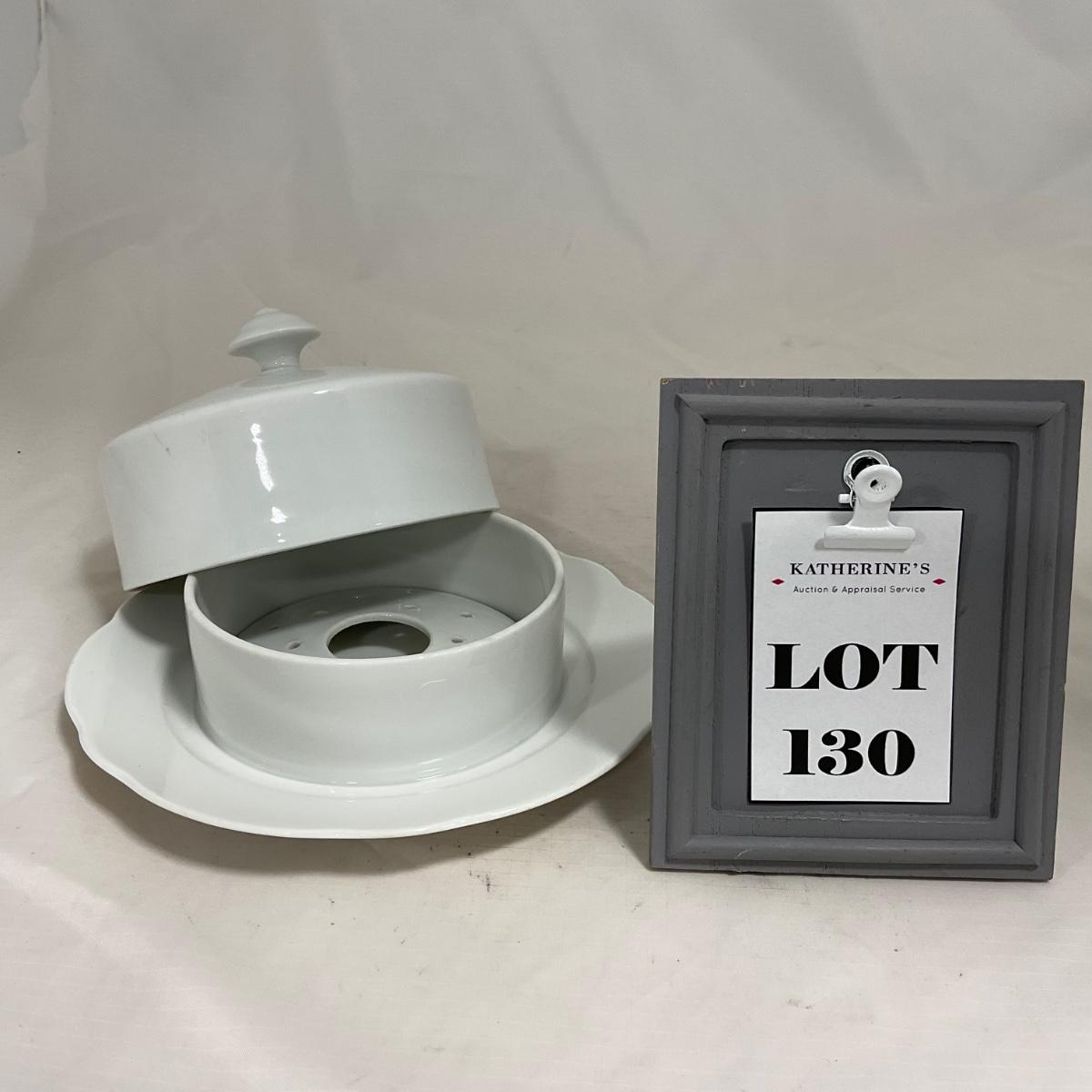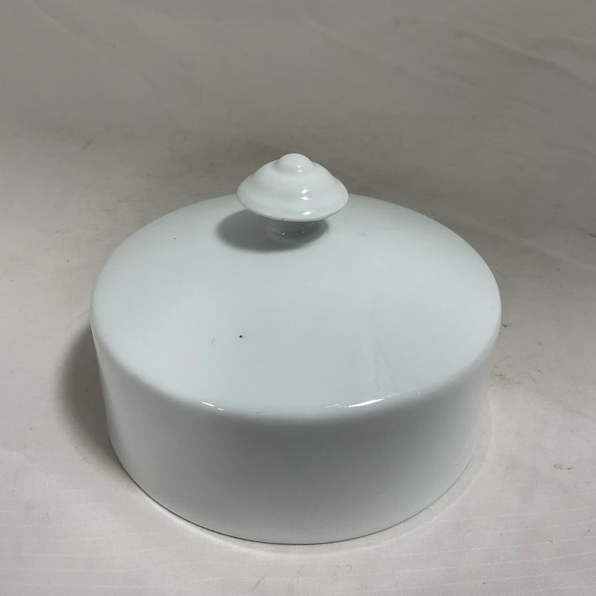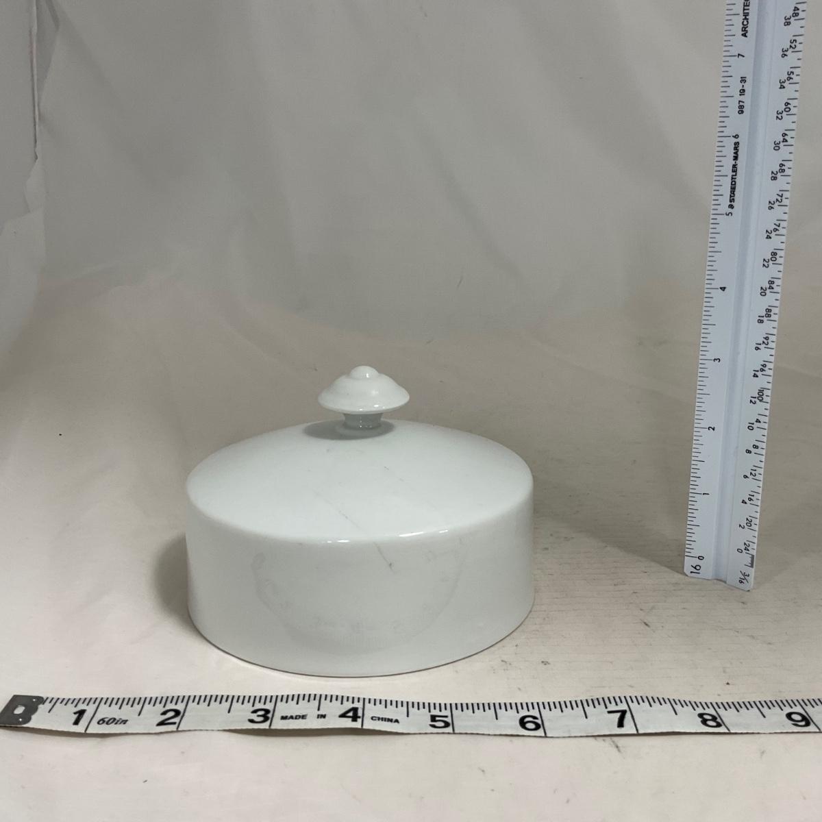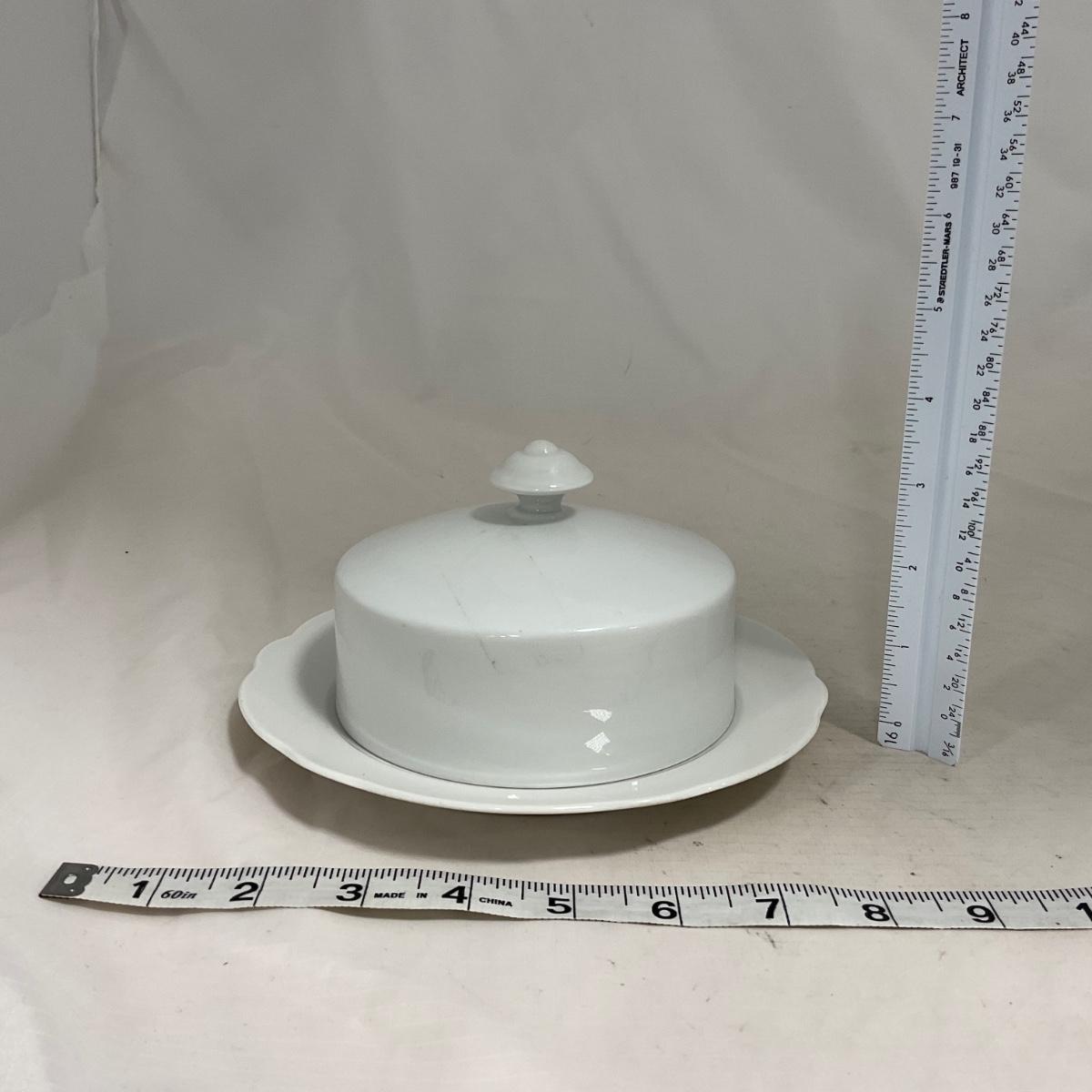 One classic white colored covered butter dish with insert. Unmarked. Please see photos for details and condition. ::: Shipping is available on this lot. If you require shipping you must let us know at the close of the auction. We will coordinate with you after the item has been won. Shipping fees will include insurance up to or exceeding the value of all items being mailed. If you have any questions regarding this lot please contact the auctioneer either via this website, by direct email or by phone. PICK UP TIMES and other important information can be found in the TERMS and DESCRIPTION of the auction. Please take a look for pertinent information. Thanks!