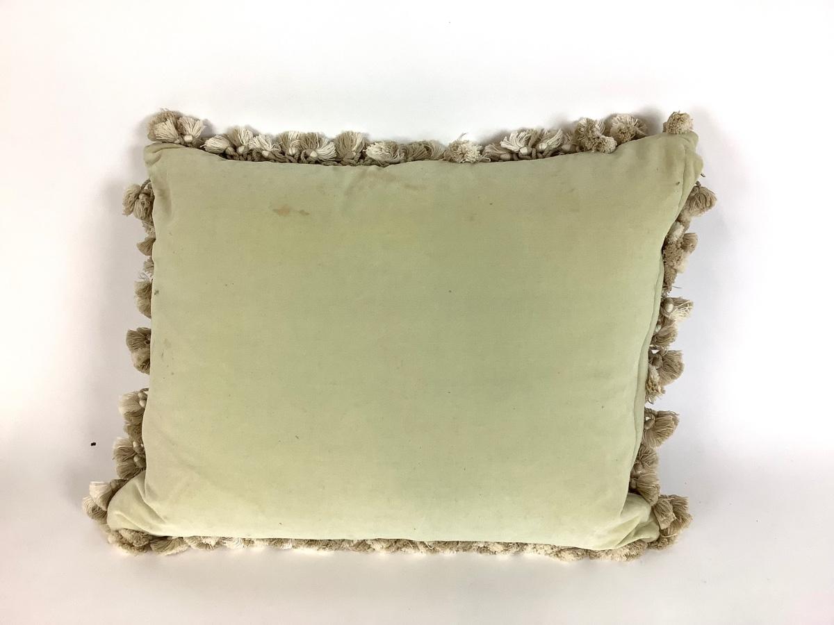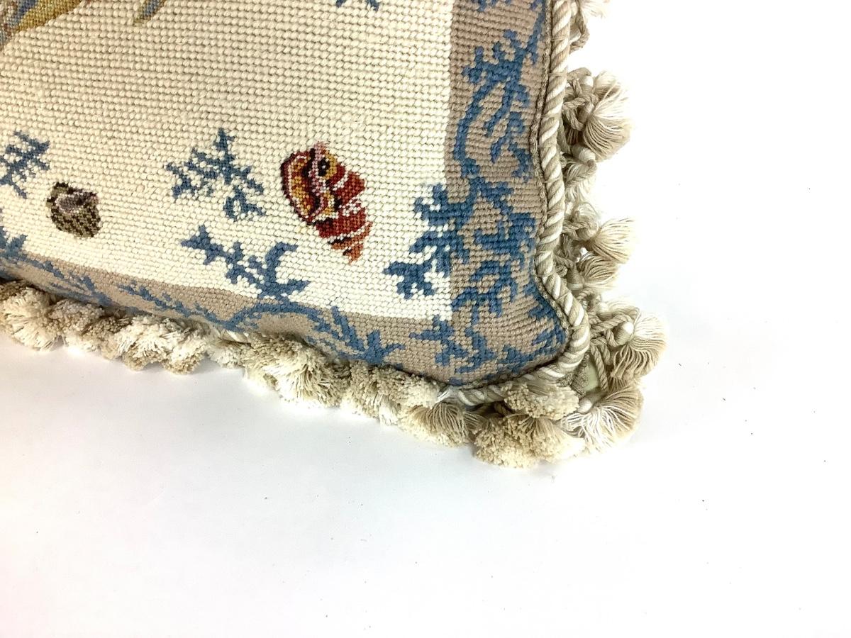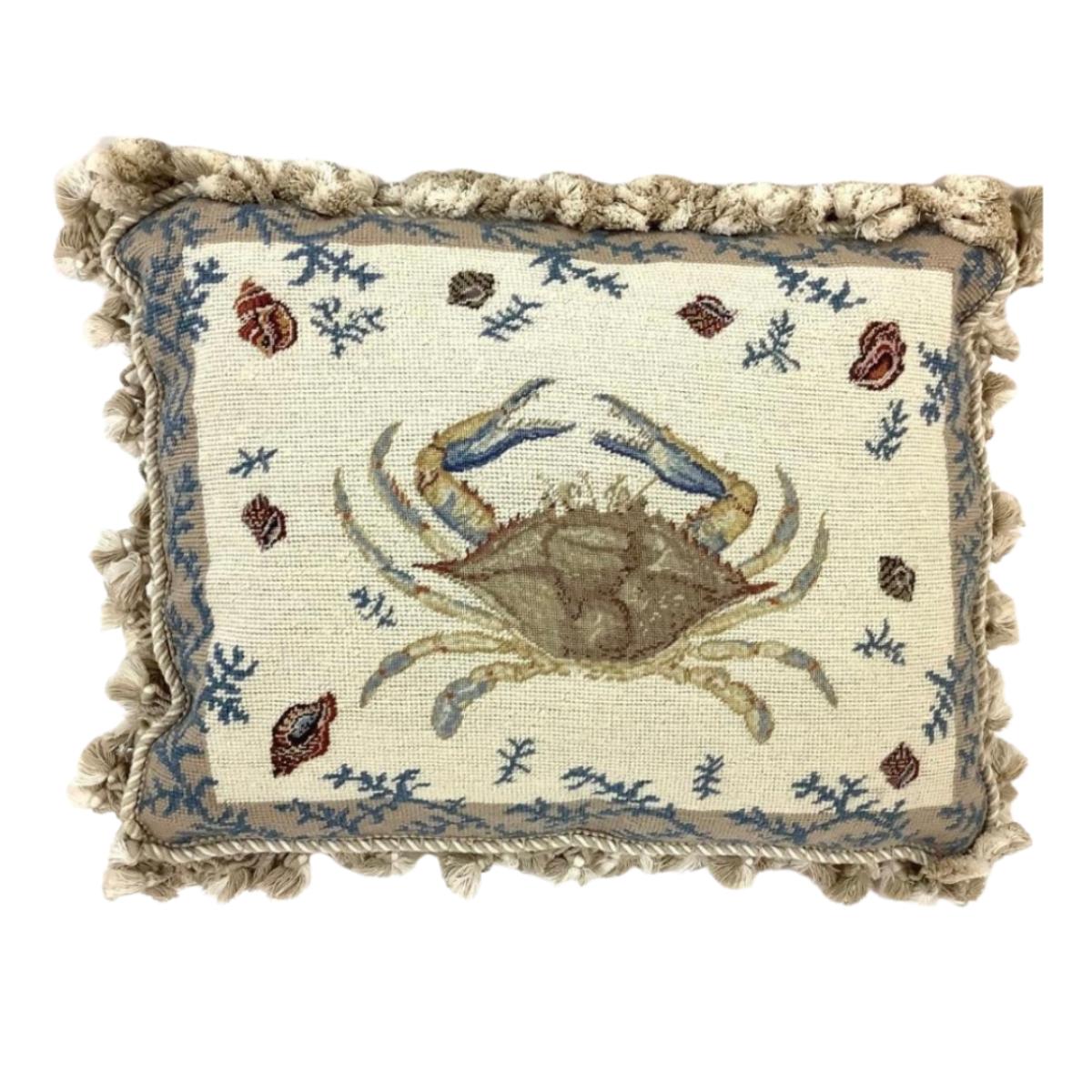 Blue crab needlepoint throw pillow with tassel edge and green back. Pillow is 14" high x 19.5" wide. Pillow cover has zipper closure and pillow insert. There are a few spots of discoloration on the back.