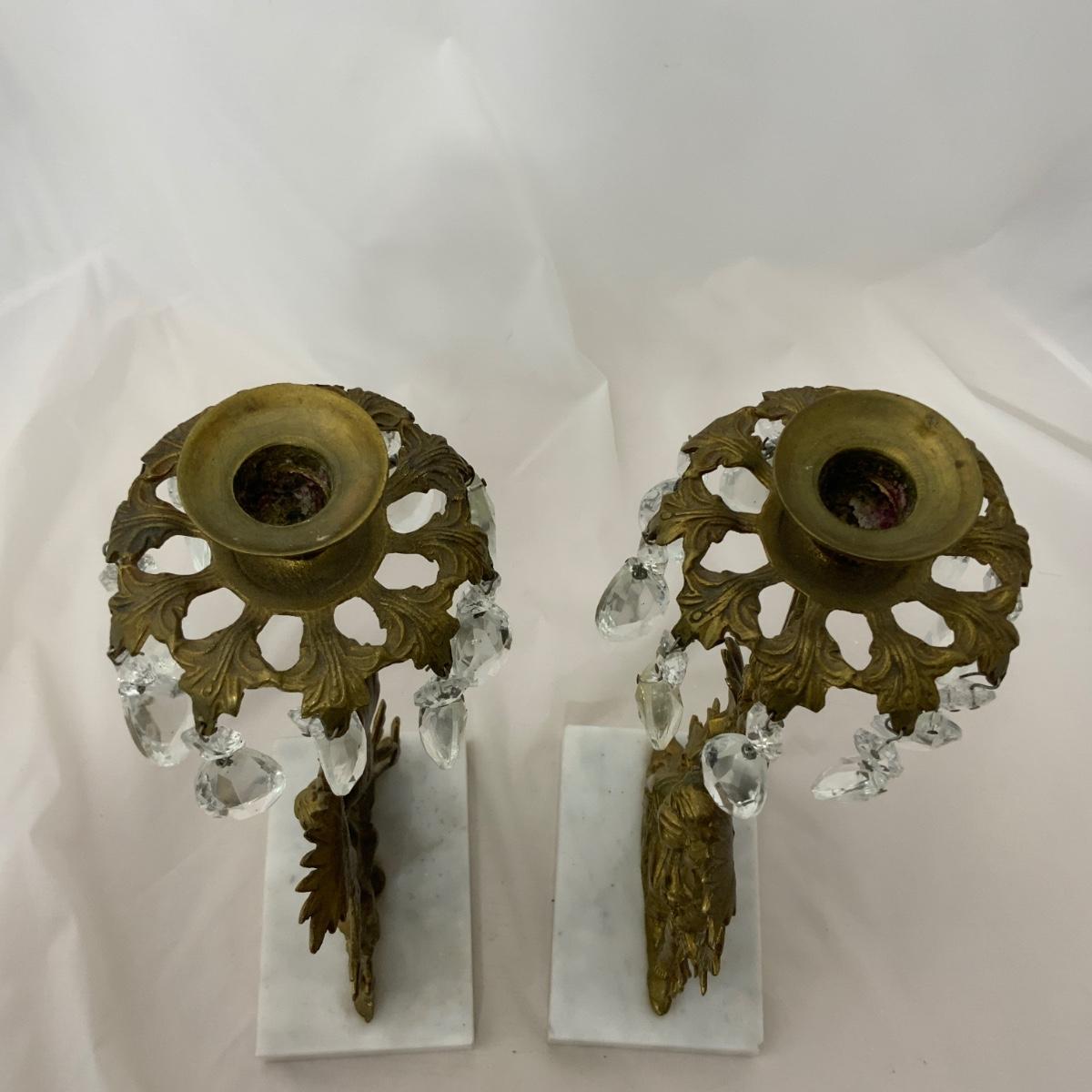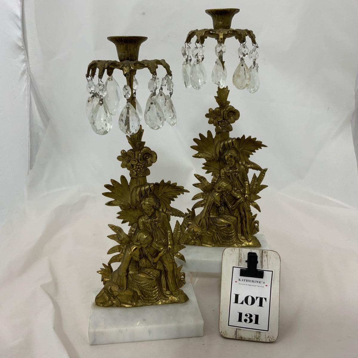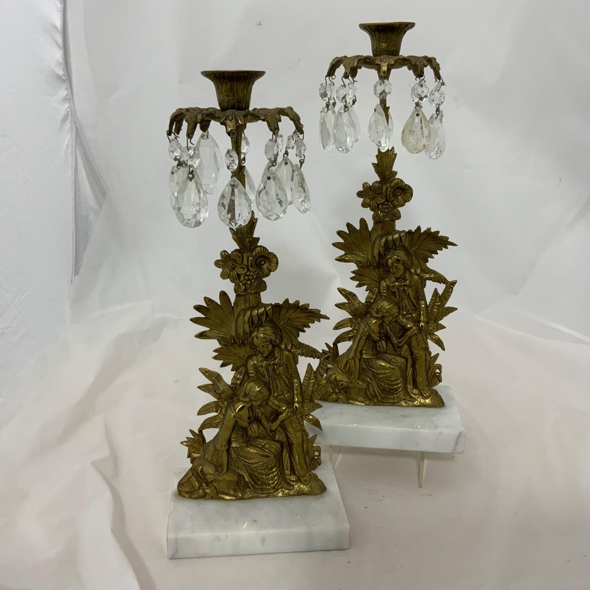 Beautiful Set of Brass and Marble Girandoles, or Candlesticks, as my grandmother used to call them. These are in impressive condition with matching crystals. These will certainly impress all your friends. Each measure 15 inches tall. Please see photos for details and condition. ::: Shipping is available on this lot. If you require shipping you must let us know at the close of the auction. We will coordinate with you after the item has been won. Shipping fees will include insurance up to or exceeding the value of all items being mailed. If you have any questions regarding this lot please contact the auctioneer either via this website, by direct email or by phone. PICK UP TIMES and other important information can be found in the TERMS and DESCRIPTION of the auction. Please take a look for pertinent information. Thanks!