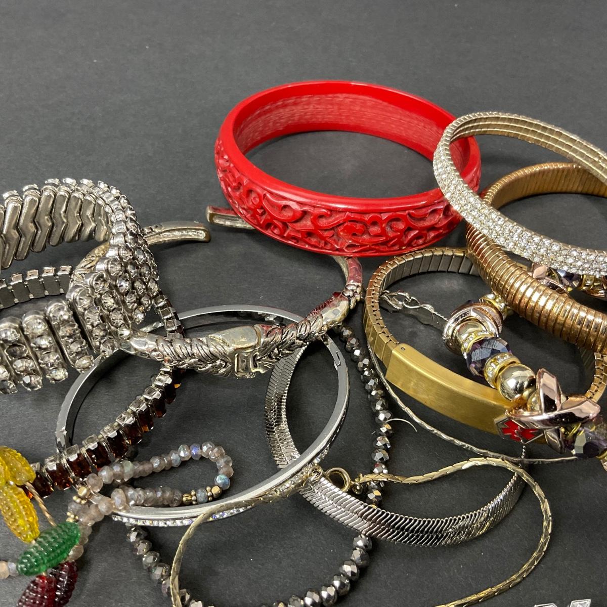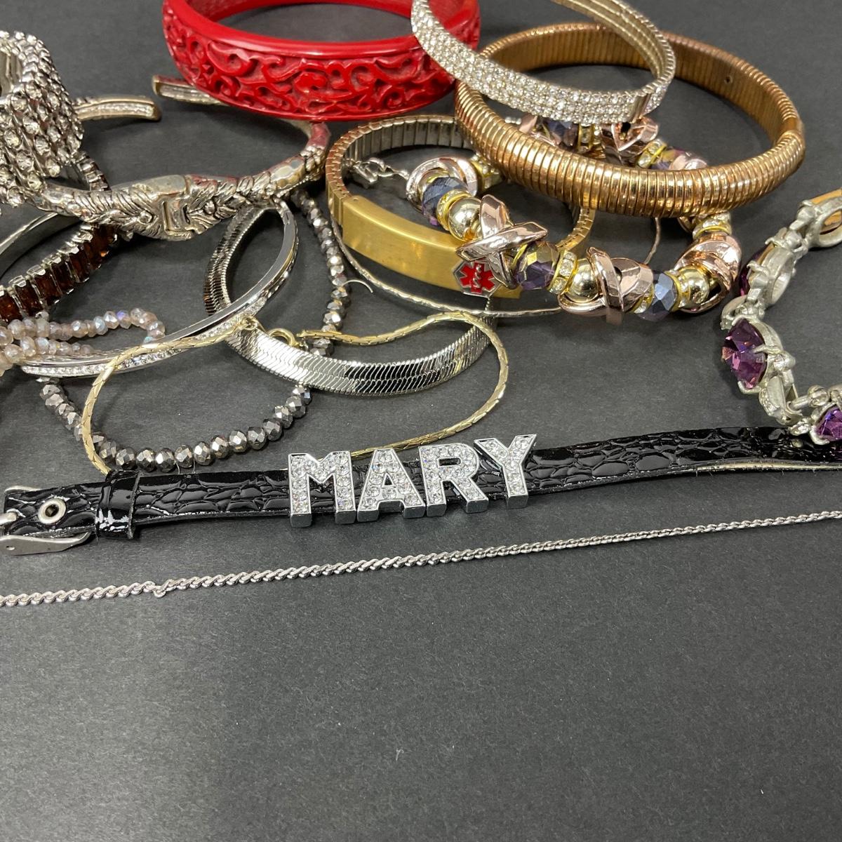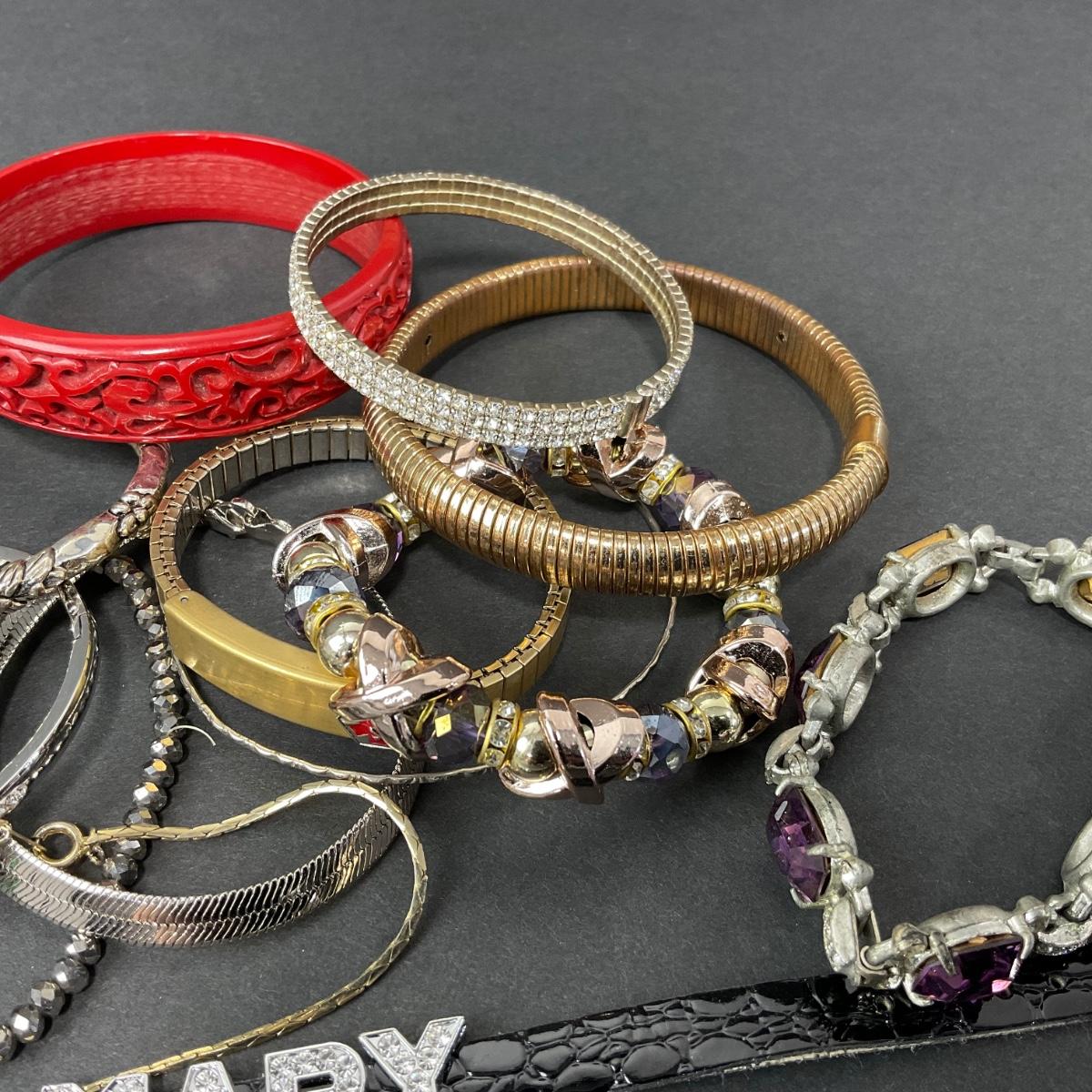 One large lot of assorted costume jewelry bracelets. Please see photos for details and condition. Any condition statement is given as a courtesy to a client, is an opinion, and should not be treated as a statement of fact. Reference to condition written, oral or within a condition report shall not be regarded as a full account of condition and may not include all defects, alterations, or restorations. Absence of a condition report does not imply a lot is flawless or lacking imperfections or damage. Katherine’s Auction & Appraisal Service shall have no responsibility for any error or omission. Returns shall not be accepted on the basis of condition. ::: Shipping is available on this lot. If you require shipping you must let us know at the close of the auction. We will coordinate with you after the item has been won. Shipping fees will include insurance up to or exceeding the value of all items being mailed. If you have any questions regarding this lot please contact the auctioneer either via this website, by direct email or by phone. PICK UP TIMES and other important information can be found in the TERMS and DESCRIPTION of the auction. Please take a look for pertinent information. Thanks!