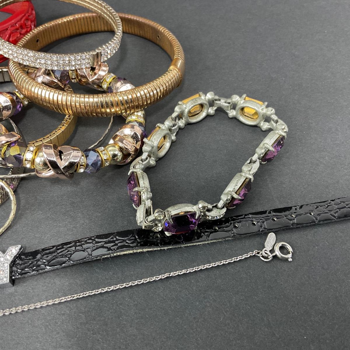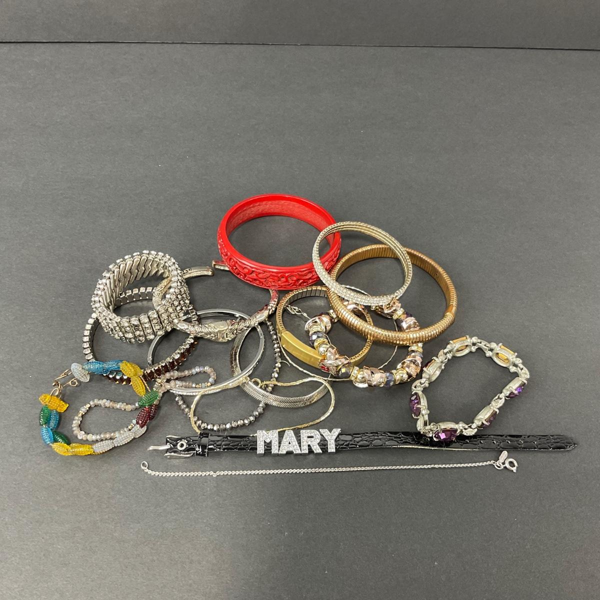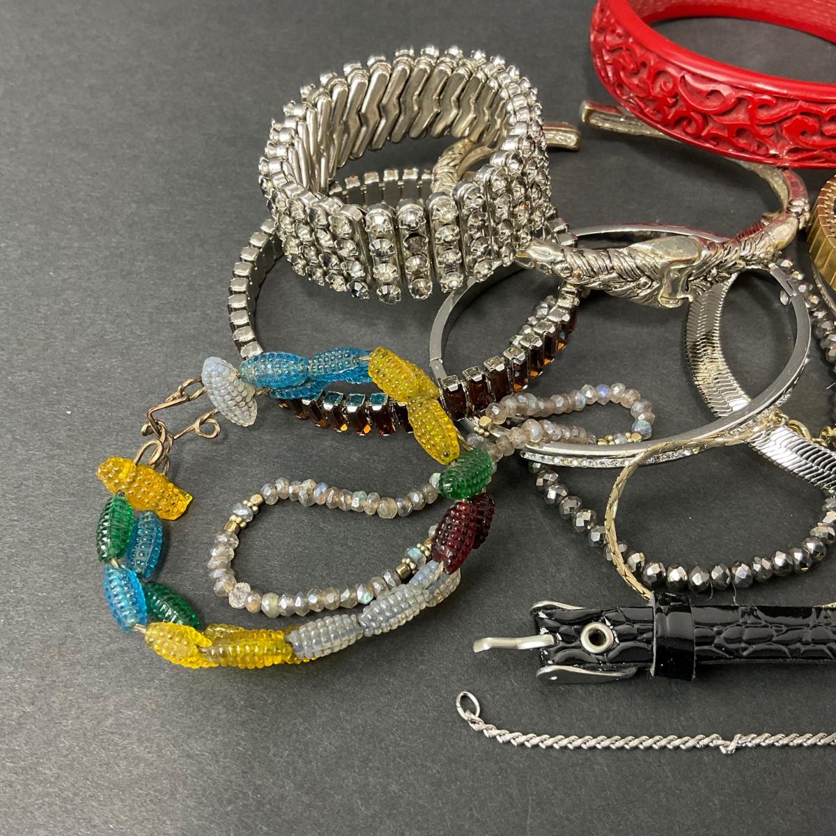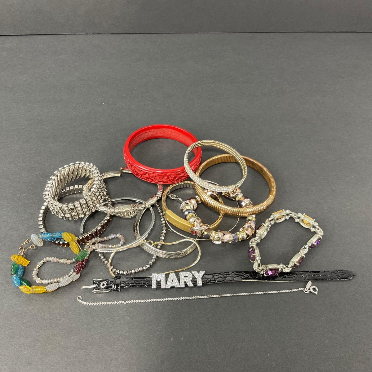 One large lot of assorted costume jewelry bracelets. Please see photos for details and condition. Any condition statement is given as a courtesy to a client, is an opinion, and should not be treated as a statement of fact. Reference to condition written, oral or within a condition report shall not be regarded as a full account of condition and may not include all defects, alterations, or restorations. Absence of a condition report does not imply a lot is flawless or lacking imperfections or damage. Katherine’s Auction & Appraisal Service shall have no responsibility for any error or omission. Returns shall not be accepted on the basis of condition. ::: Shipping is available on this lot. If you require shipping you must let us know at the close of the auction. We will coordinate with you after the item has been won. Shipping fees will include insurance up to or exceeding the value of all items being mailed. If you have any questions regarding this lot please contact the auctioneer either via this website, by direct email or by phone. PICK UP TIMES and other important information can be found in the TERMS and DESCRIPTION of the auction. Please take a look for pertinent information. Thanks!