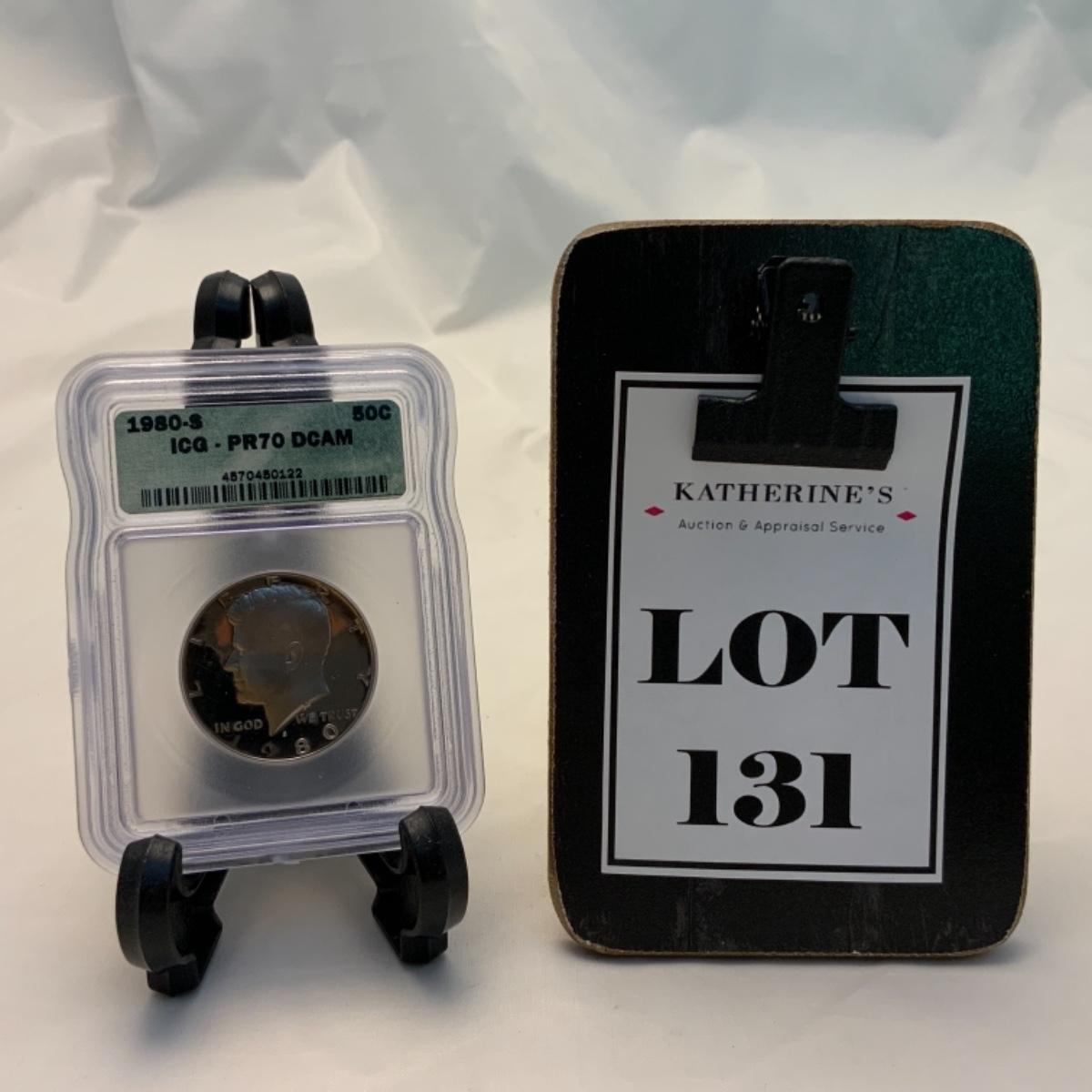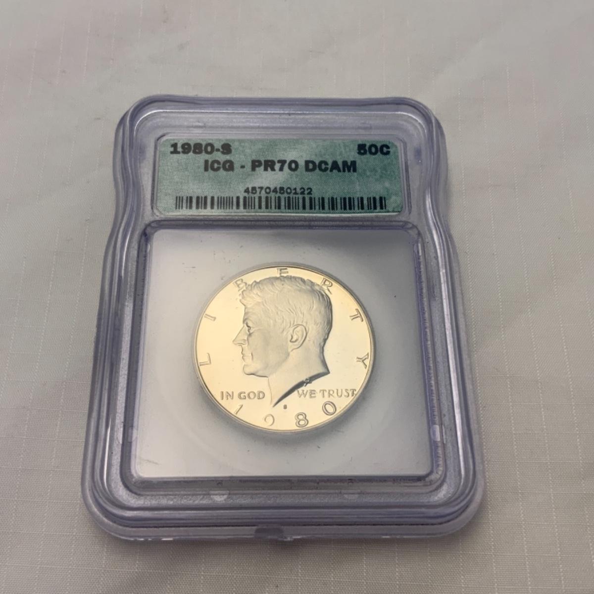 Graded Kennedy Half Dollar, 1980 S. Graded by ICG at PR 70. Please see photos for details and condition. ::: Shipping is available on this lot. If you require shipping you must let us know at the close of the auction. We will coordinate with you after the item has been won. Shipping fees will include insurance up to or exceeding the value of all items being mailed. If you have any questions regarding this lot please contact the auctioneer either via this website, by direct email or by phone. PICK UP TIMES and other important information can be found in the TERMS and DESCRIPTION of the auction. Please take a look for pertinent information. Thanks!