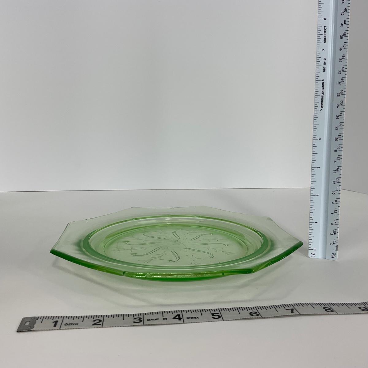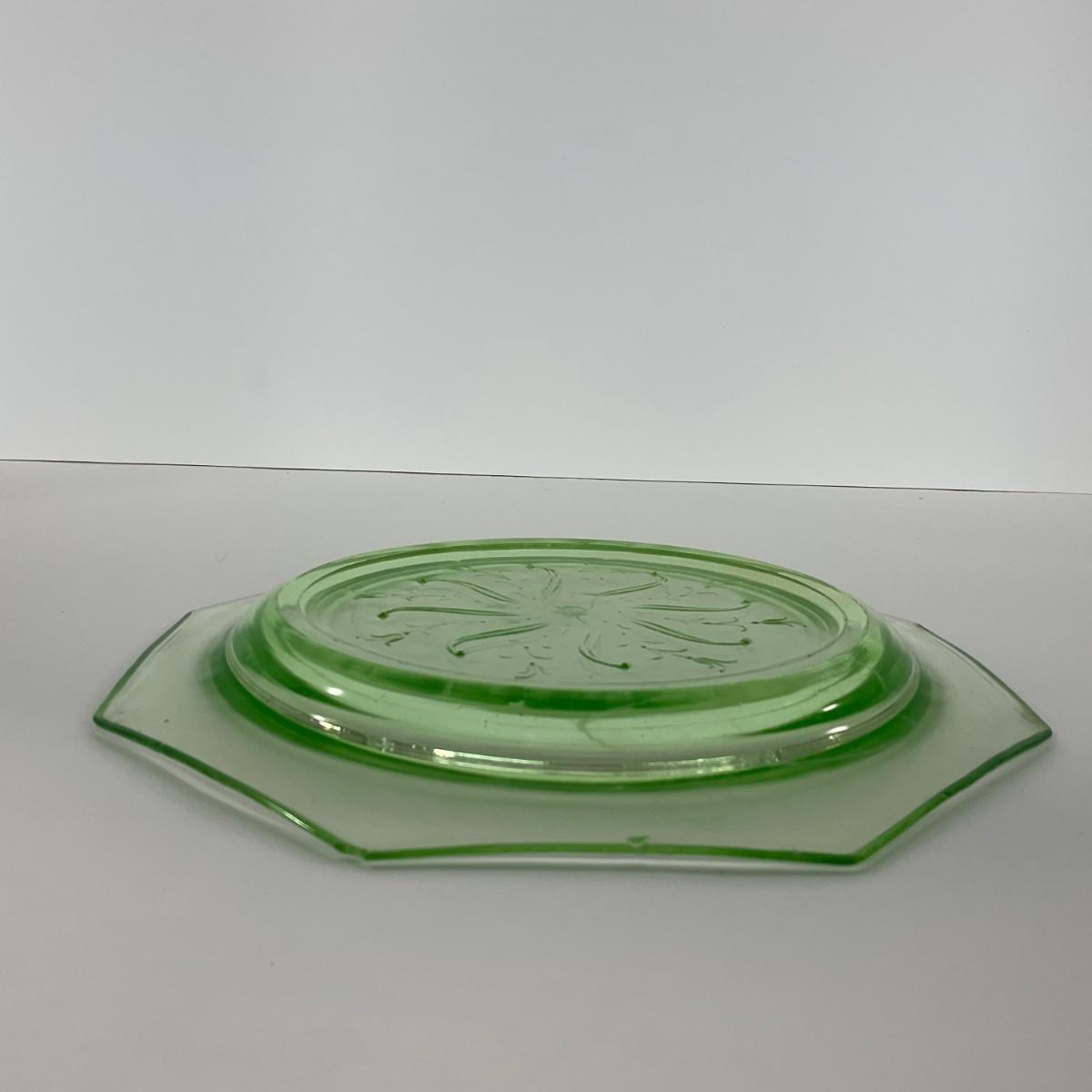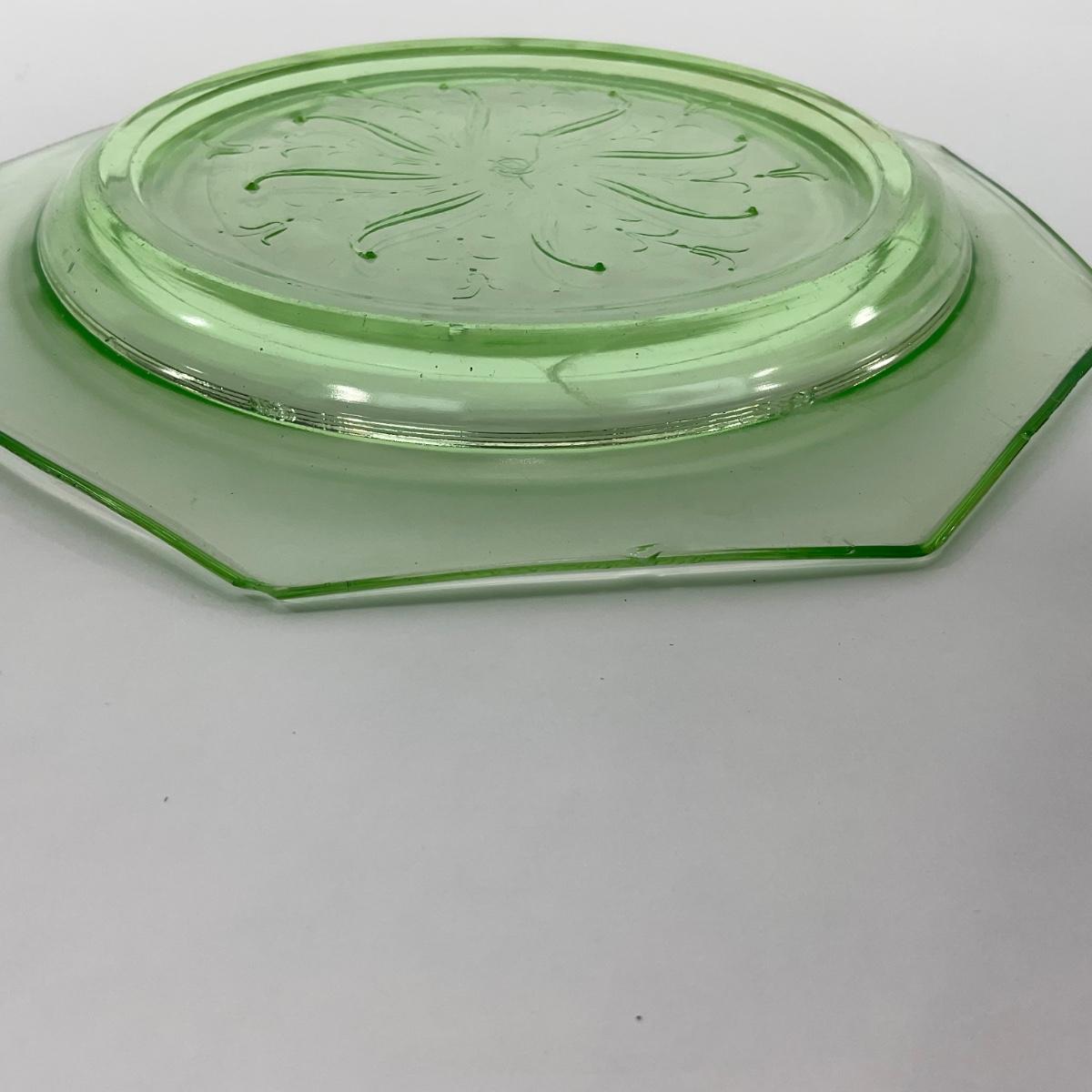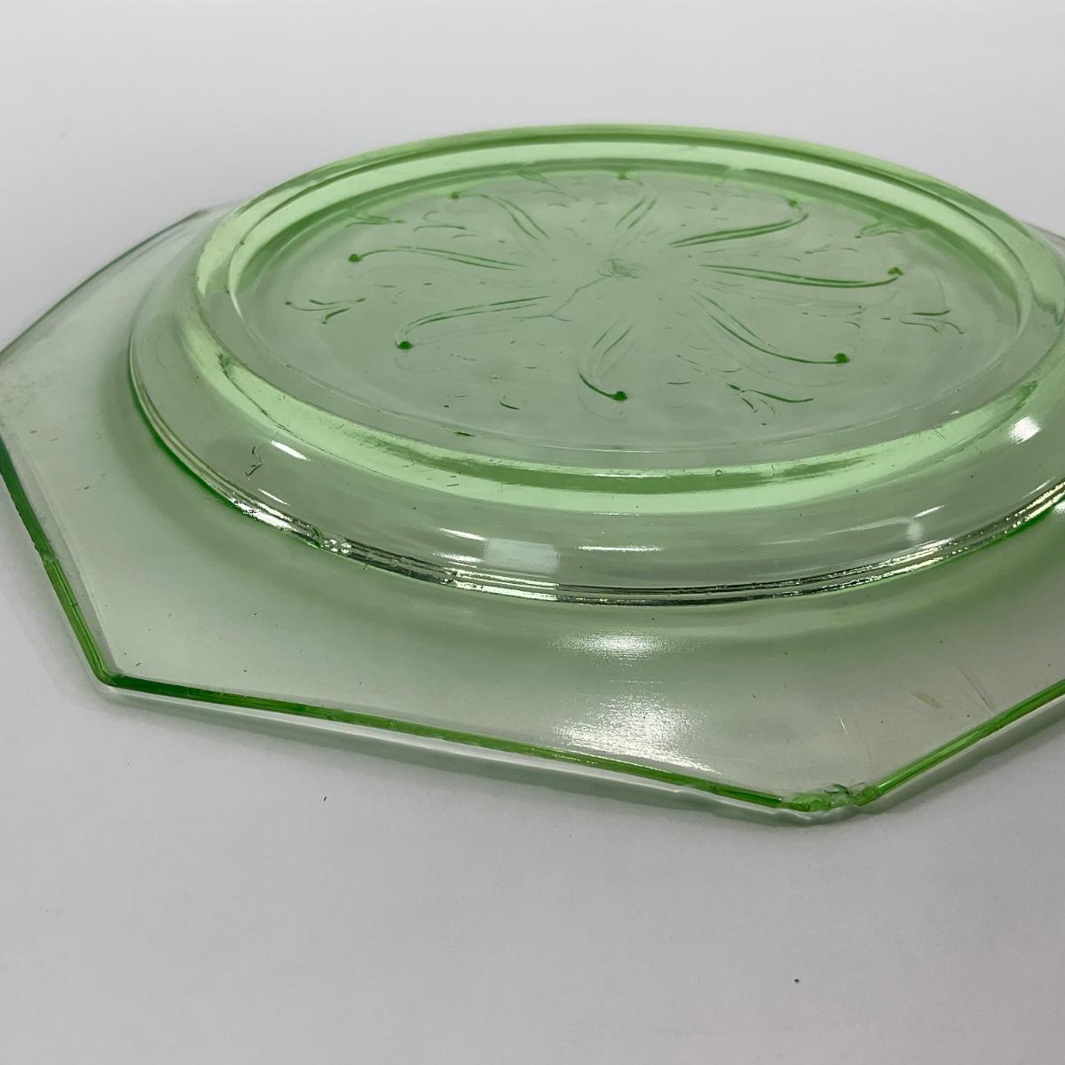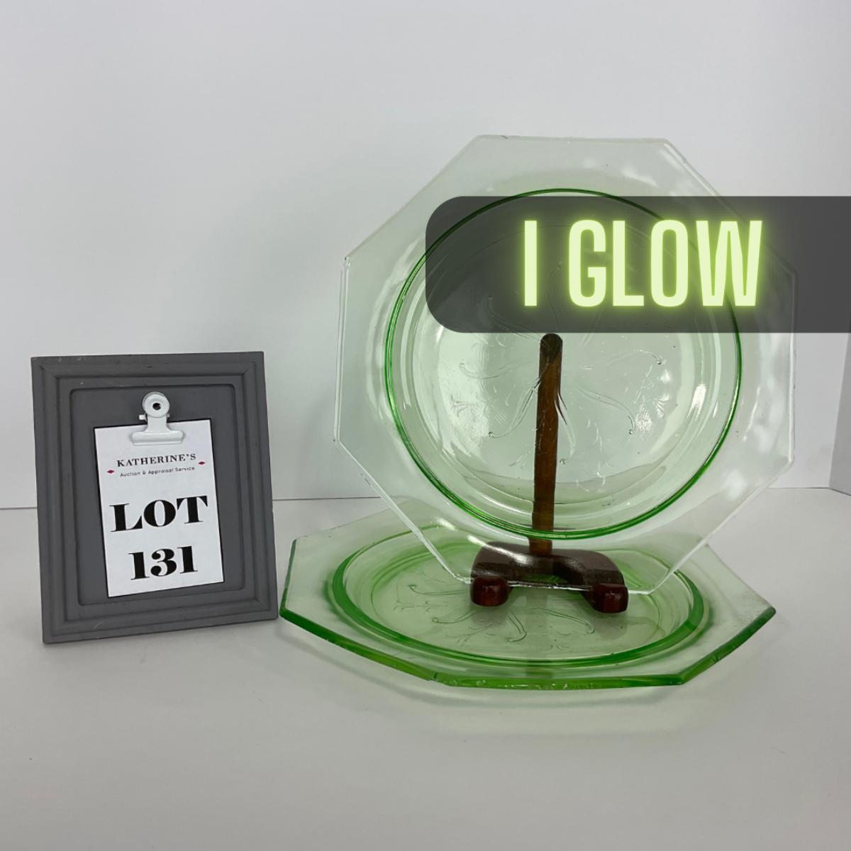 Two green depression glass trays with design. Both pieces have quite a few chips and damage. I am Uranium glass so I DO GLOW under blacklight. Please see photos for details and condition. ::: Shipping is available on this lot. If you require shipping you must let us know at the close of the auction. We will coordinate with you after the item has been won. Shipping fees will include insurance up to or exceeding the value of all items being mailed. If you have any questions regarding this lot please contact the auctioneer either via this website, by direct email or by phone. PICK UP TIMES and other important information can be found in the TERMS and DESCRIPTION of the auction. Please take a look for pertinent information. Thanks!