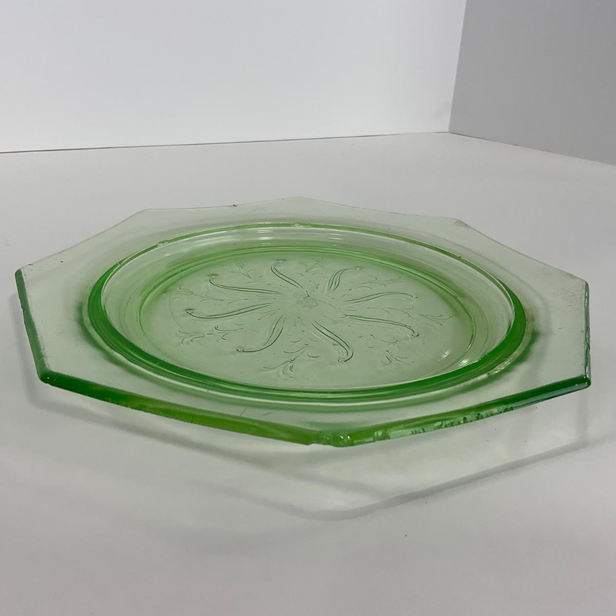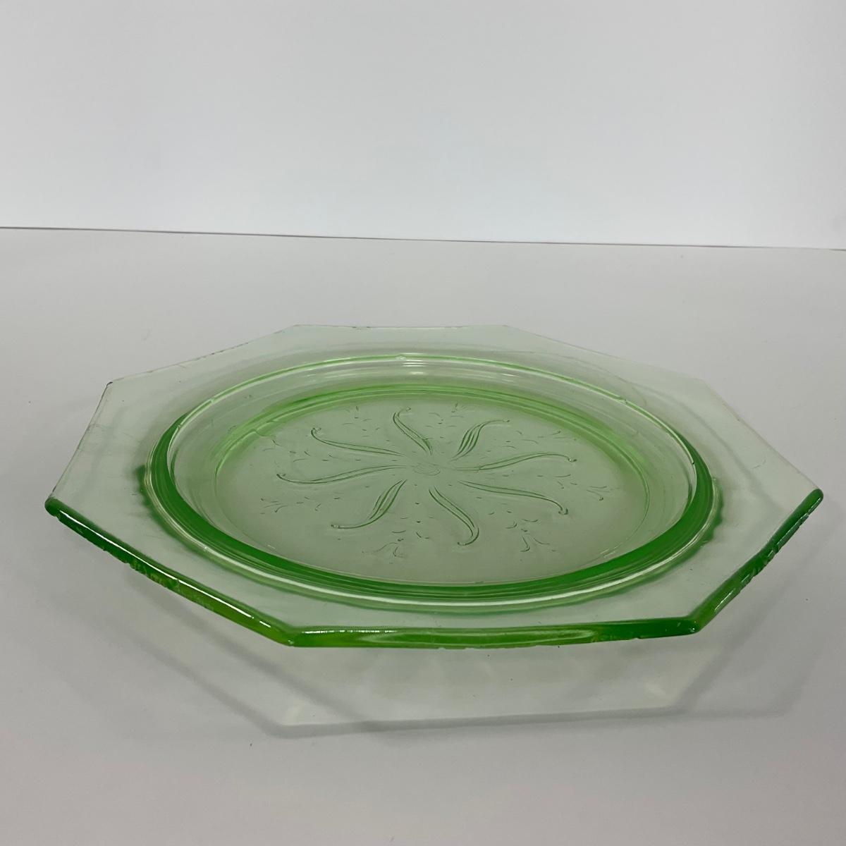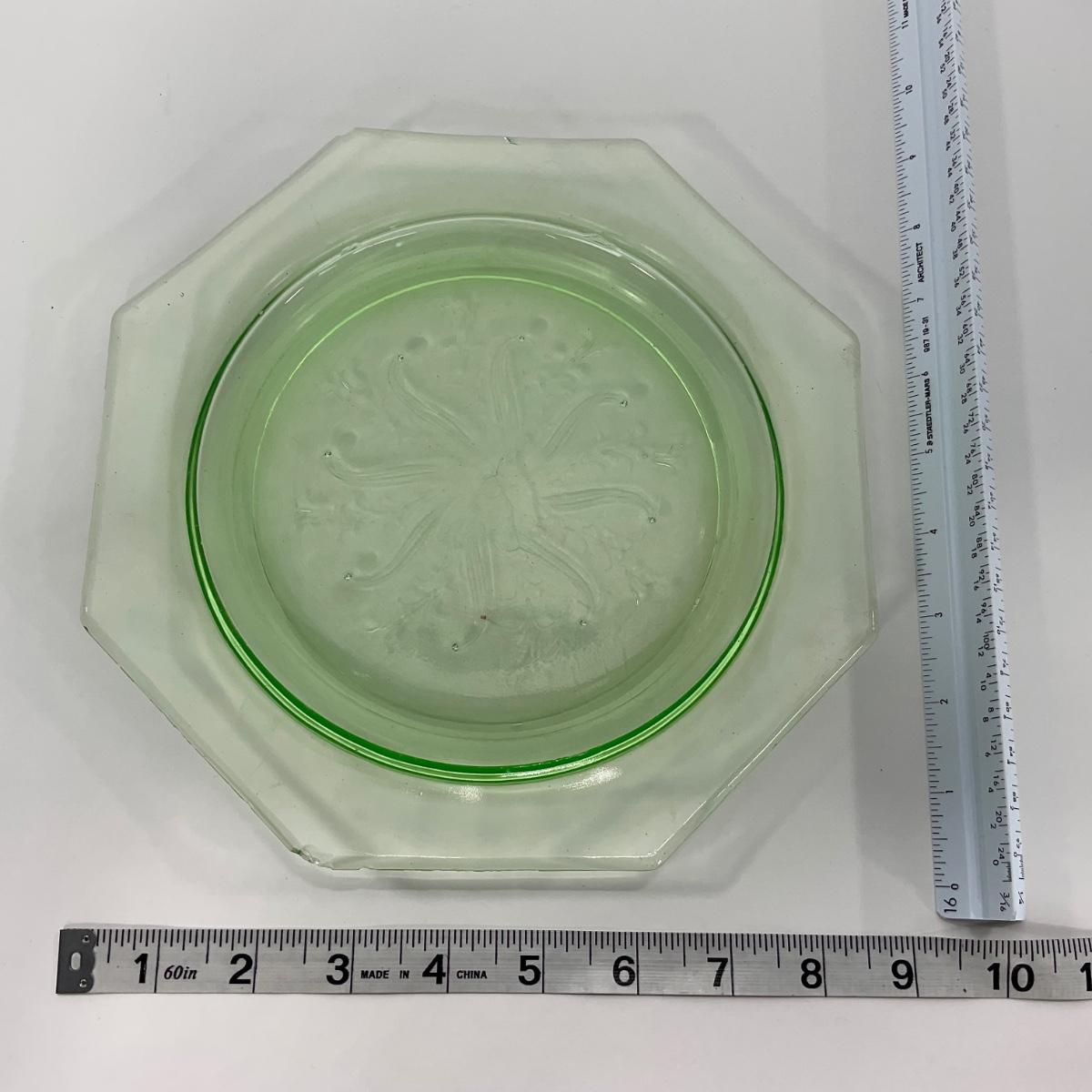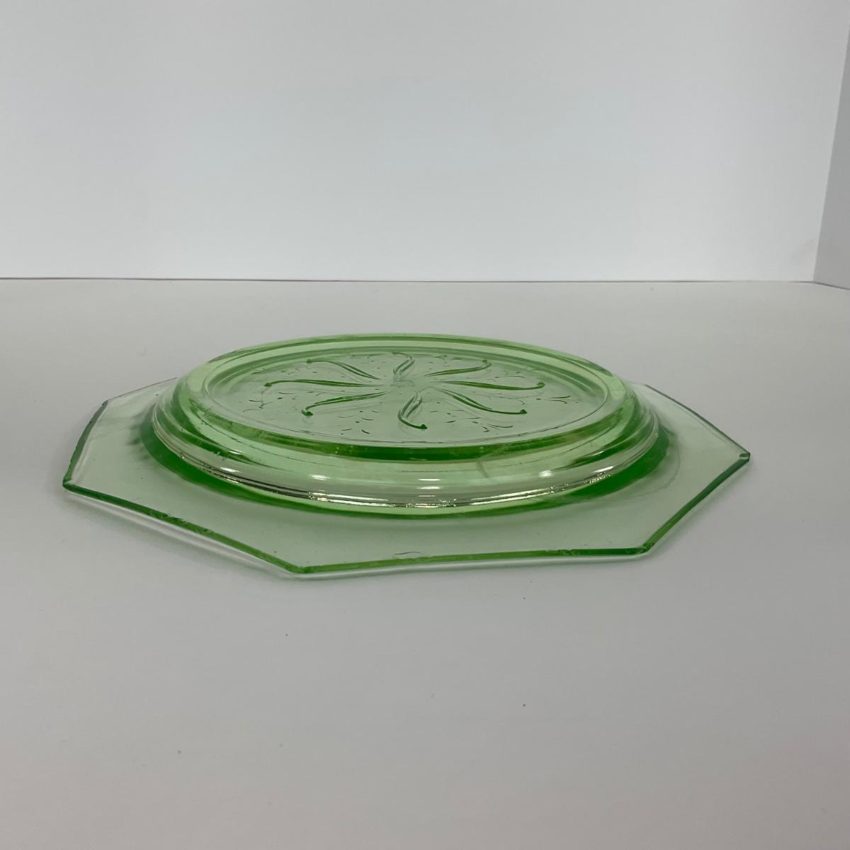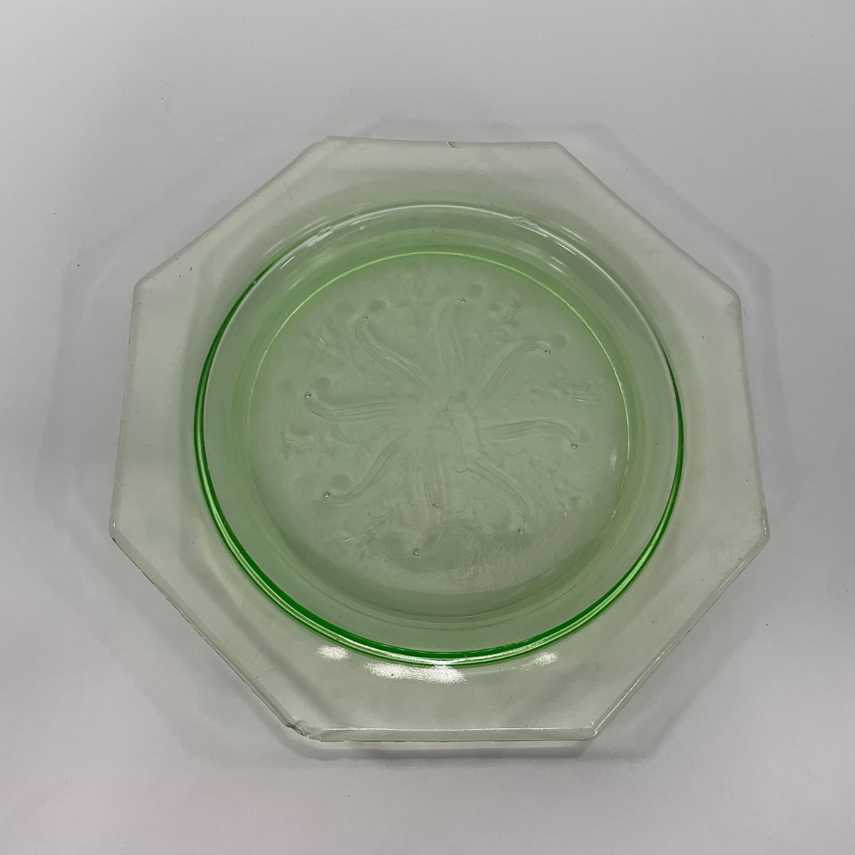 Two green depression glass trays with design. Both pieces have quite a few chips and damage. I am Uranium glass so I DO GLOW under blacklight. Please see photos for details and condition. ::: Shipping is available on this lot. If you require shipping you must let us know at the close of the auction. We will coordinate with you after the item has been won. Shipping fees will include insurance up to or exceeding the value of all items being mailed. If you have any questions regarding this lot please contact the auctioneer either via this website, by direct email or by phone. PICK UP TIMES and other important information can be found in the TERMS and DESCRIPTION of the auction. Please take a look for pertinent information. Thanks!
