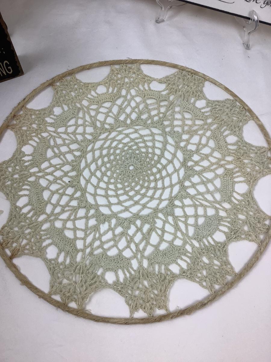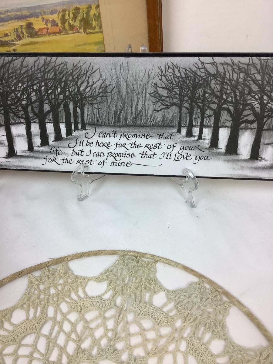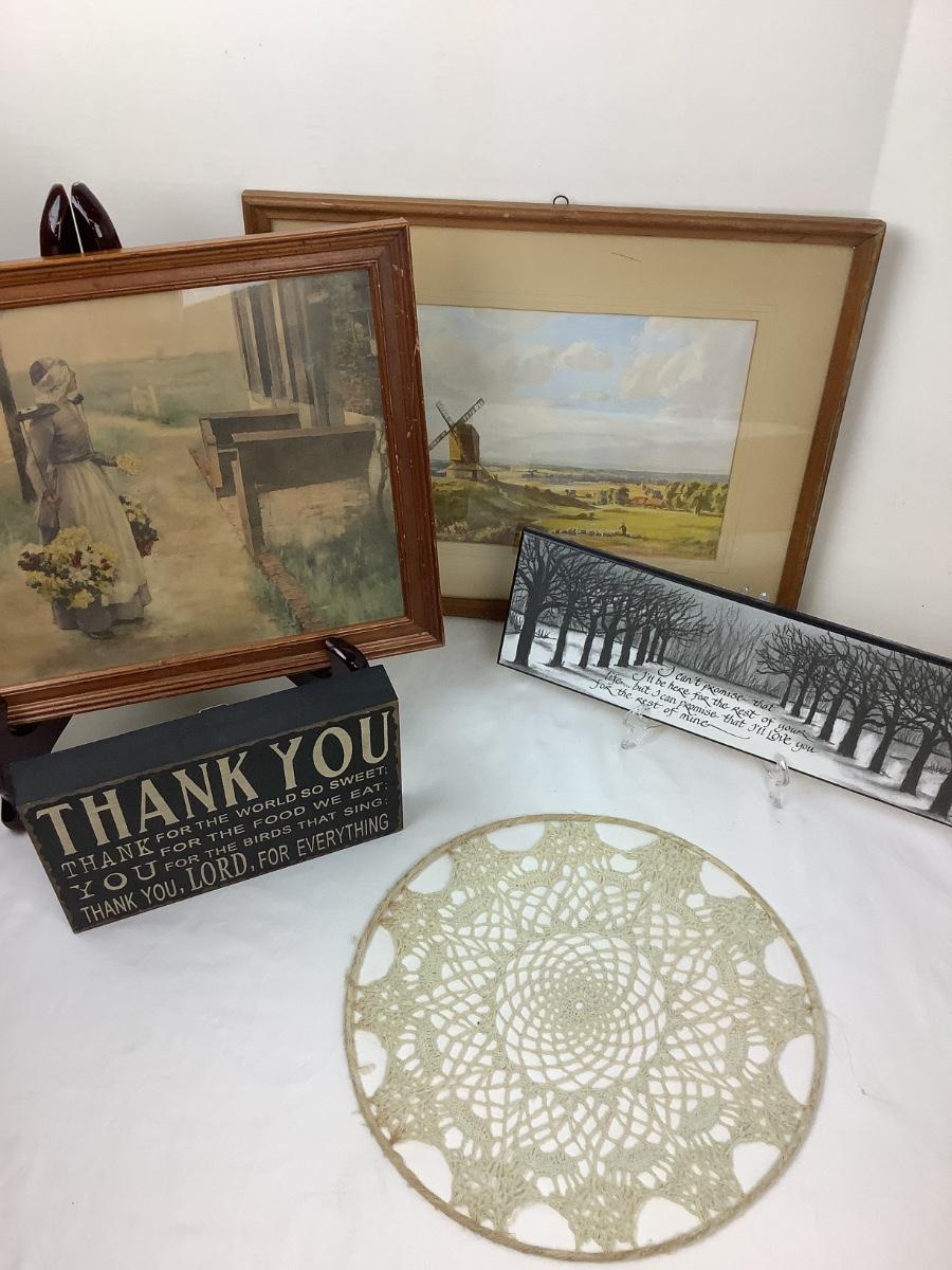 Framed wall art, signs and macrame.