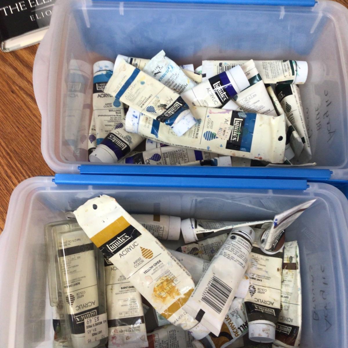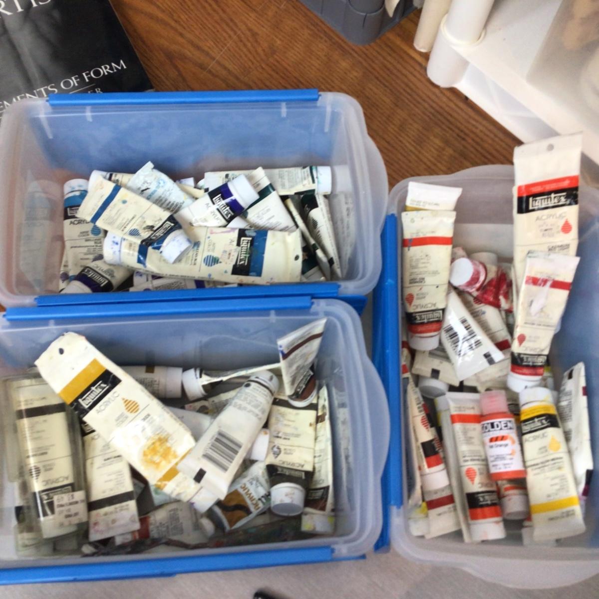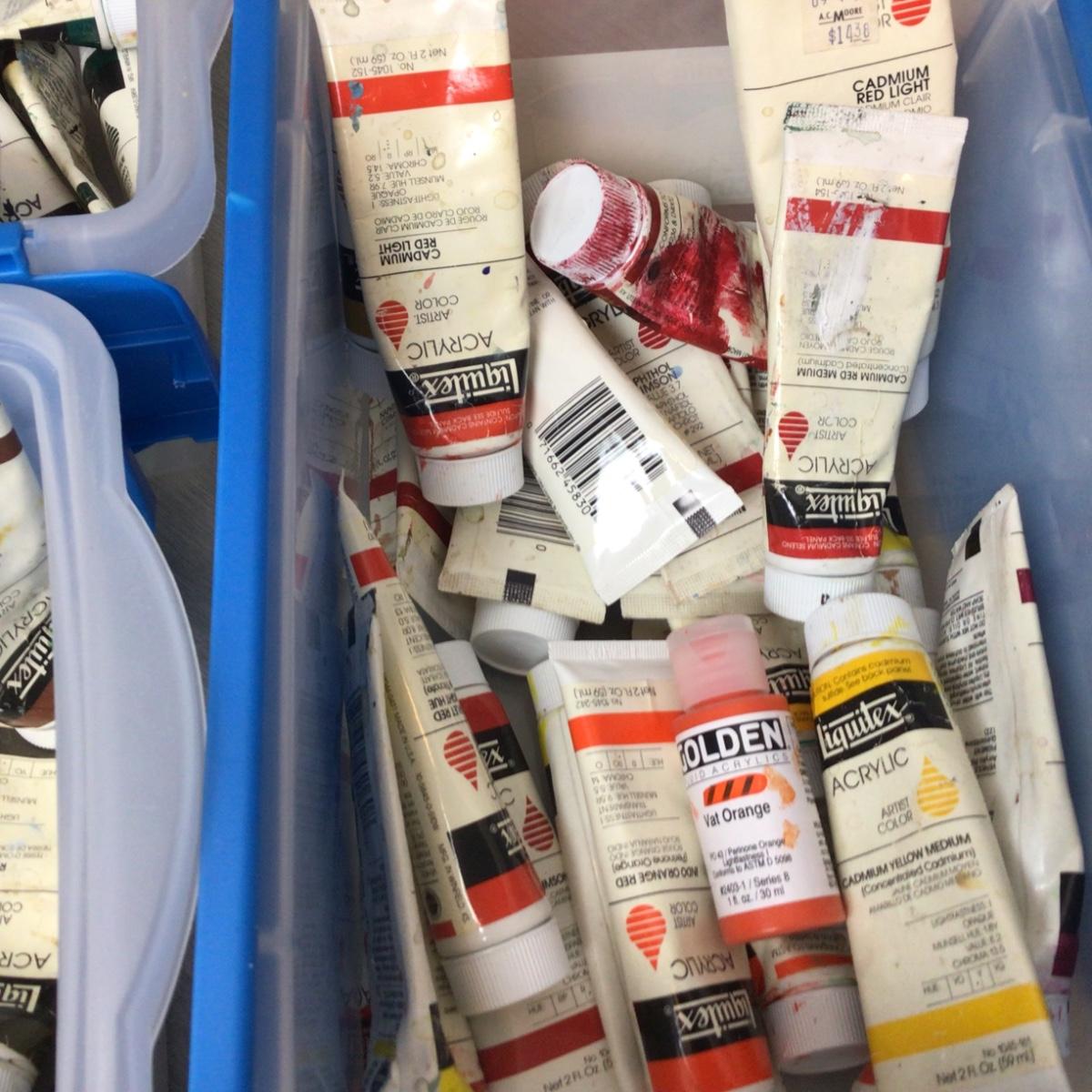 Large lot containing 3 containers full of liquitex paint, brown, yellow, red, orange, blue etc.