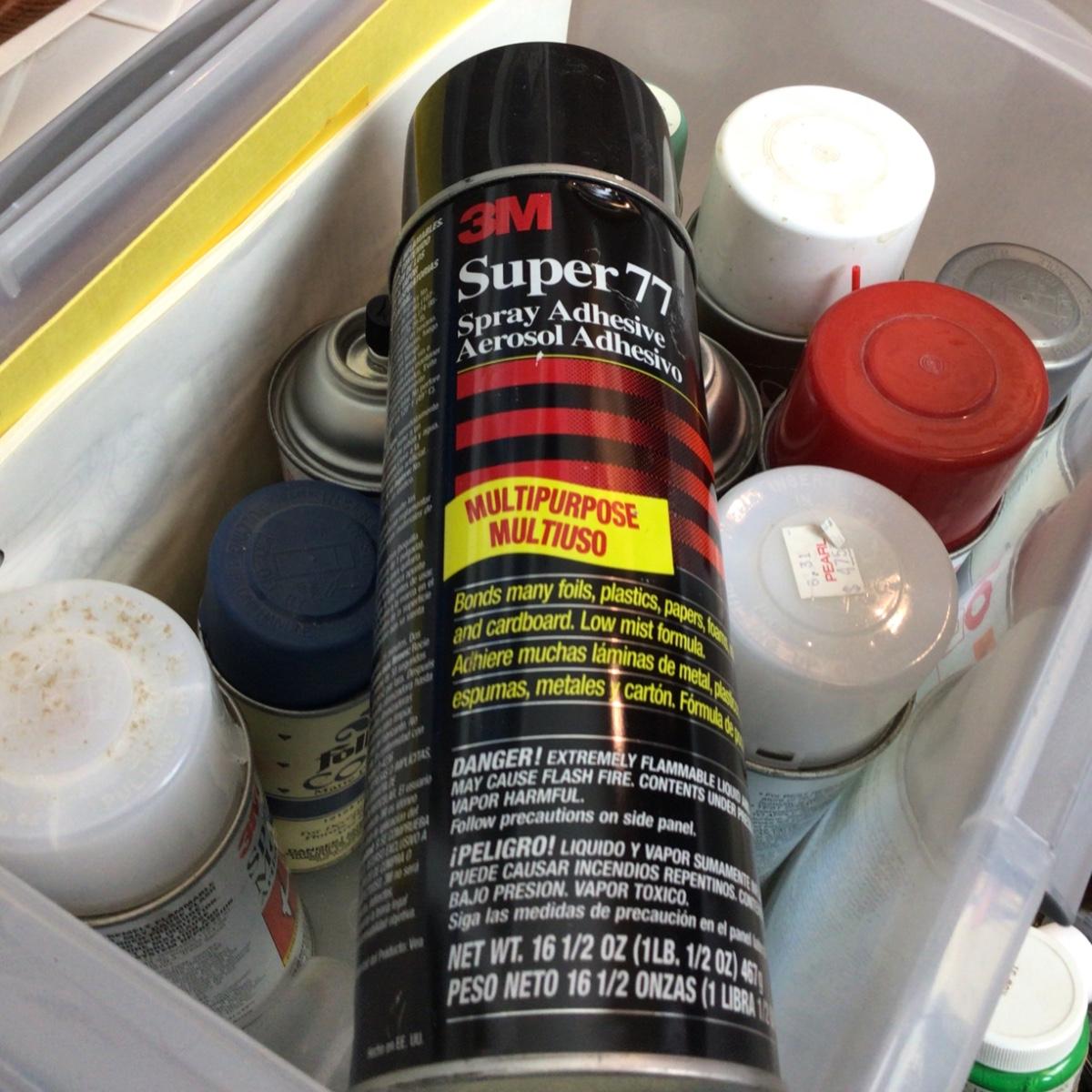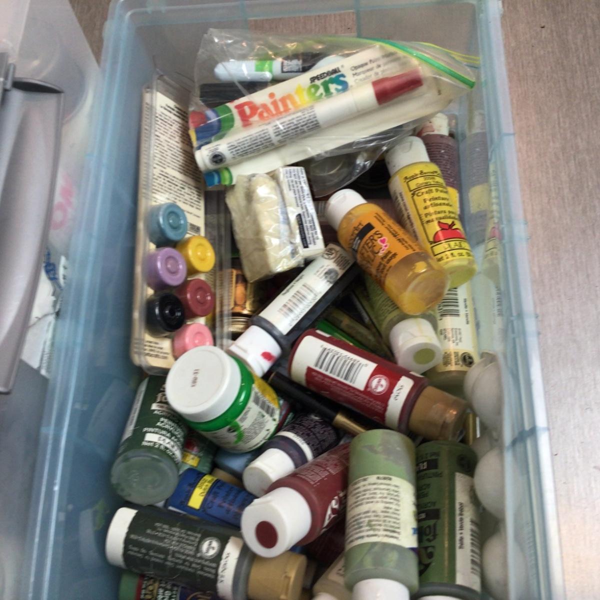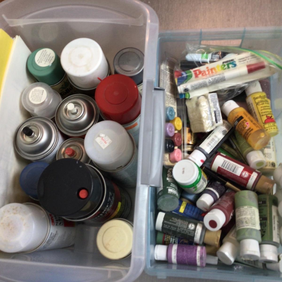 Lot contains spray paints, adhesives, assorted acrylic craft paints.