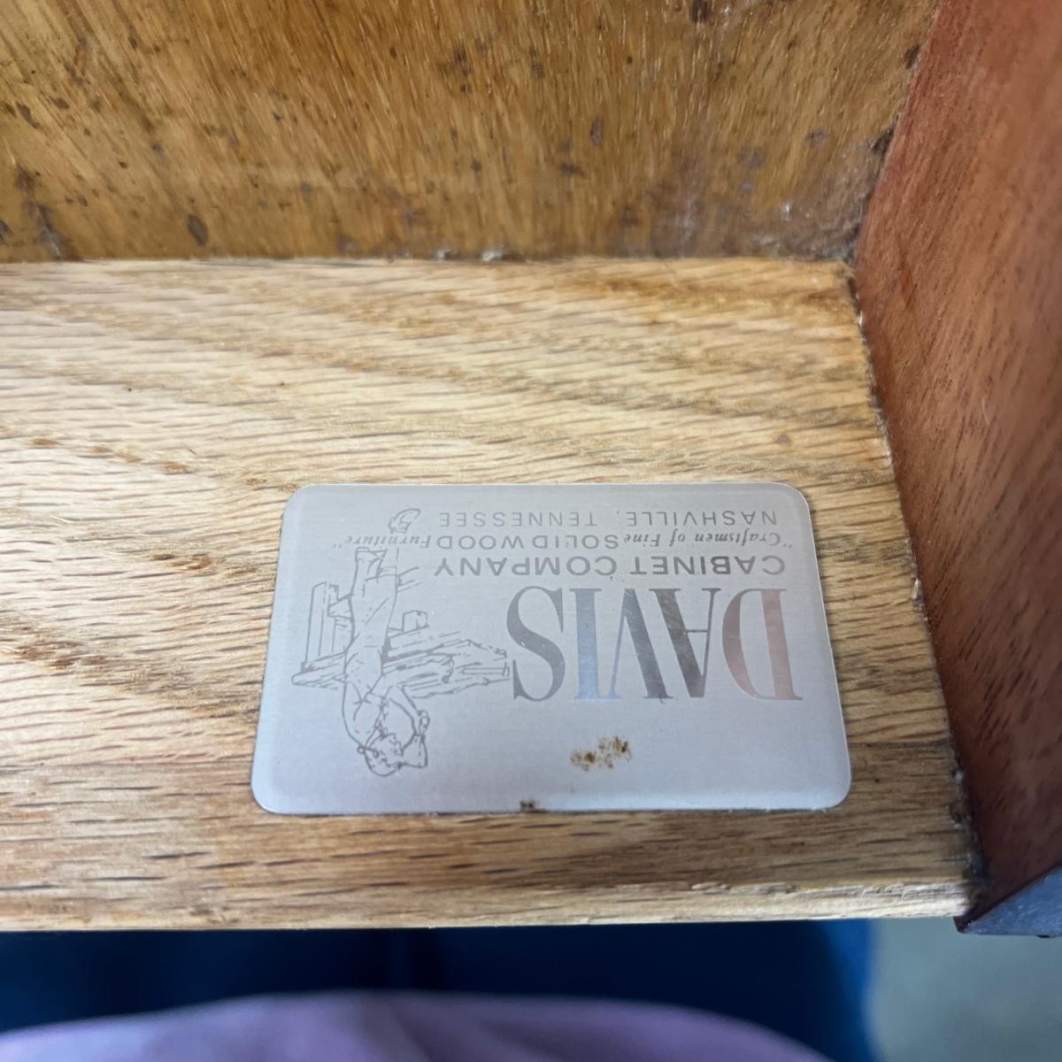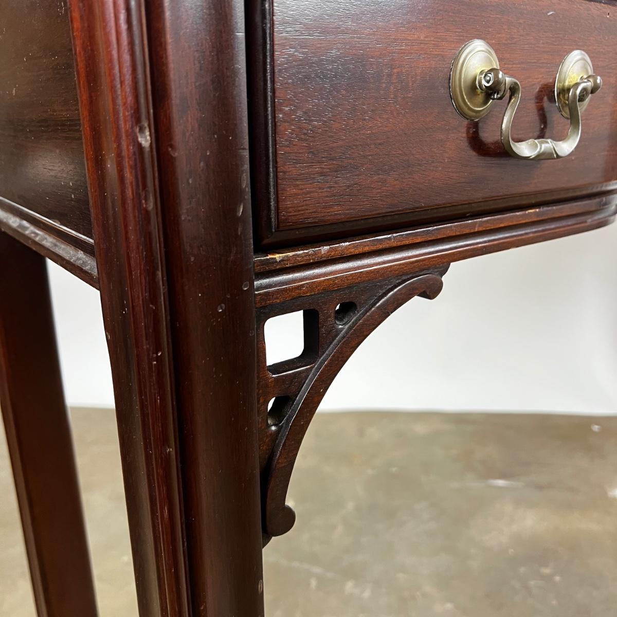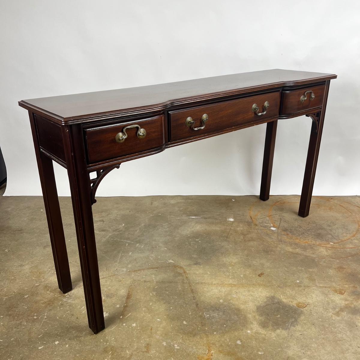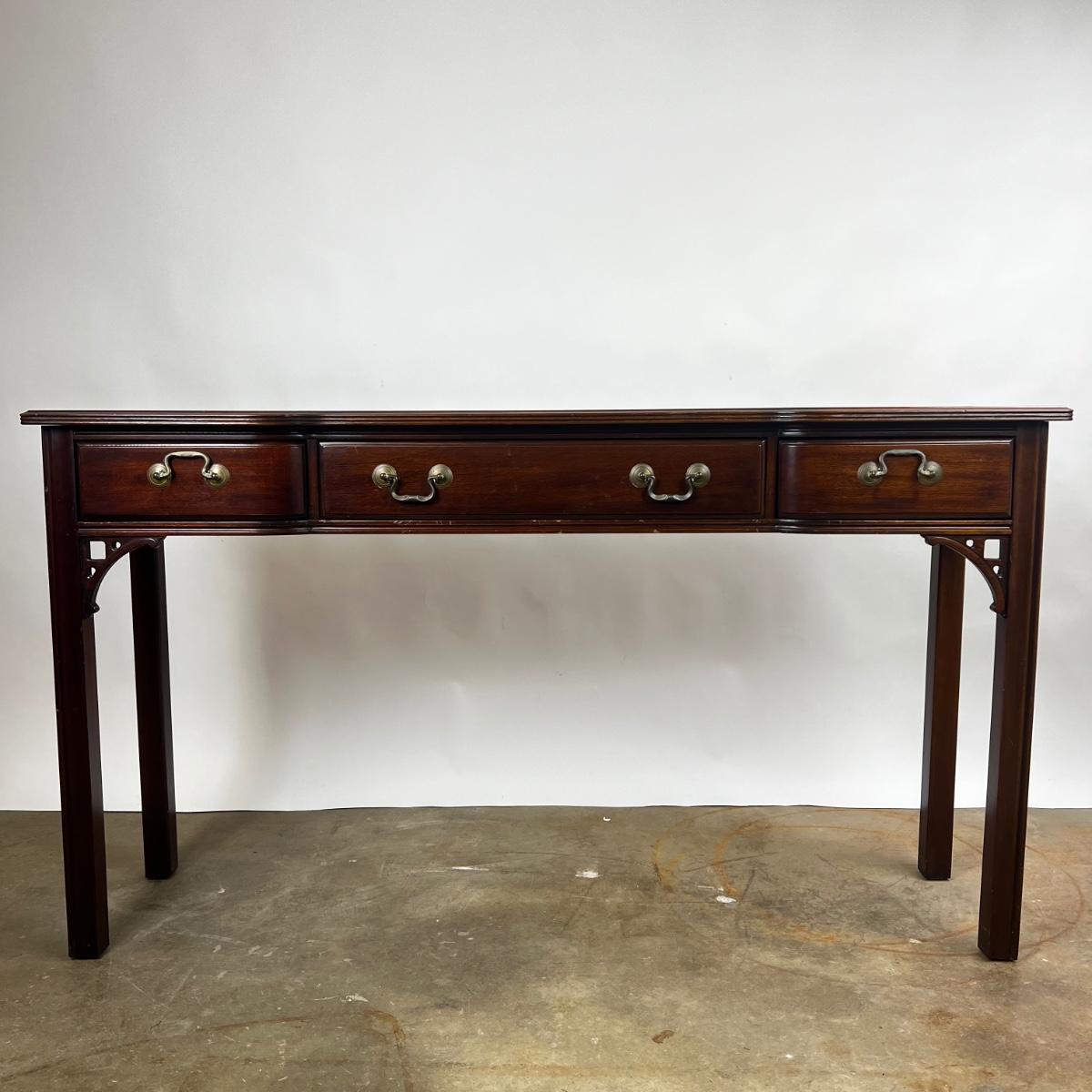 Vintage 1980s Davis Cabinet Co. Chippendale Style 3-drawer Mahogany Console Table. Table has molded top edge, square legs, brass pull.