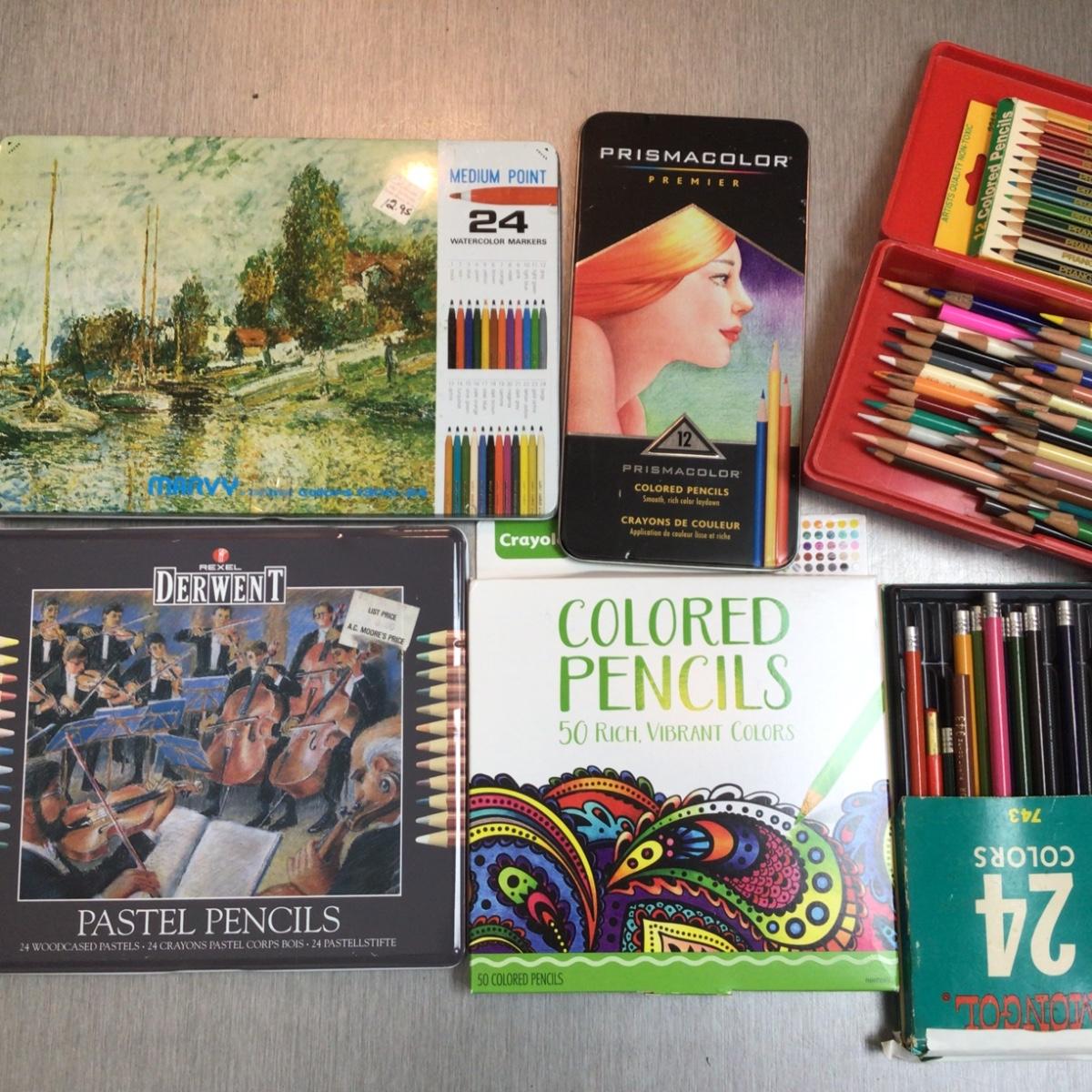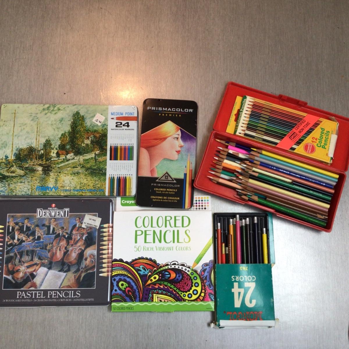 Lot contains many packs of colored pencils and pastel pencils, brands included Marty, Derwent, Prismacolor, Crayola, Prang and Mongol.