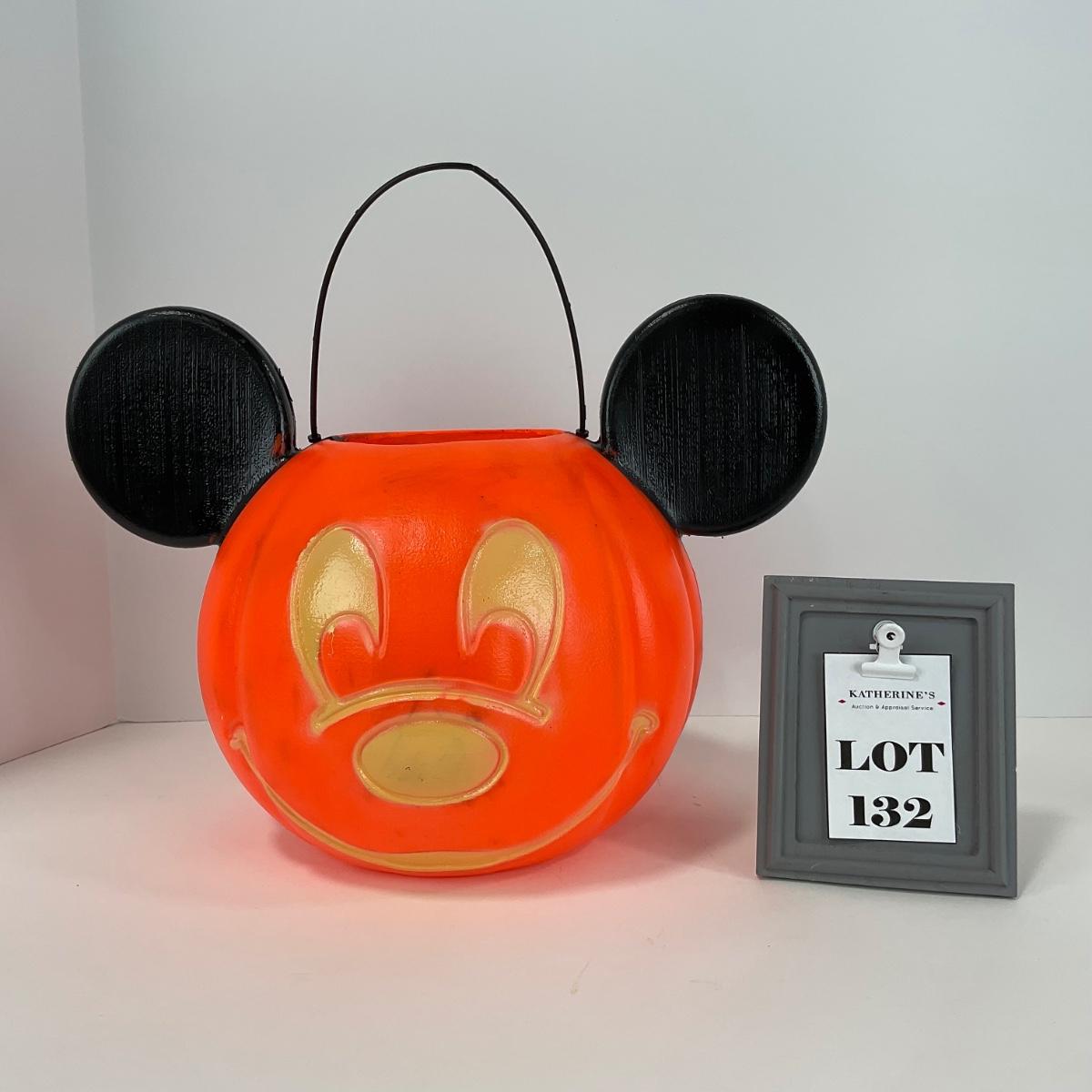 One Mickey Mouse pumpkin trick or treat bucket. Appears to be in good shape does have a few minor scuffs and marks. Please see photos for details and condition. Any condition statement is given as a courtesy to a client, is an opinion, and should not be treated as a statement of fact. Reference to condition written, oral or within a condition report shall not be regarded as a full account of condition and may not include all defects, alterations, or restorations. Absence of a condition report does not imply a lot is flawless or lacking imperfections or damage. Katherine’s Auction & Appraisal Service shall have no responsibility for any error or omission. Returns shall not be accepted on the basis of condition. ::: Shipping is available on this lot. If you require shipping you must let us know at the close of the auction. We will coordinate with you after the item has been won. Shipping fees will include insurance up to or exceeding the value of all items being mailed. If you have any questions regarding this lot please contact the auctioneer either via this website, by direct email or by phone. PICK UP TIMES and other important information can be found in the TERMS and DESCRIPTION of the auction. Please take a look for pertinent information. Thanks!