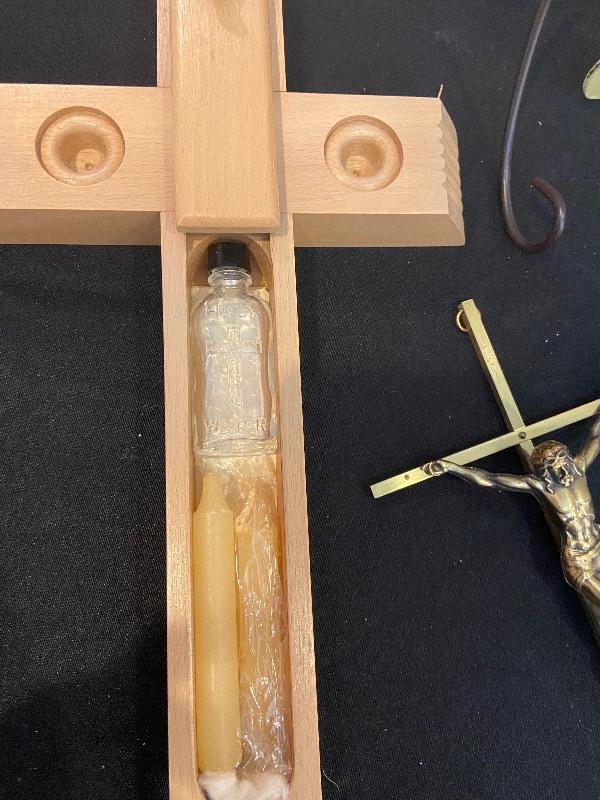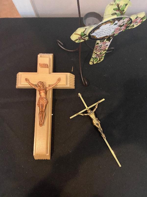 1 Jesus Crusifix with holy water and candles, 1 dangling cross and brass crusifix. This is an ONSITE Auction all items will need to be picked up on location. Please see auction description for pick up procedures. Shipping is avaiable on smaller items.