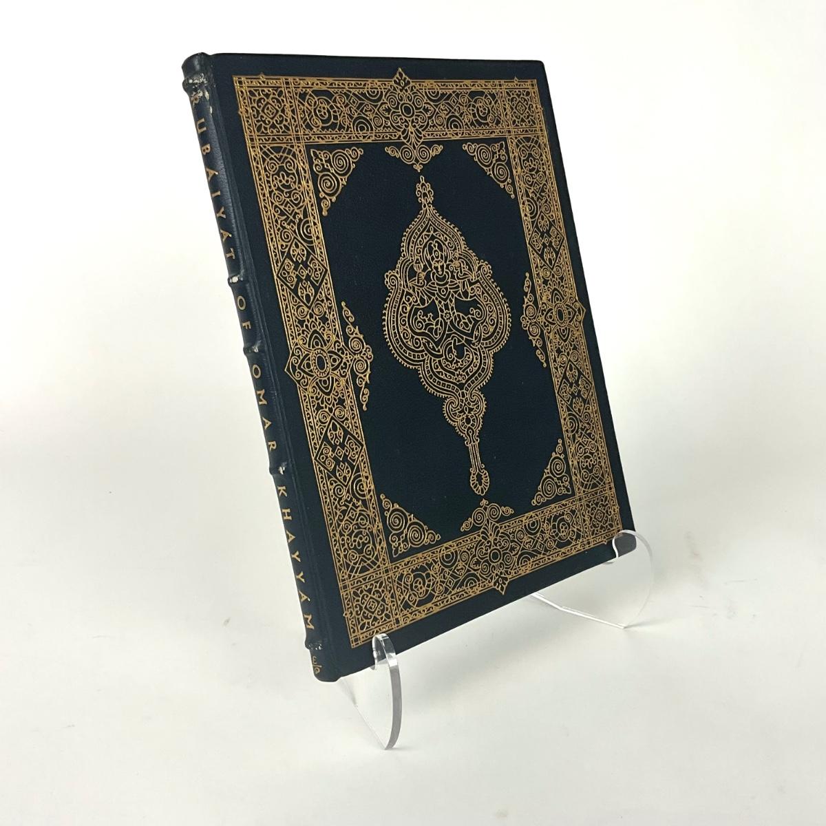 The book features specially commissioned portrait of Omar Khayyam. Nicely bound in full genuine leather with gilt lettering decorations on the covers and spine, gilt edges on all sides, raised bands on the spine, a ribbon page marker and more fabric end papers.