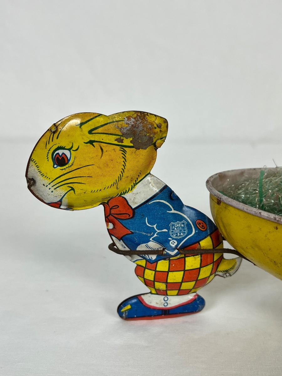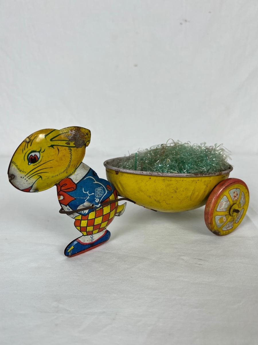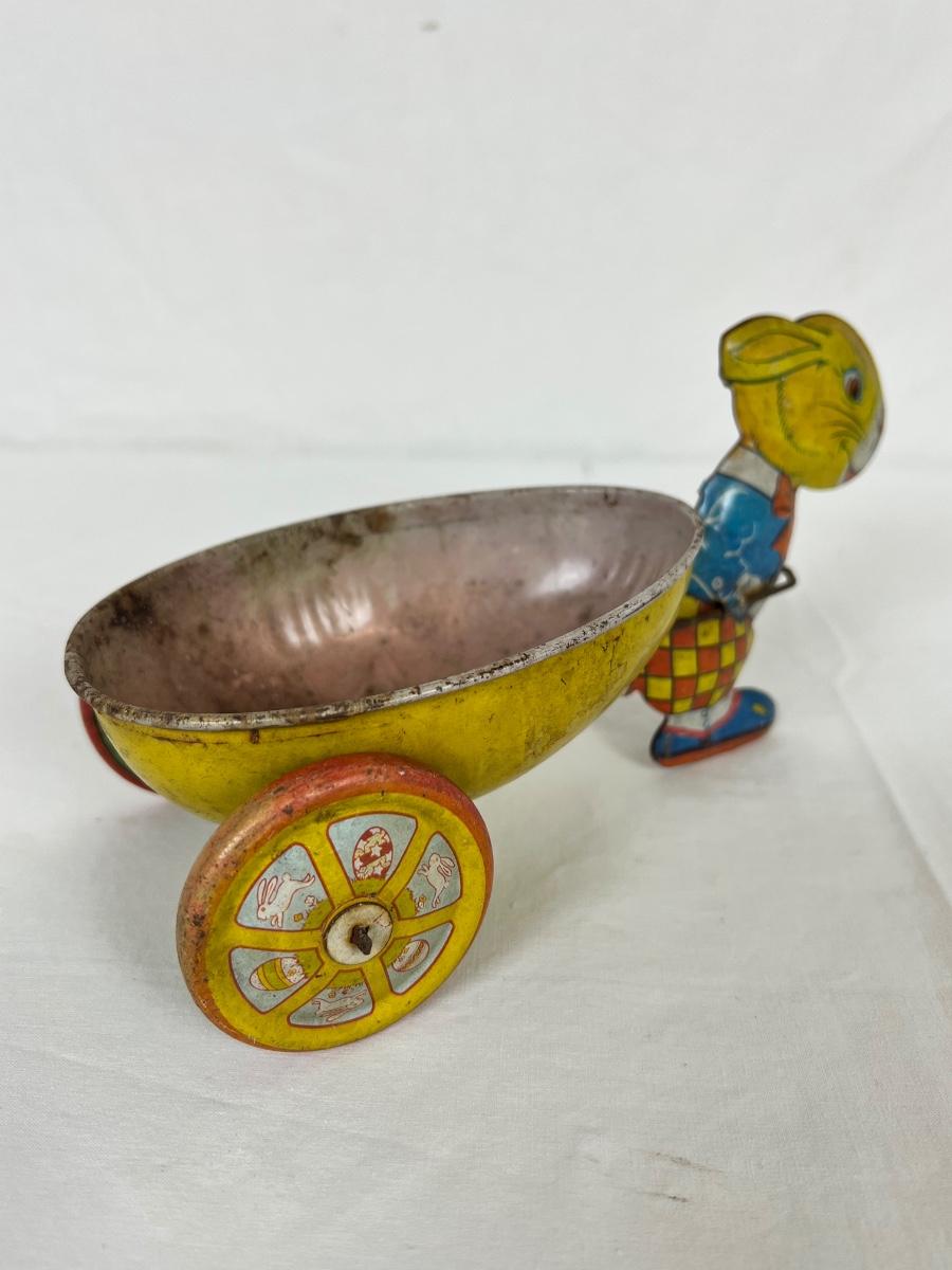 132 Vintage Tin Lithographed Toy Bunny Pulling Egg cart