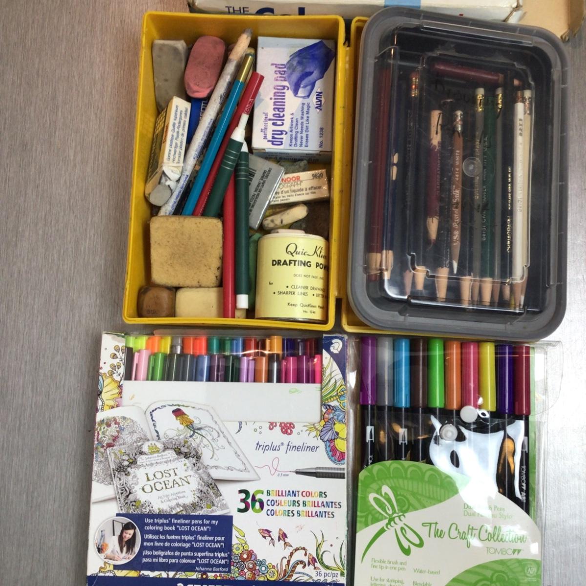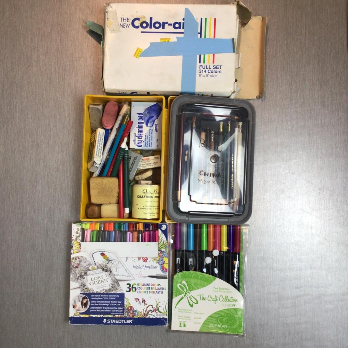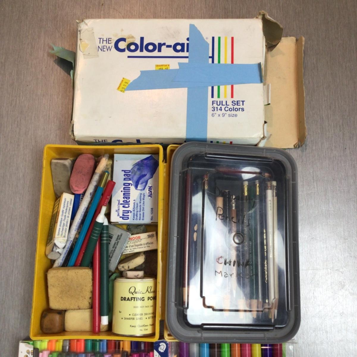 Lot contains color swatches, assorted erasers, drawing pencils and fine point markers.