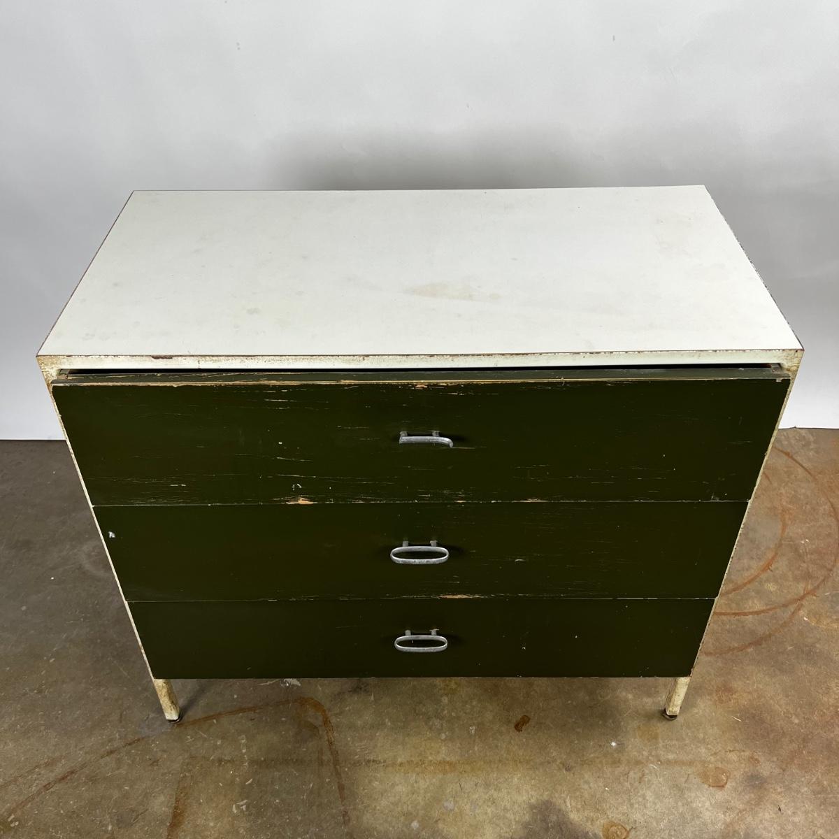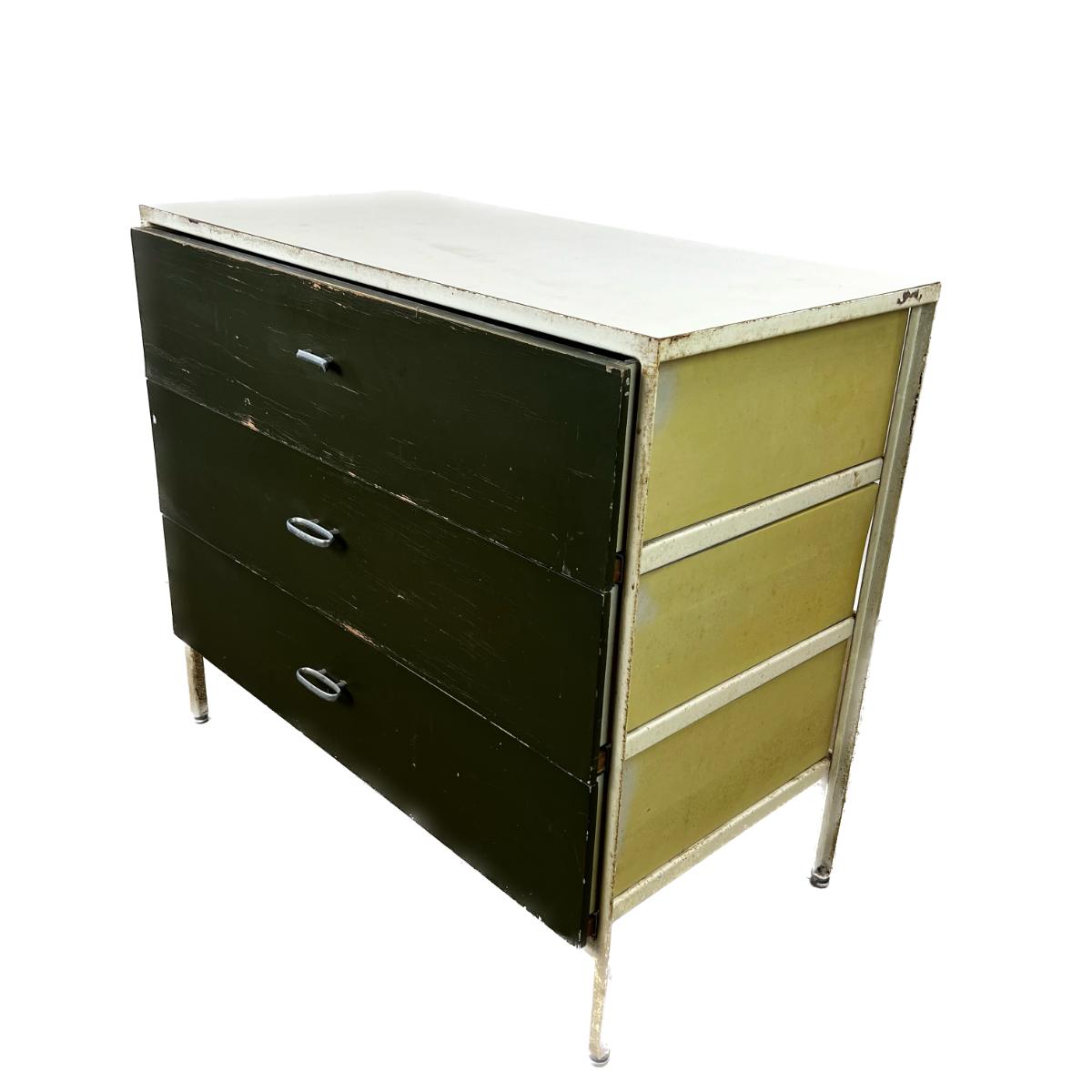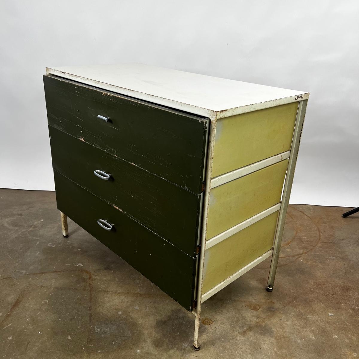 Mid Century Modern Herman Miller Steel Frame Laminated Dresser designed by George Nelson. Dresser is in weathered condition, one pull is broken but broke piece is included.