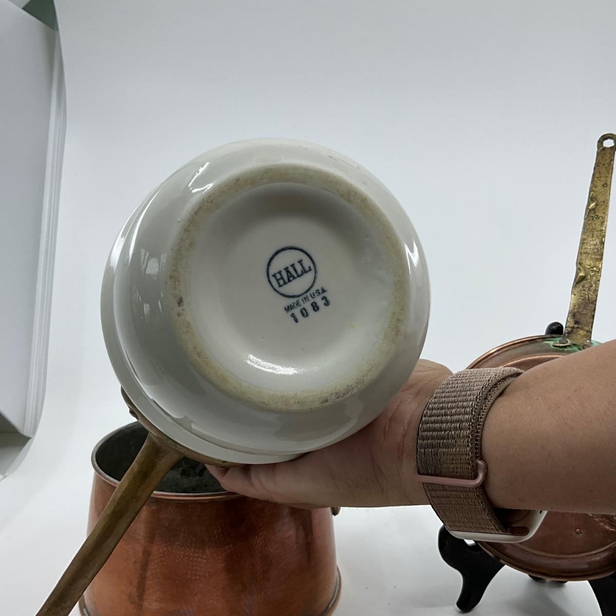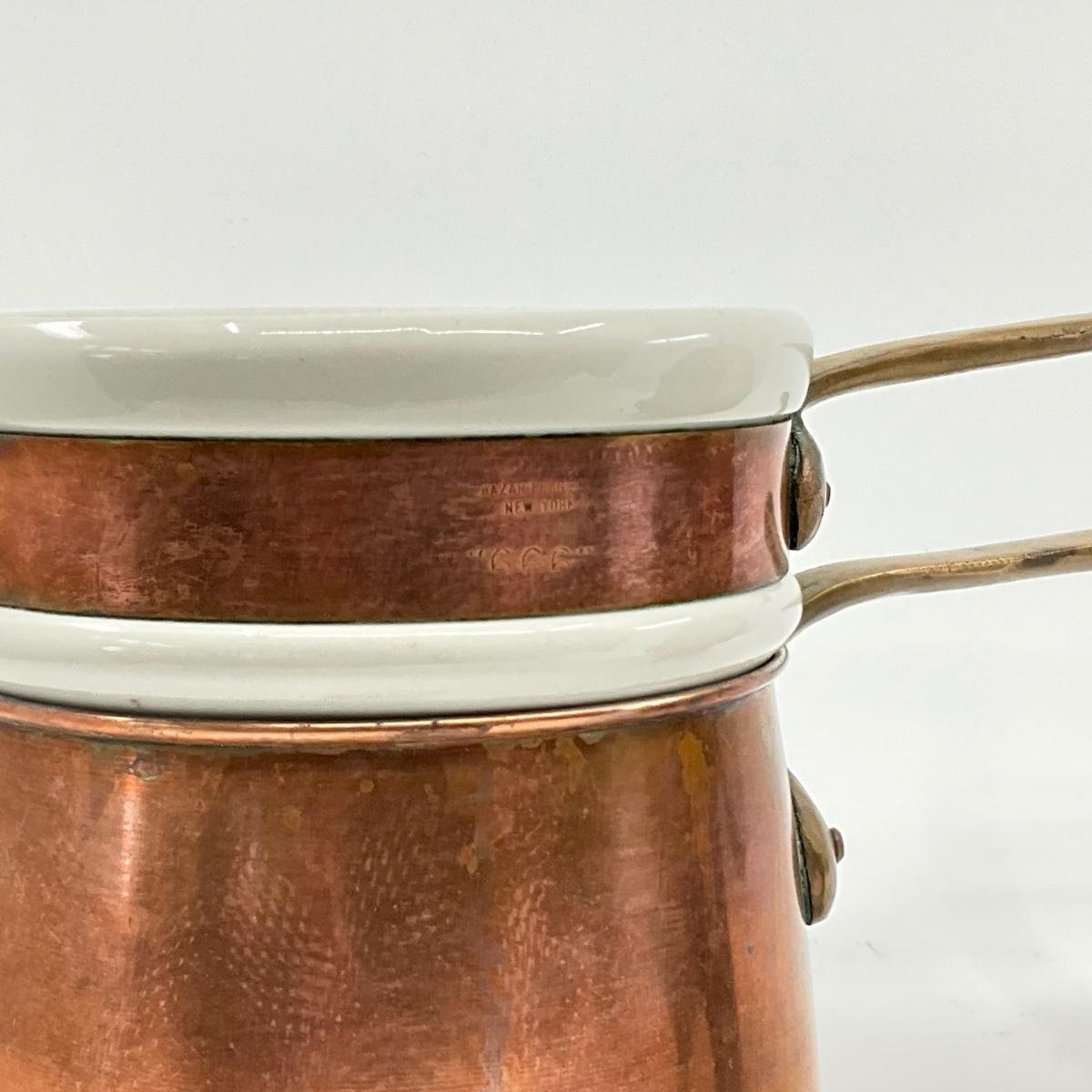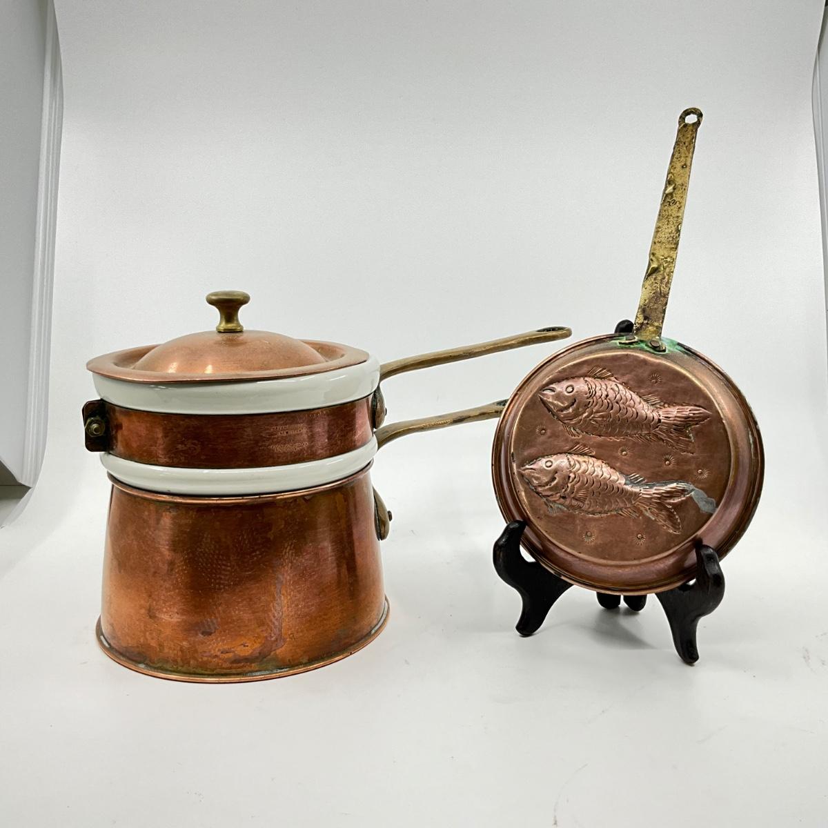1326 Vintage Bazar Francais 666 NY Hall Porcelain Double Boiler with Small Copper Fish Pan