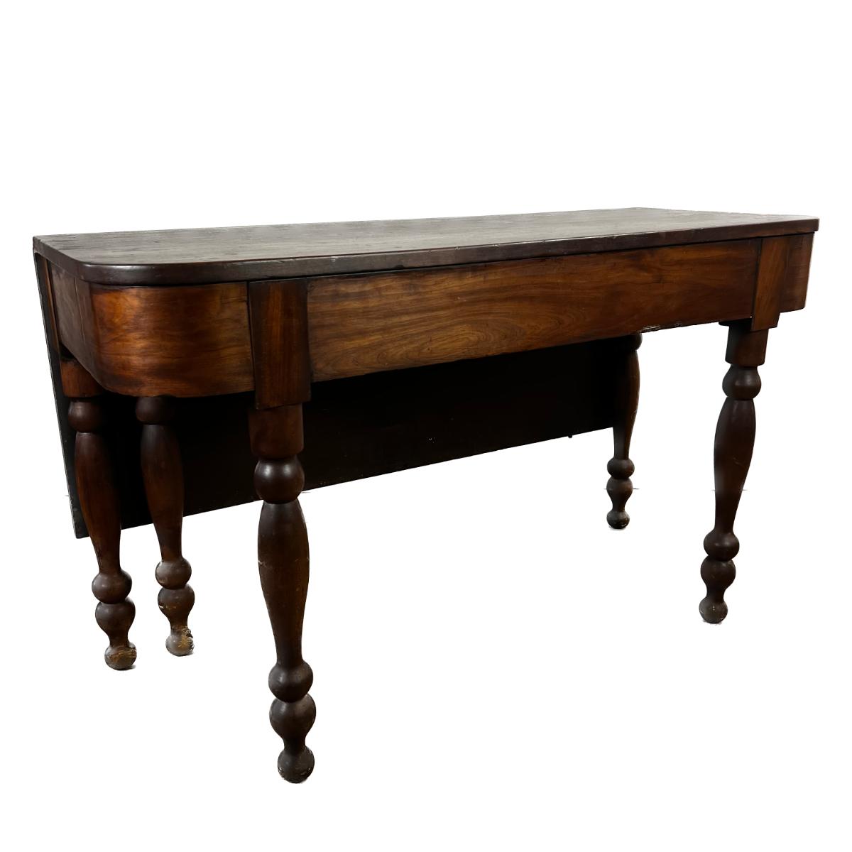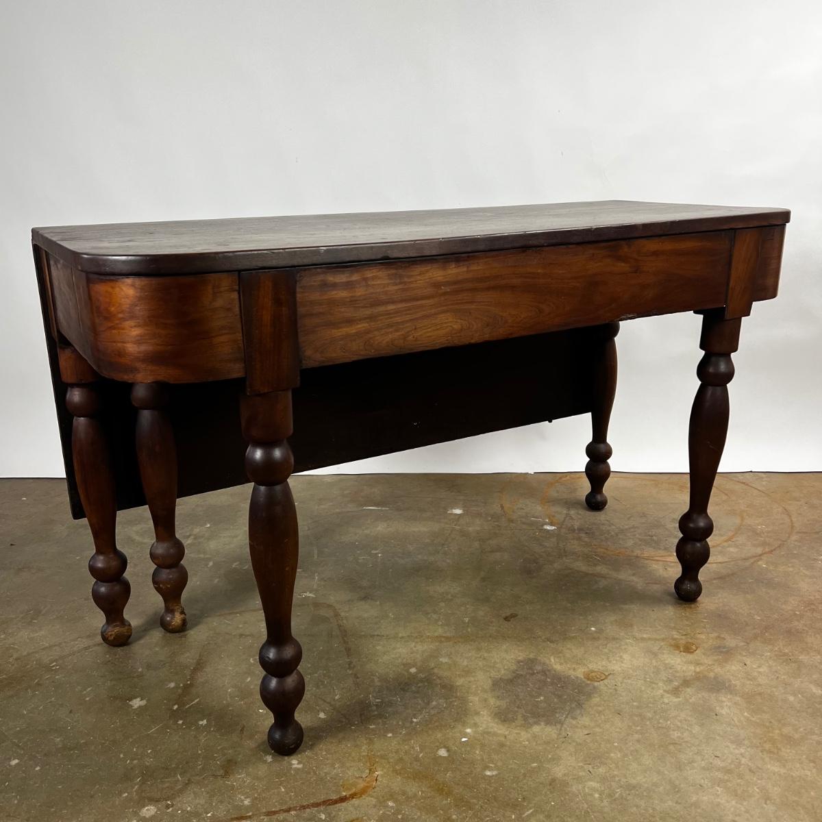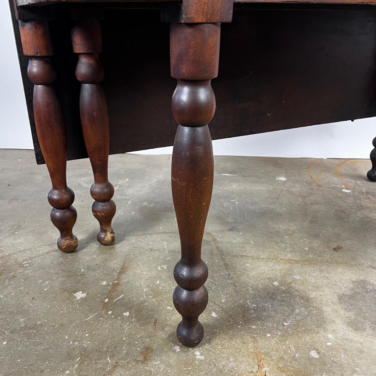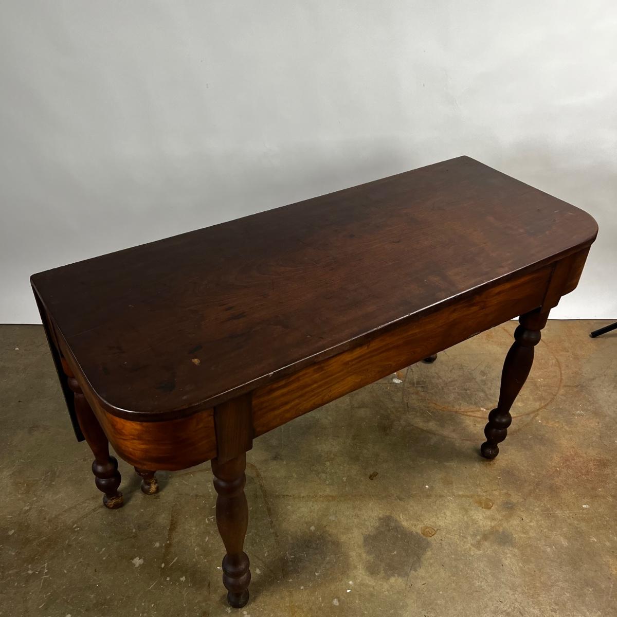 Antique Cherry Half Drop Leaf Banquet Table. One foot on table has a section of wood missing. Feet have some scratches.