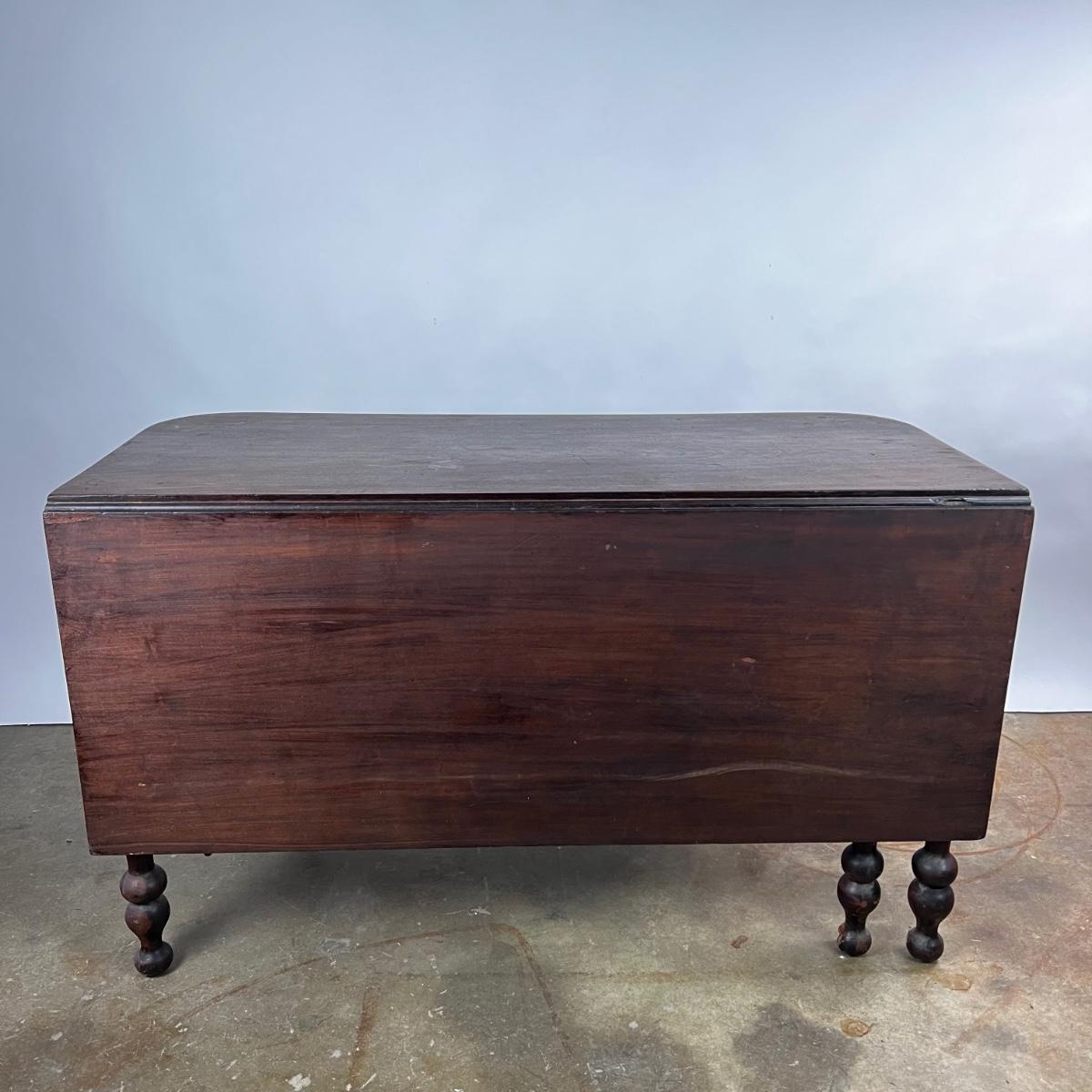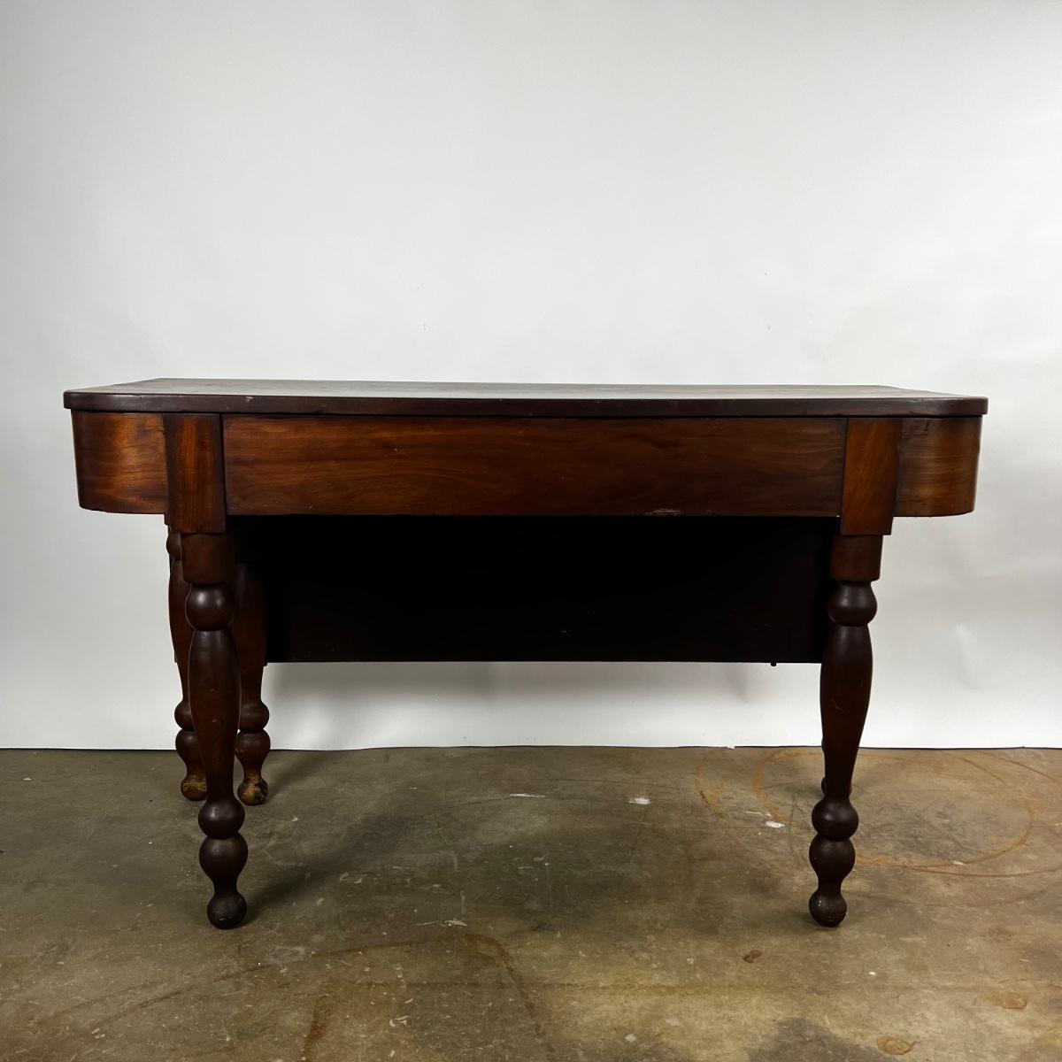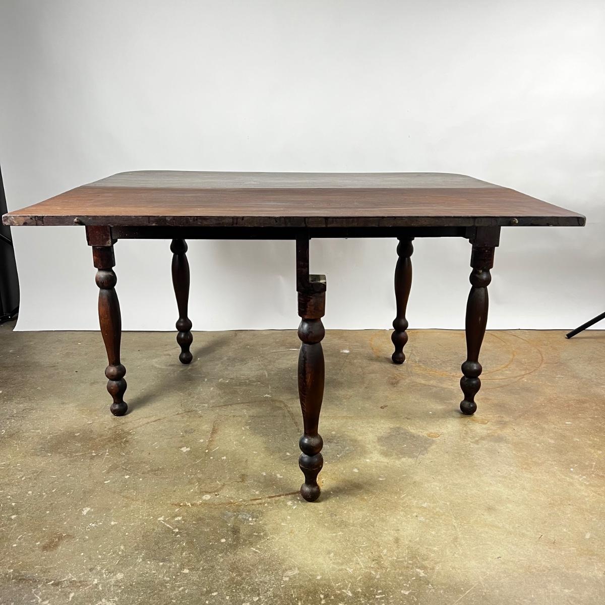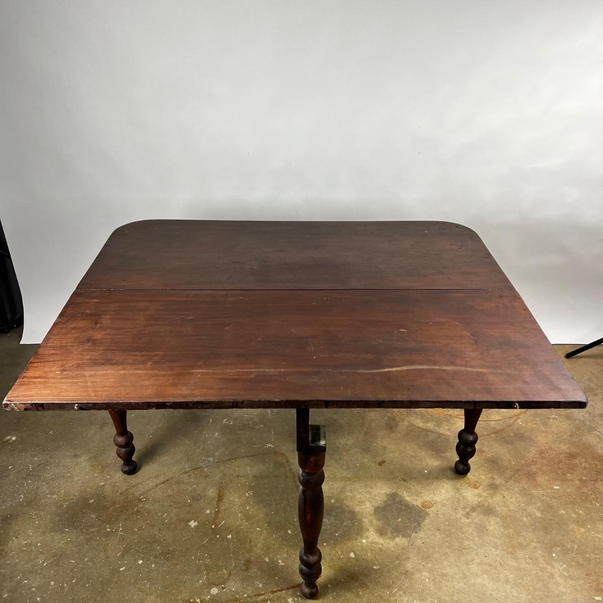 Antique Cherry Half Drop Leaf Banquet Table. One foot on table has a section of wood missing. Feet have some scratches.