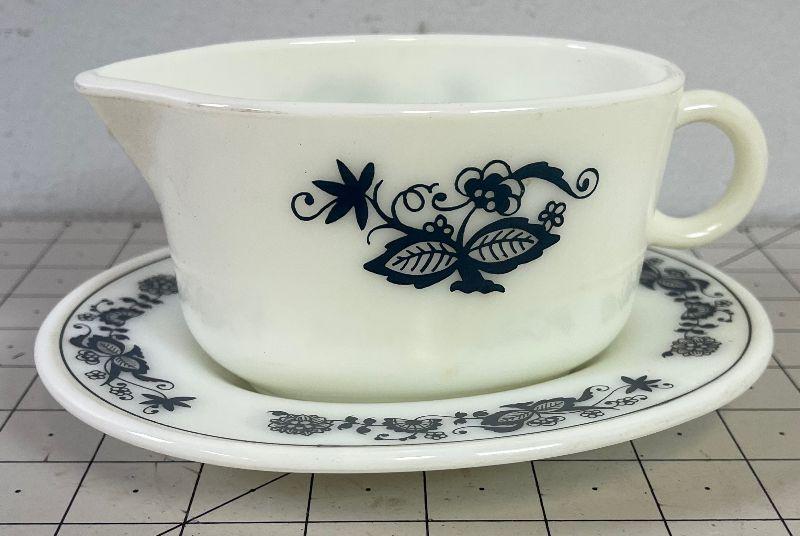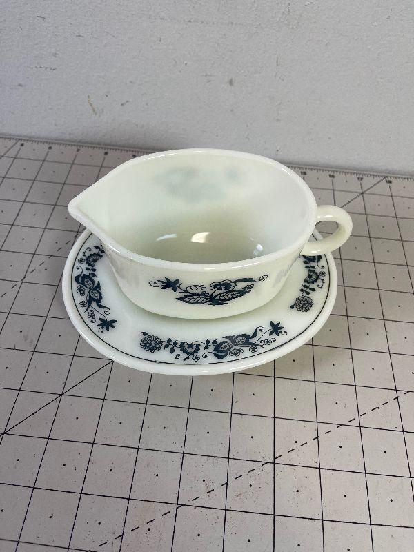 #133  Pyrex Gravy Boat with Tray Old Town Blue