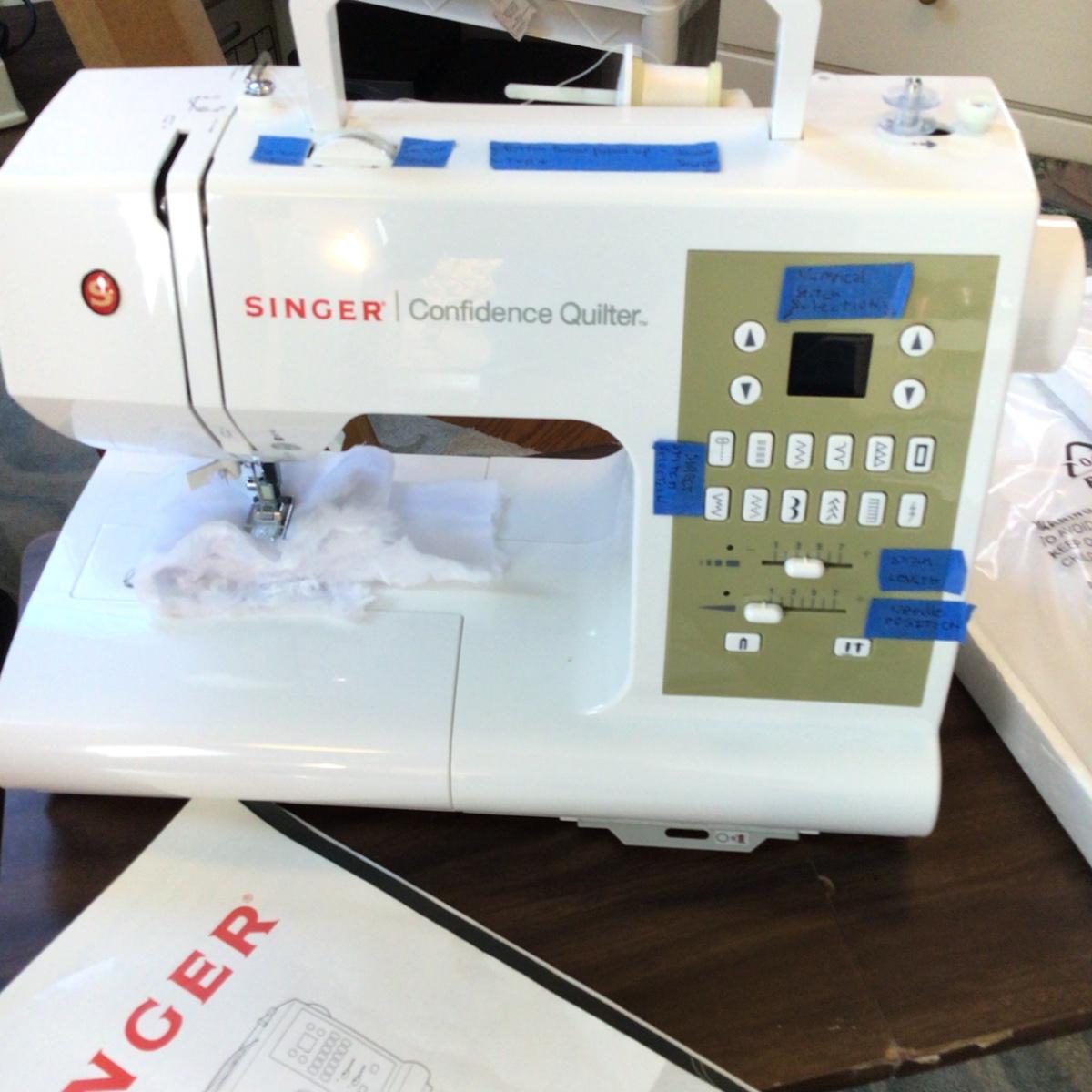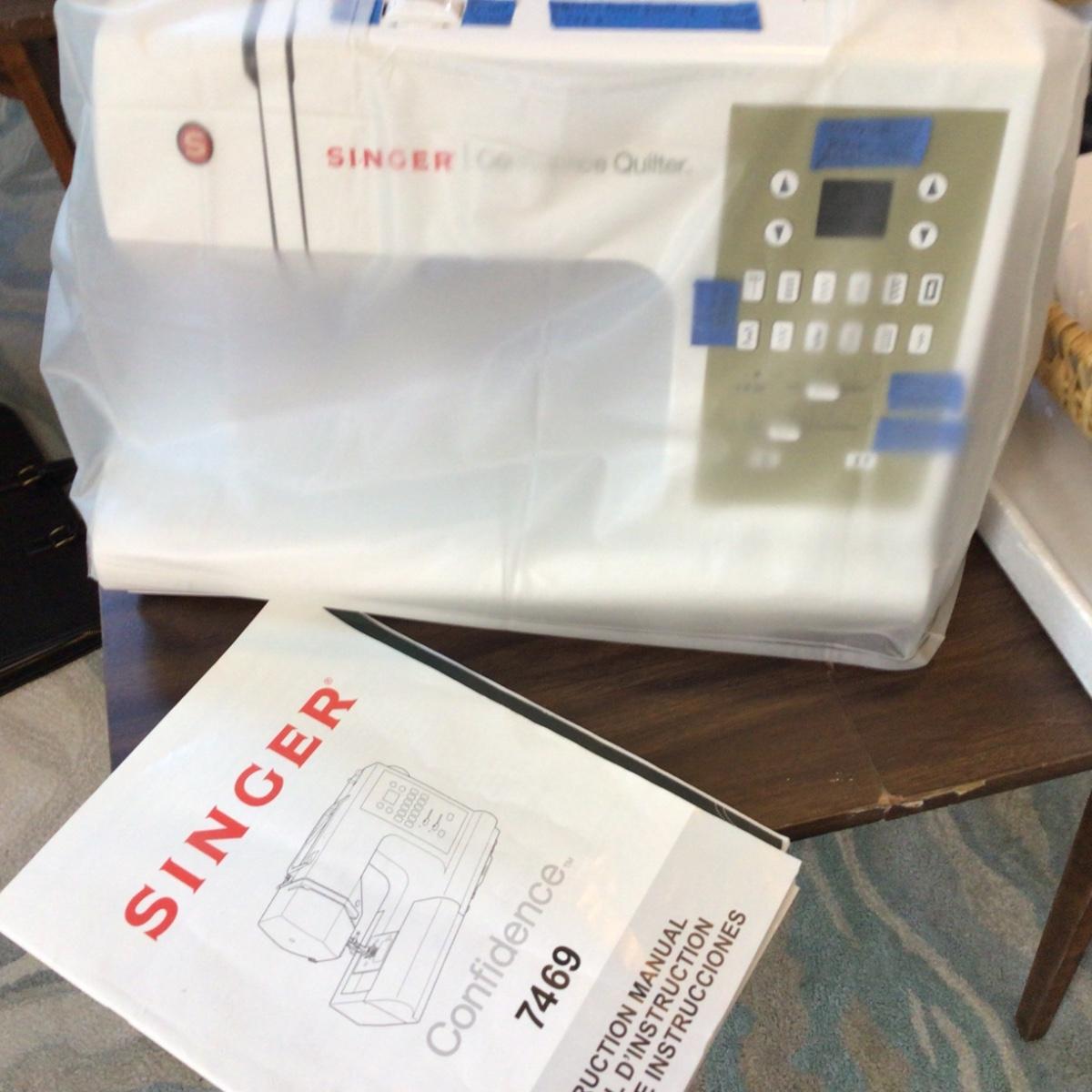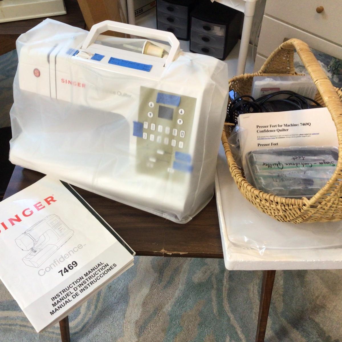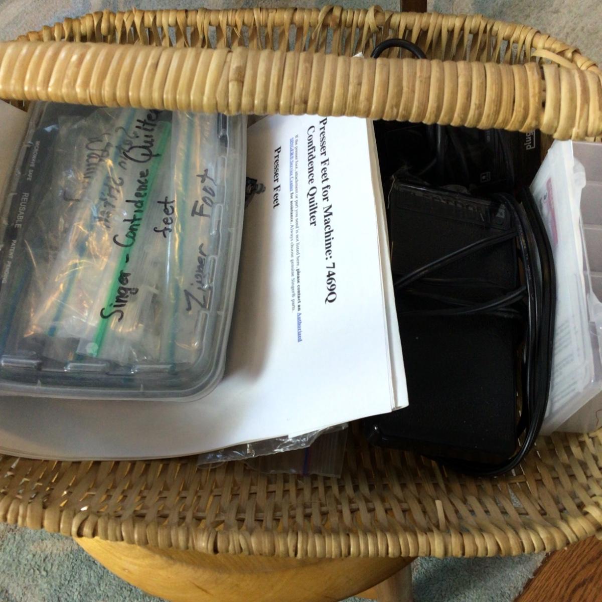 Sewing machine is complete with cover, pedal, power supply, manuals etc.