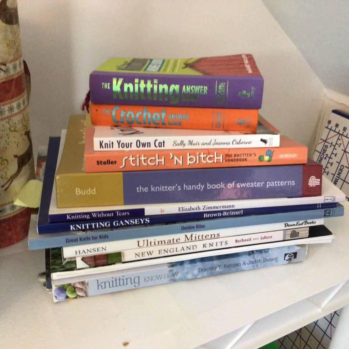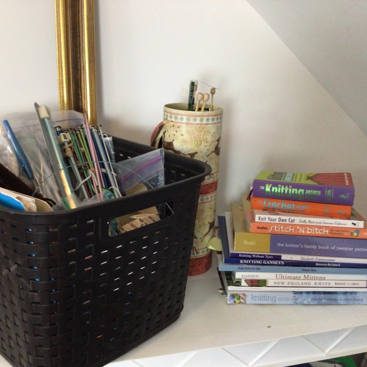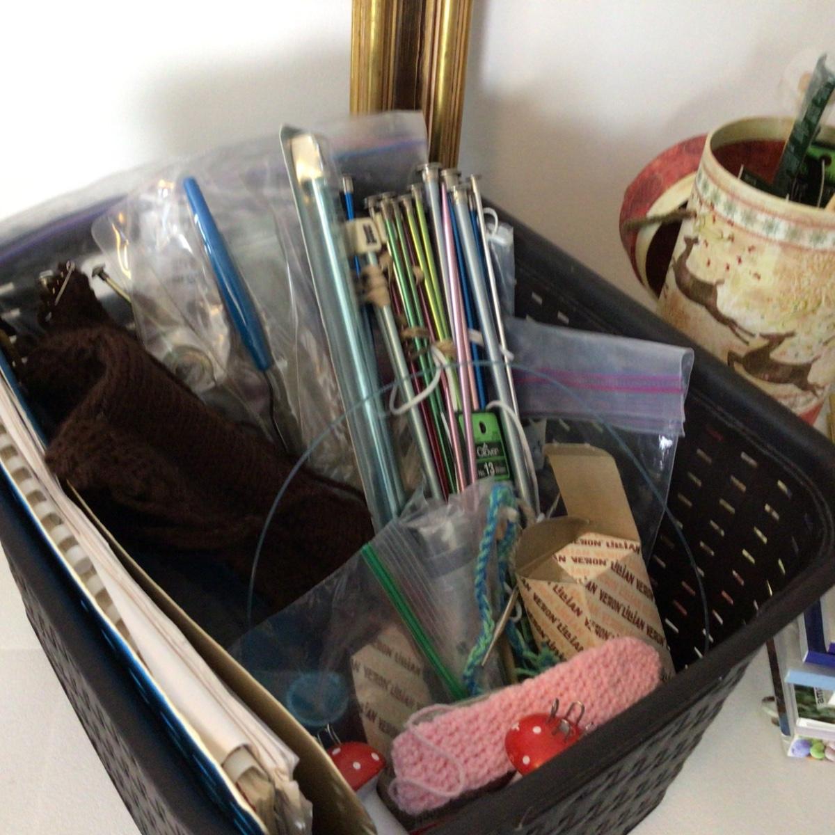Lot contains numerous knitting and crochet books, needles of all sizes and assorted notions.