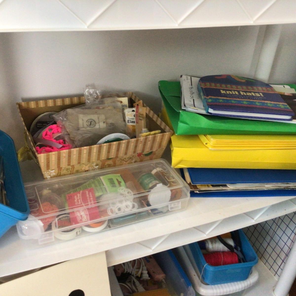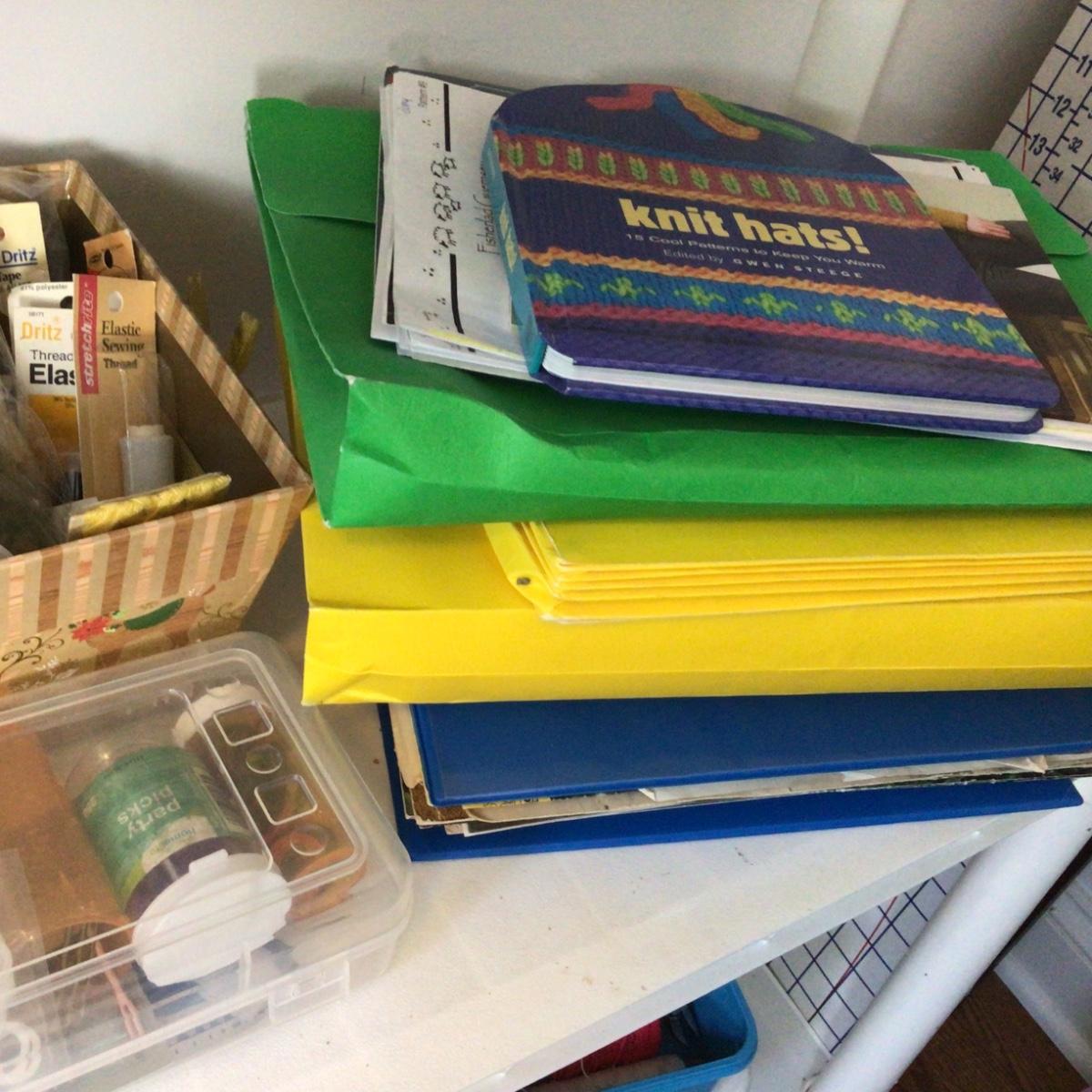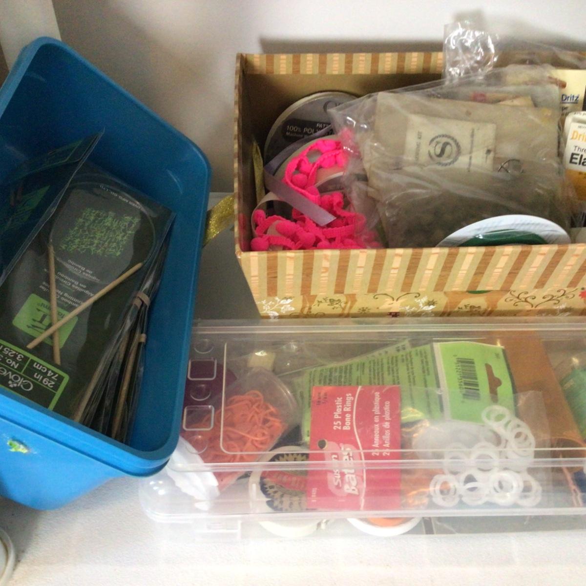 Lot contains many round knitting needles-some brand new, file folders full of knitting patterns and boxes of knitting supplies.