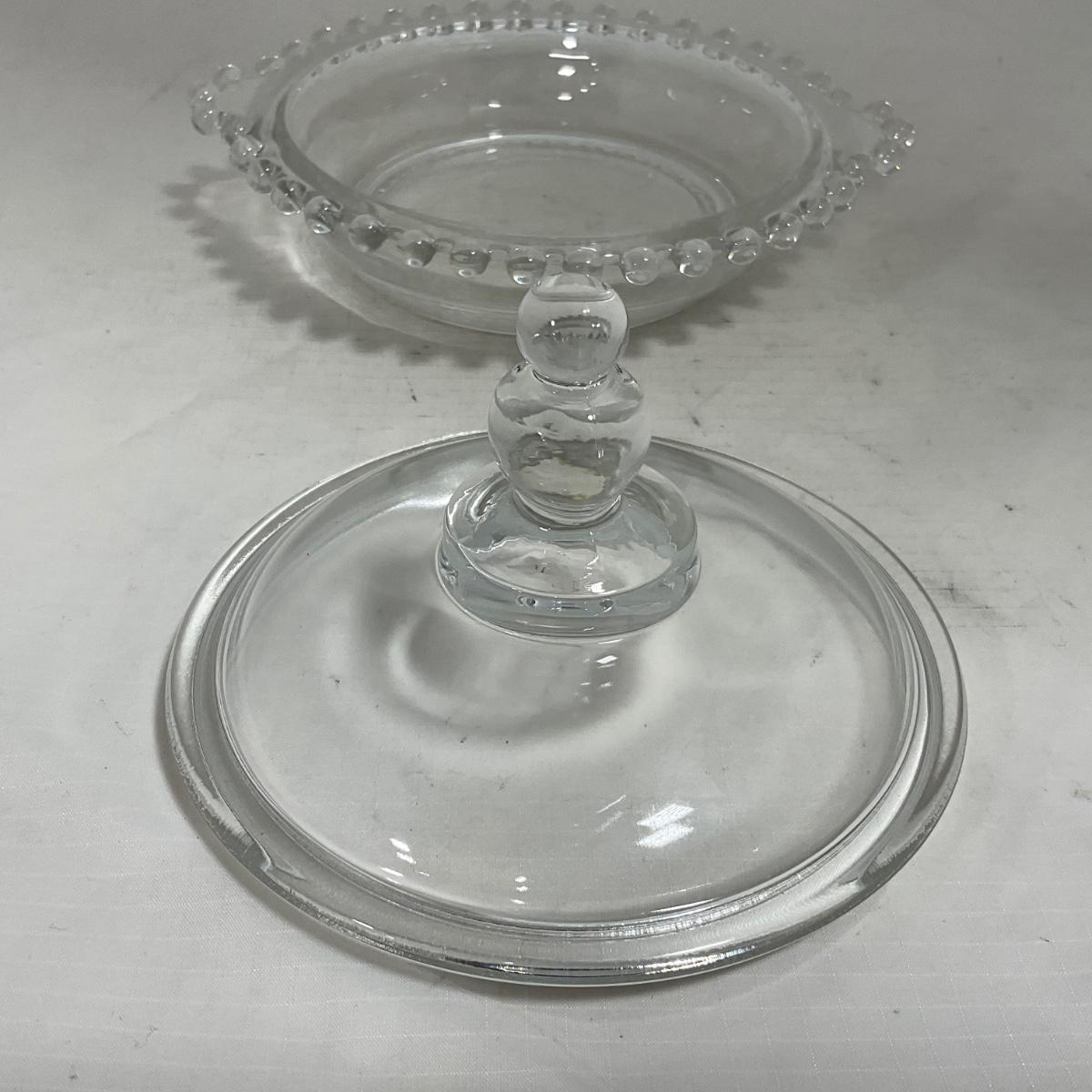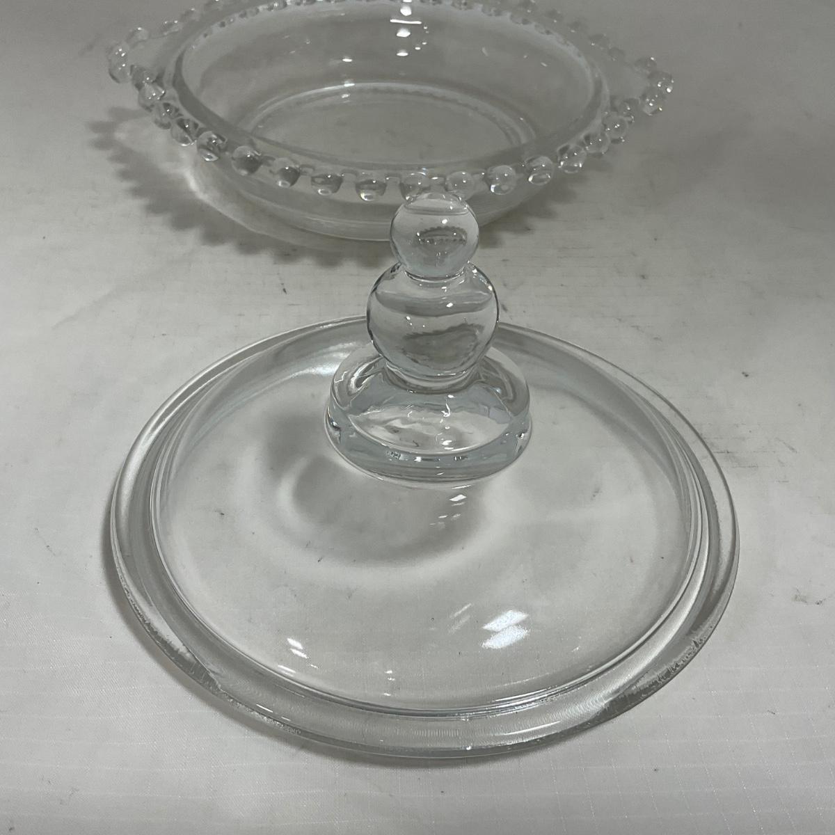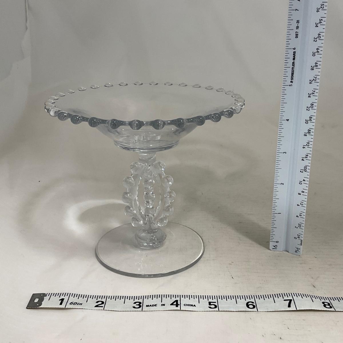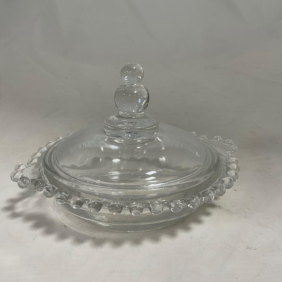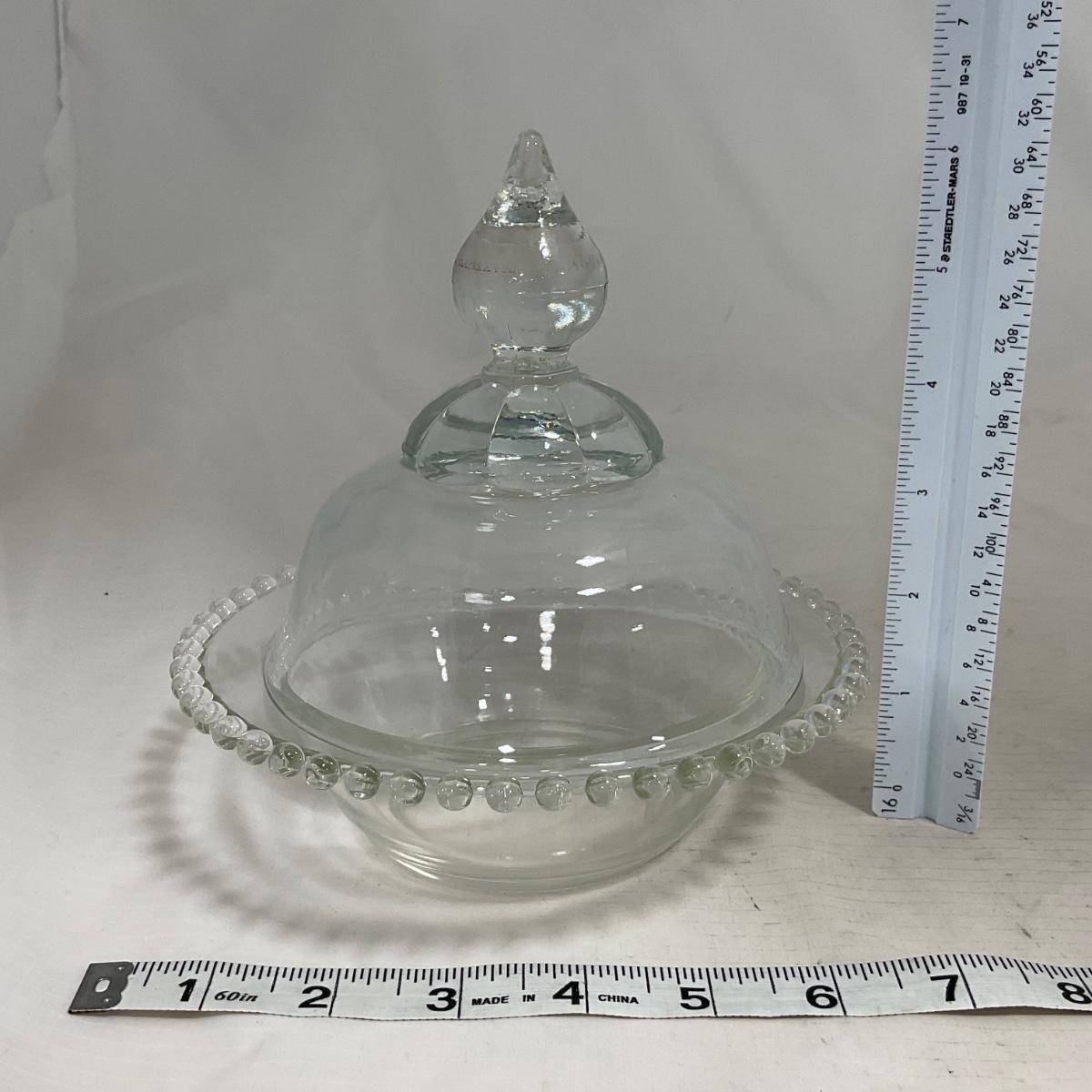 Candlewick styled clear glass set. Includes a larger sized covered butter dish a smaller sized covered butter dish, one pedestal dish, and a creamer and sugar set. This set is in good shape. Please see photos for details and condition. ::: Shipping is available on this lot. If you require shipping you must let us know at the close of the auction. We will coordinate with you after the item has been won. Shipping fees will include insurance up to or exceeding the value of all items being mailed. If you have any questions regarding this lot please contact the auctioneer either via this website, by direct email or by phone. PICK UP TIMES and other important information can be found in the TERMS and DESCRIPTION of the auction. Please take a look for pertinent information. Thanks!