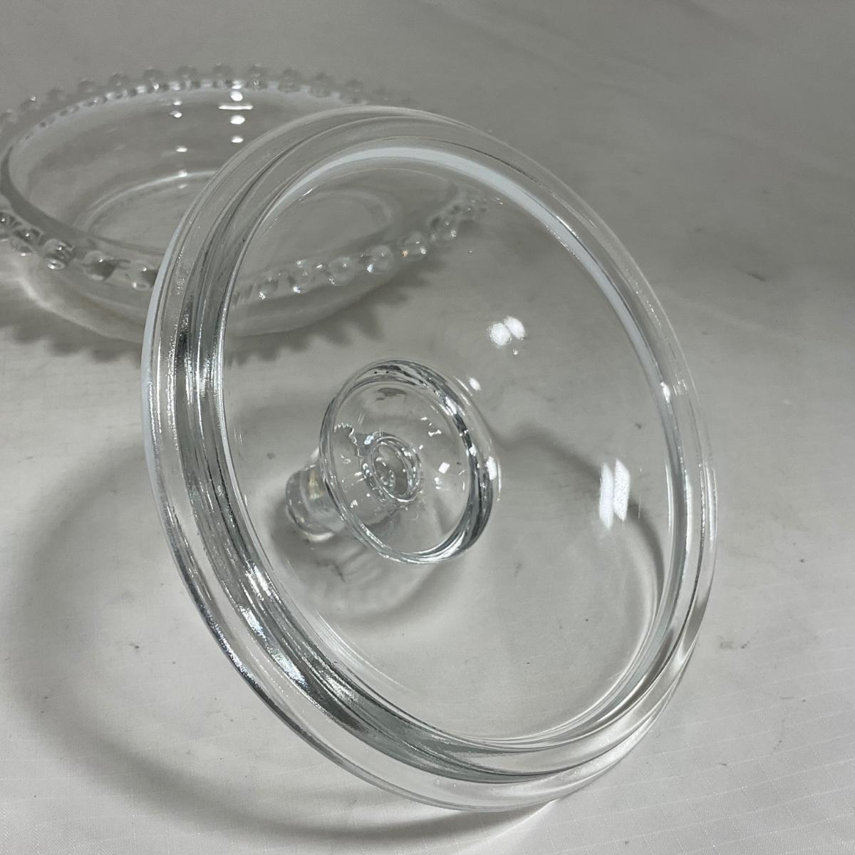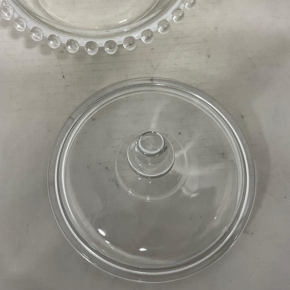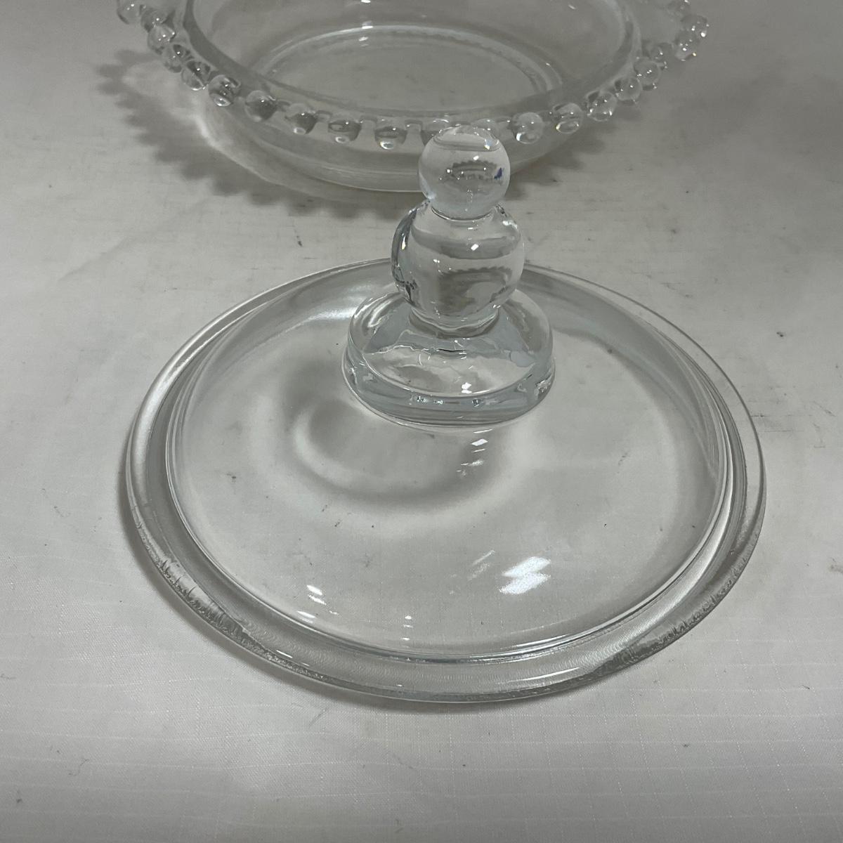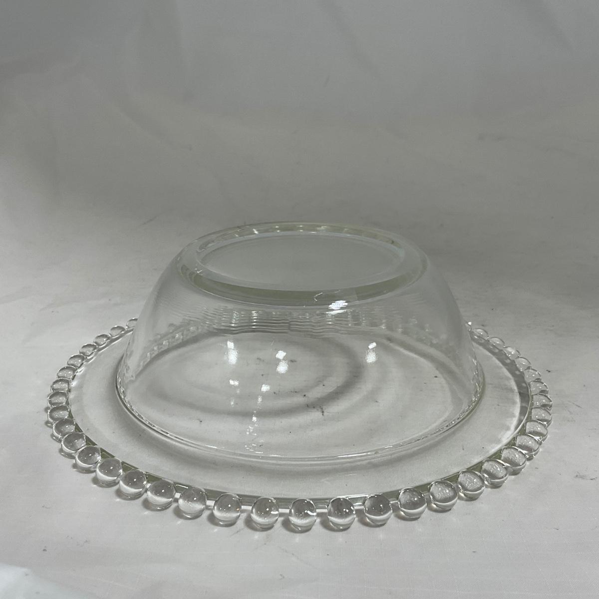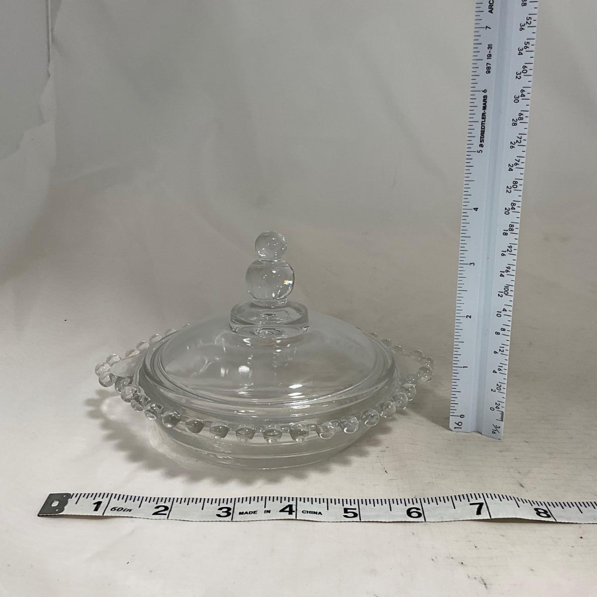 Candlewick styled clear glass set. Includes a larger sized covered butter dish a smaller sized covered butter dish, one pedestal dish, and a creamer and sugar set. This set is in good shape. Please see photos for details and condition. ::: Shipping is available on this lot. If you require shipping you must let us know at the close of the auction. We will coordinate with you after the item has been won. Shipping fees will include insurance up to or exceeding the value of all items being mailed. If you have any questions regarding this lot please contact the auctioneer either via this website, by direct email or by phone. PICK UP TIMES and other important information can be found in the TERMS and DESCRIPTION of the auction. Please take a look for pertinent information. Thanks!