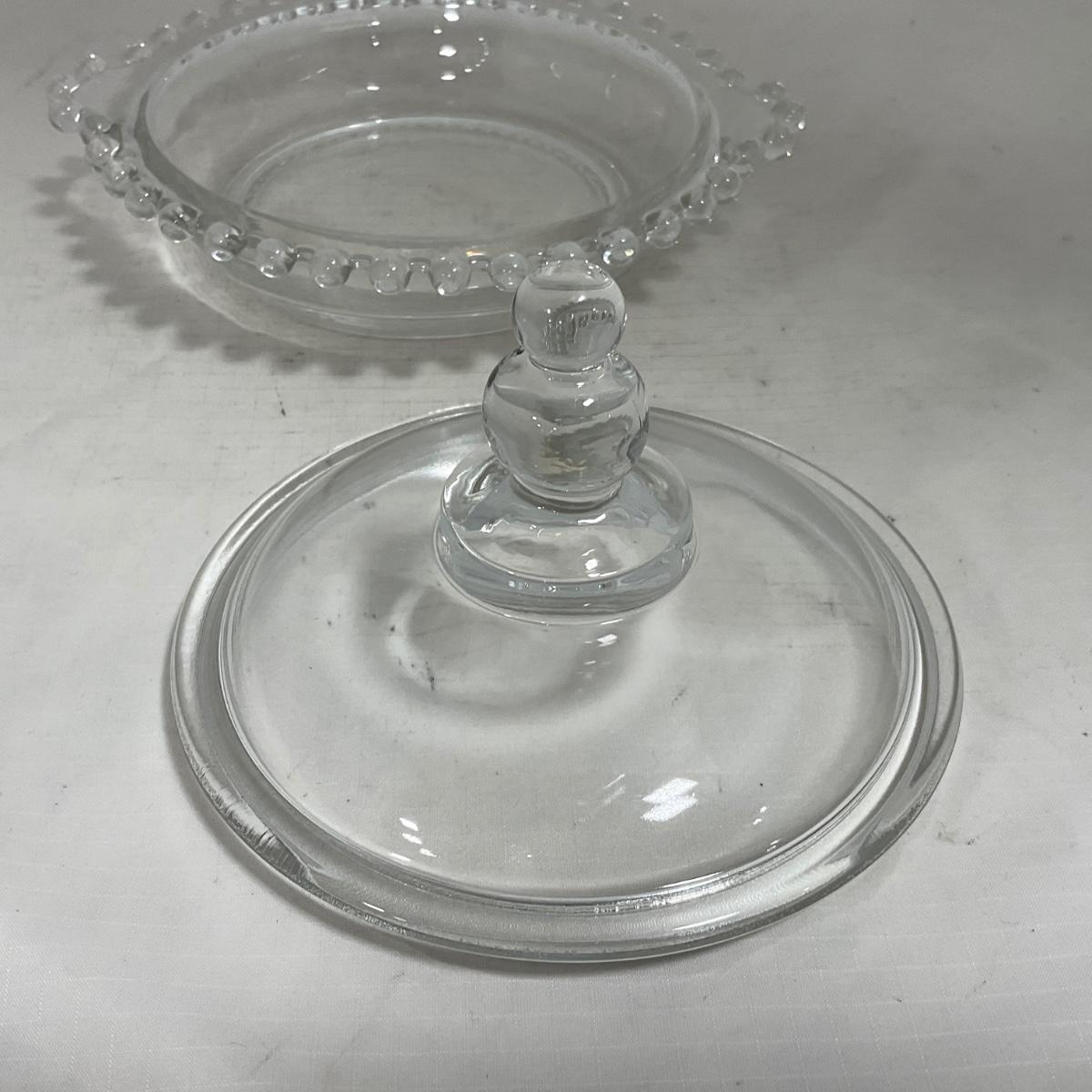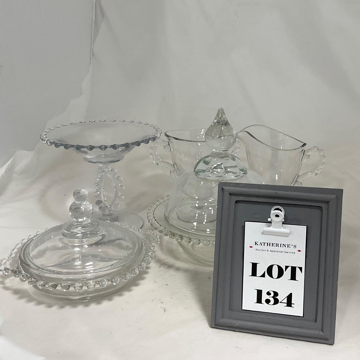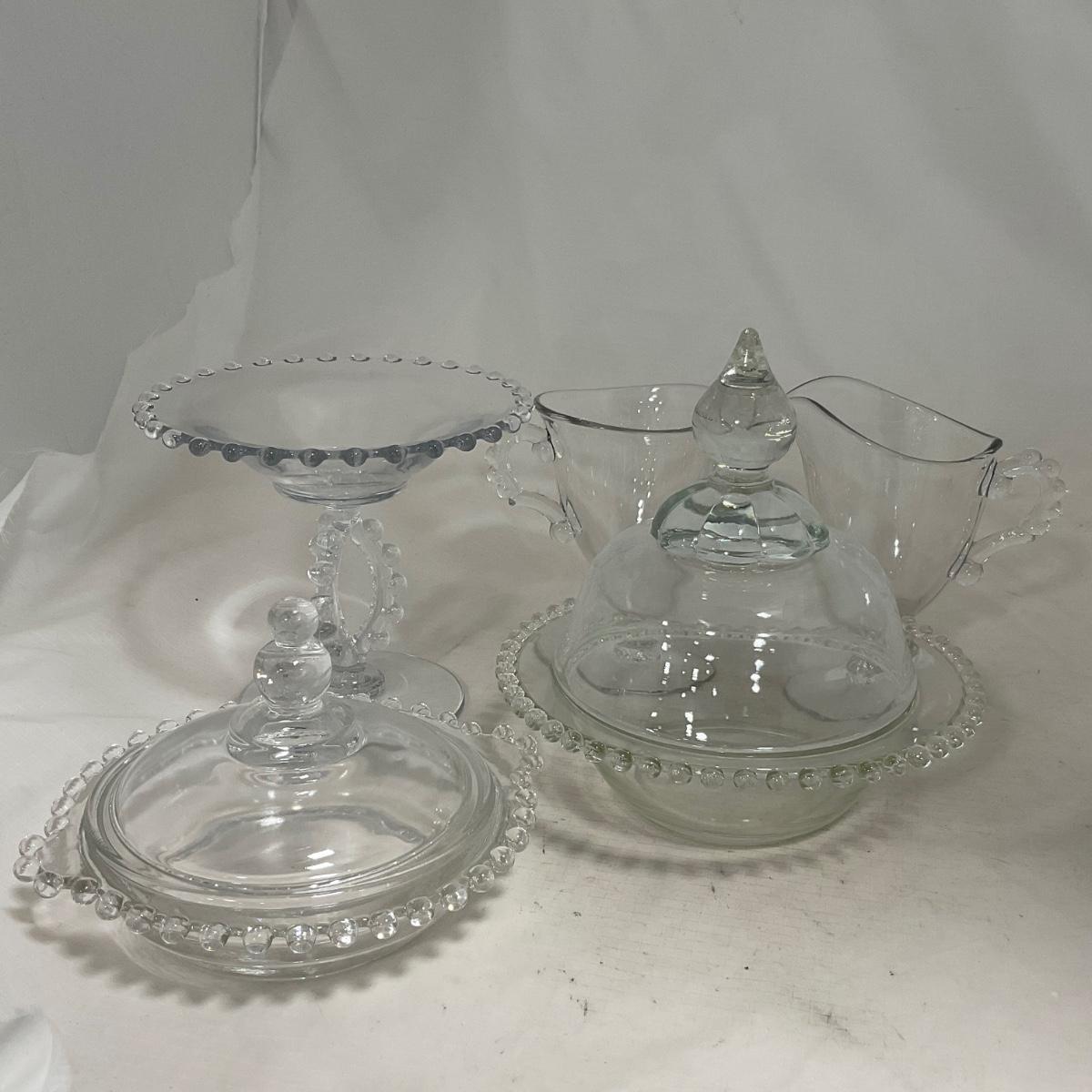 -134- Clear Glass | Candlewick Style | Two Covered Butter Dishes | Pedestal Dish | Creamer & Sugar