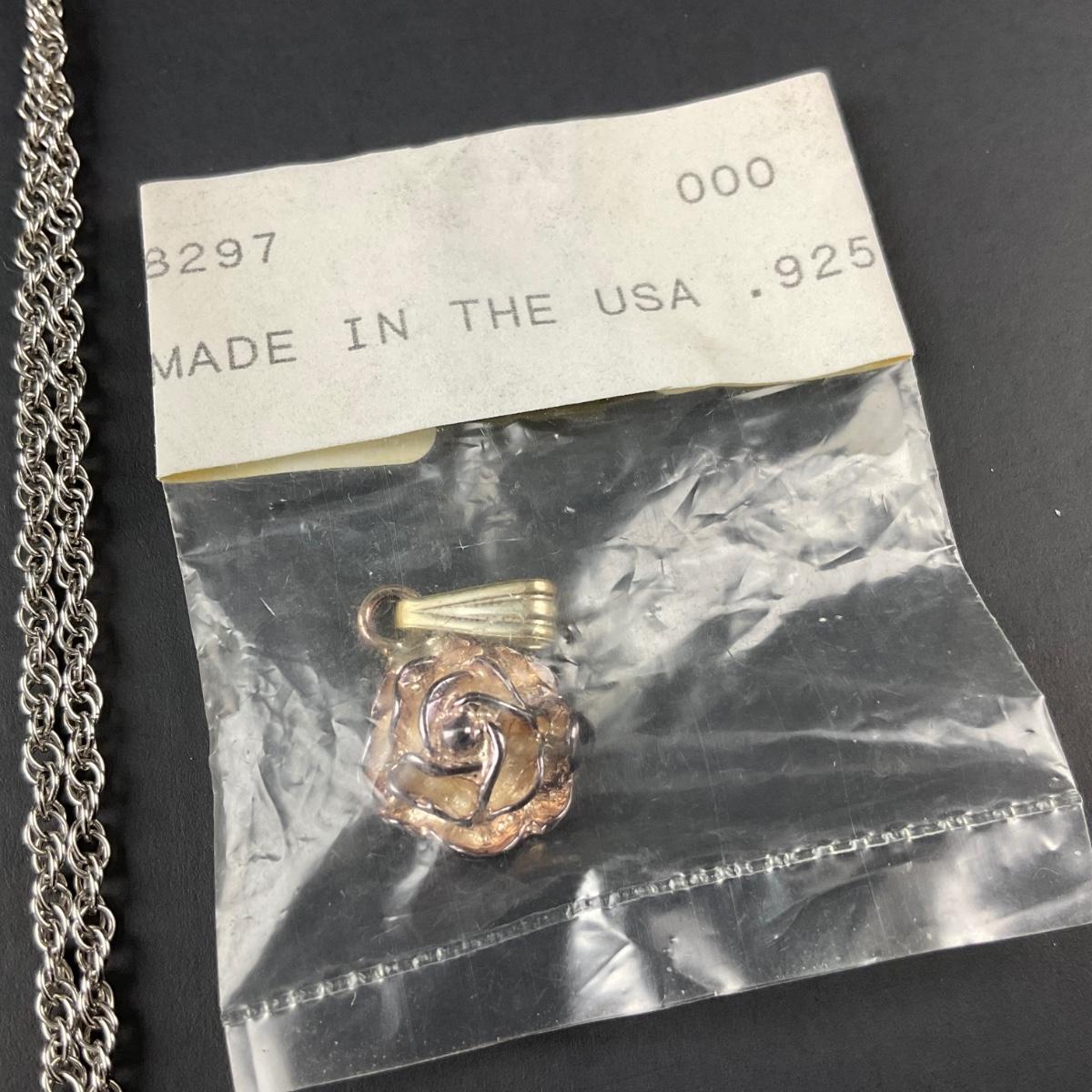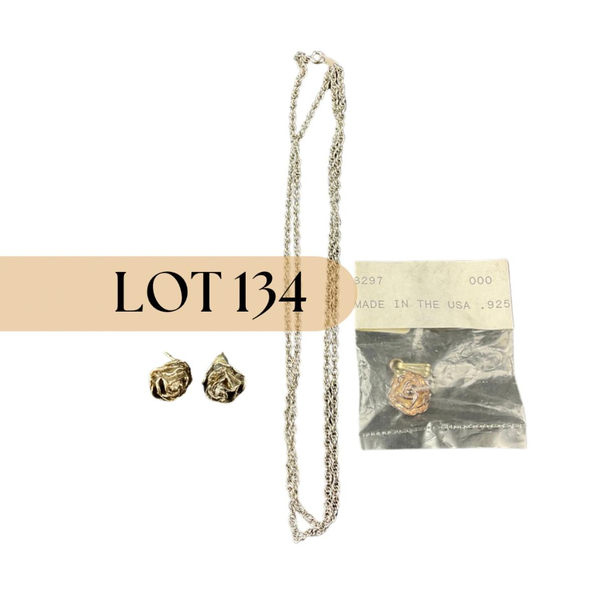 Four pieces of jewelry including one pair of sterling silver marked rose earrings. One sterling silver marked rose pendant. And a miscellaneous chain. This piece does have some scuffs, scratches, marks, or slight damage, but otherwise appears to be in great shape. Please see photos for details and condition. Any condition statement is given as a courtesy to a client, is an opinion, and should not be treated as a statement of fact. Reference to condition written, oral or within a condition report shall not be regarded as a full account of condition and may not include all defects, alterations, or restorations. Absence of a condition report does not imply a lot is flawless or lacking imperfections or damage. Katherine’s Auction & Appraisal Service shall have no responsibility for any error or omission. Returns shall not be accepted on the basis of condition. ::: Shipping is available on this lot. If you require shipping you must let us know at the close of the auction. We will coordinate with you after the item has been won. Shipping fees will include insurance up to or exceeding the value of all items being mailed. If you have any questions regarding this lot please contact the auctioneer either via this website, by direct email or by phone. PICK UP TIMES and other important information can be found in the TERMS and DESCRIPTION of the auction. Please take a look for pertinent information. Thanks!