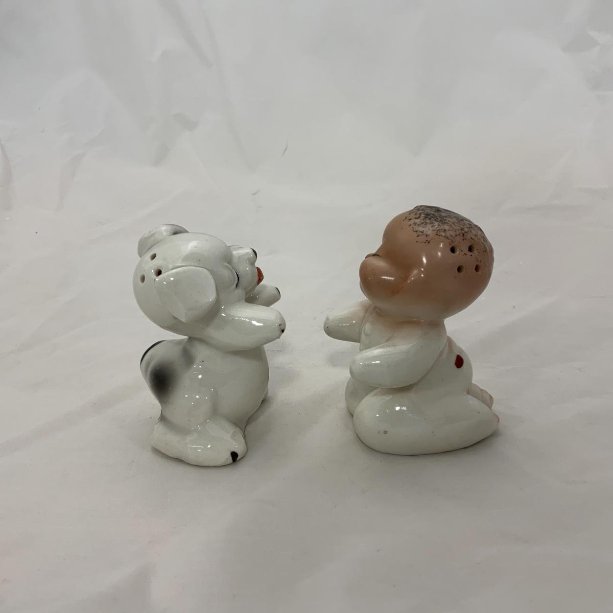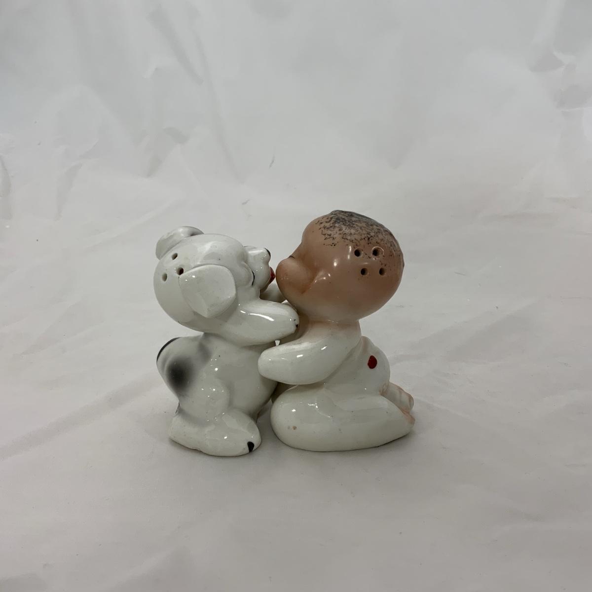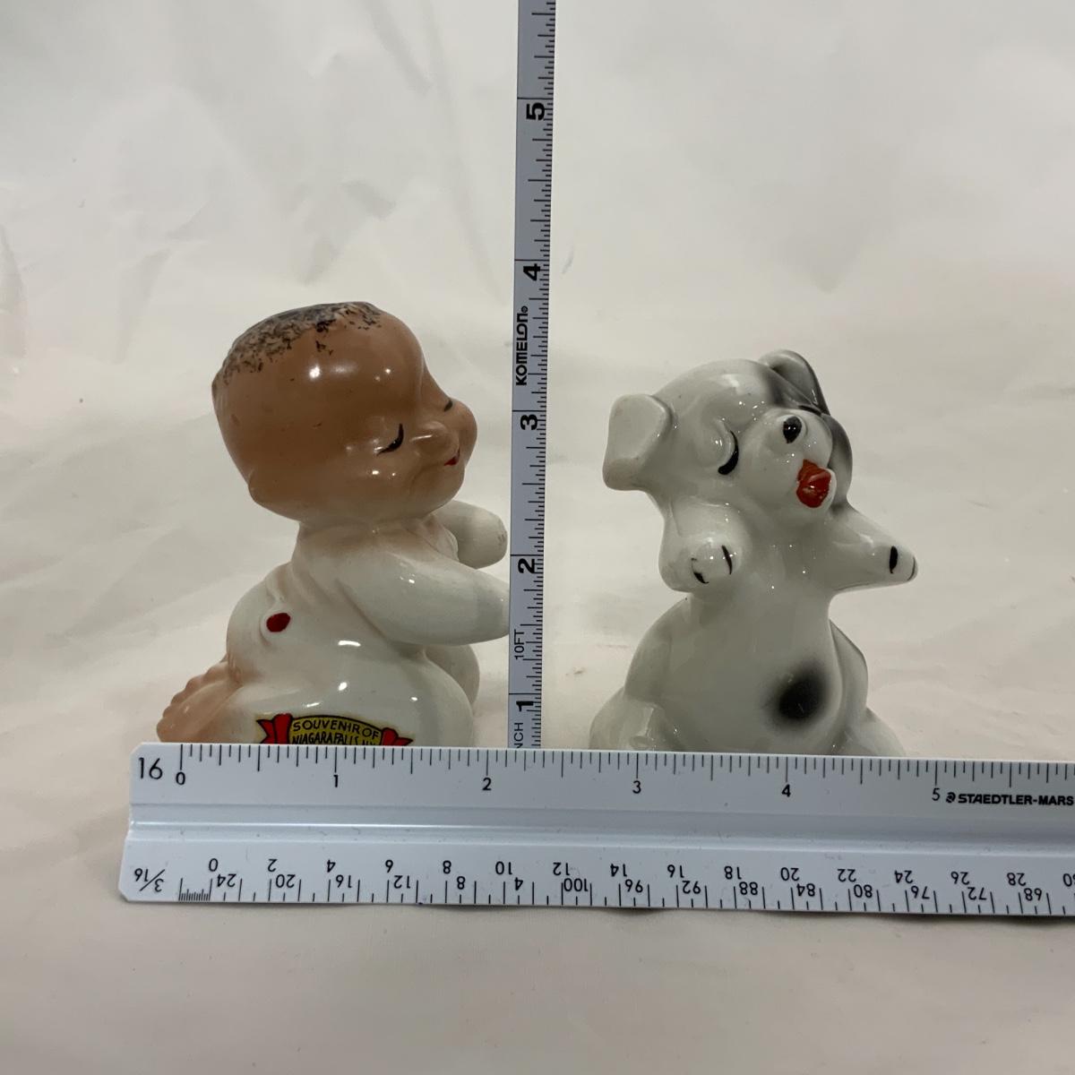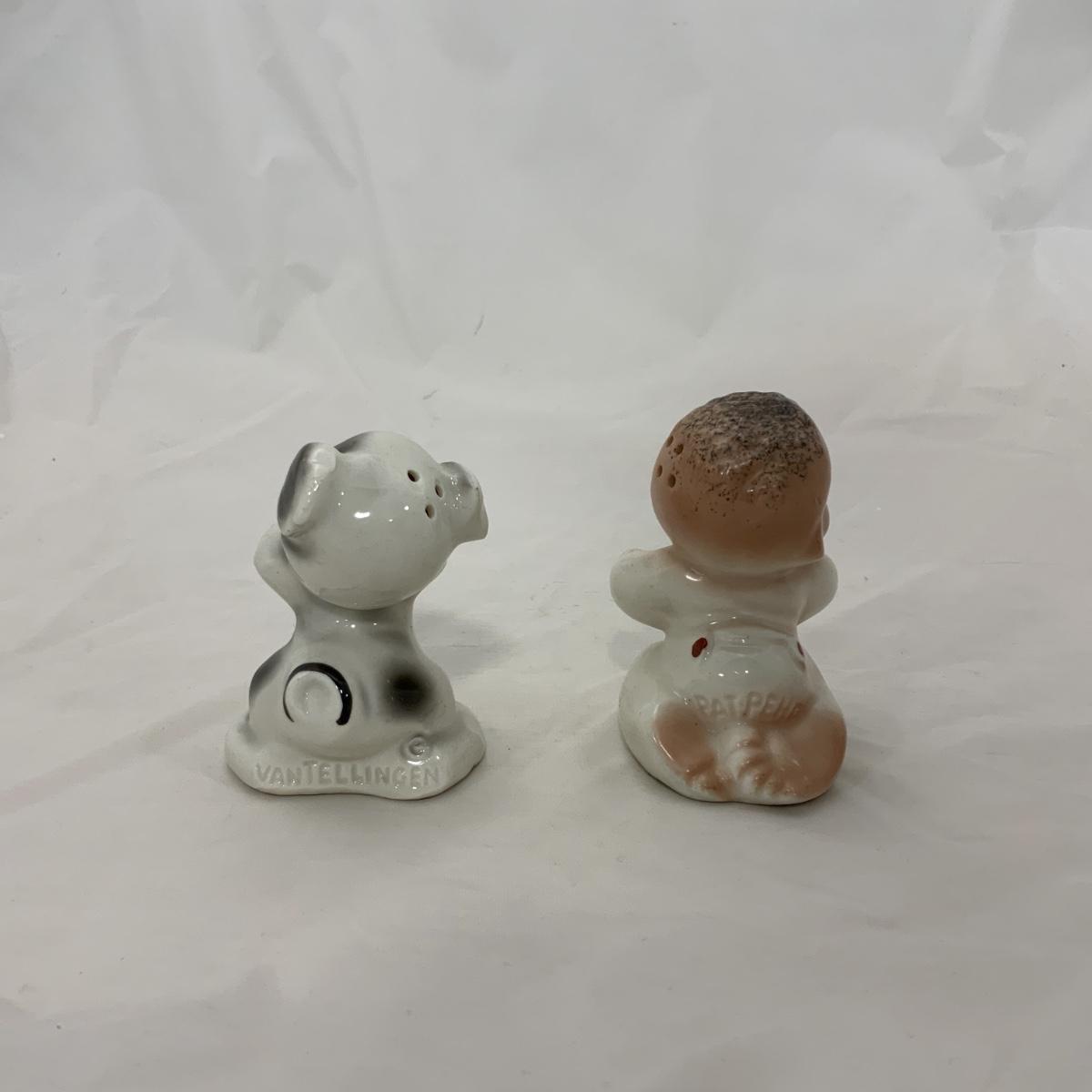 From the Estate of Peter and Alice Radovanovich: Nice set of 1950s Van Tellingen Boy and Dog Huggies. There is a manufacturing flaw on the boy, he has a crack in the bend of his arm, and at the base of the shaker. These Shakers are a souvenir from Niagara Falls. Please see photos for details and condition. ::: Shipping is available on this lot. If you require shipping you must let us know at the close of the auction. We will coordinate with you after the item has been won. Shipping fees will include insurance up to or exceeding the value of all items being mailed. If you have any questions regarding this lot please contact the auctioneer either via this website, by direct email or by phone. PICK UP TIMES and other important information can be found in the TERMS and DESCRIPTION of the auction. Please take a look for pertinent information. Thanks!