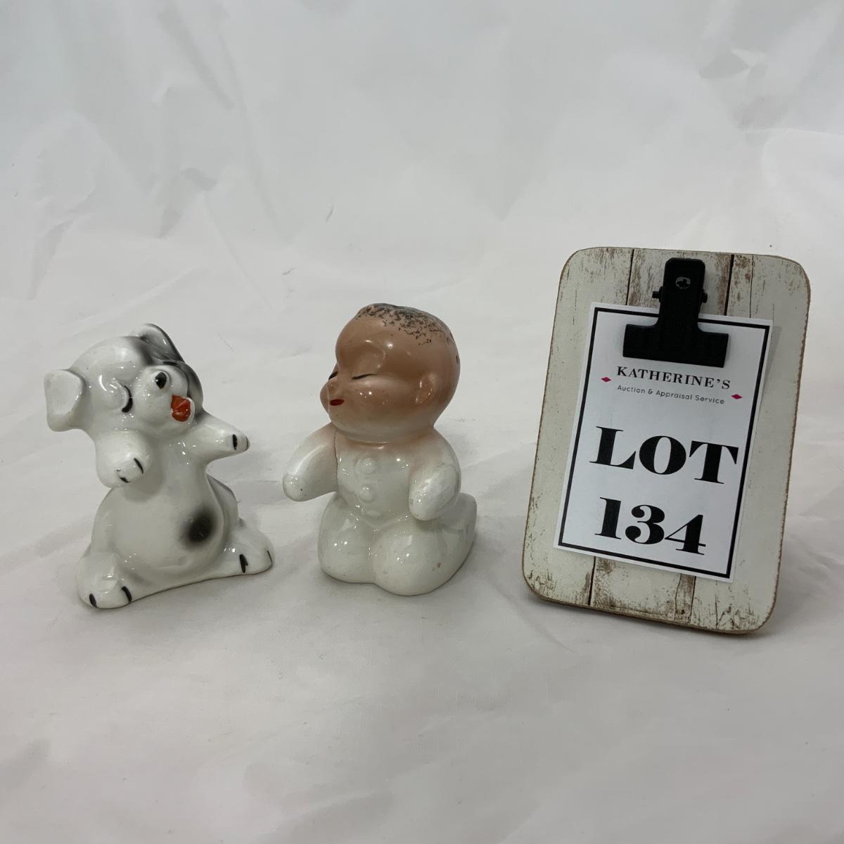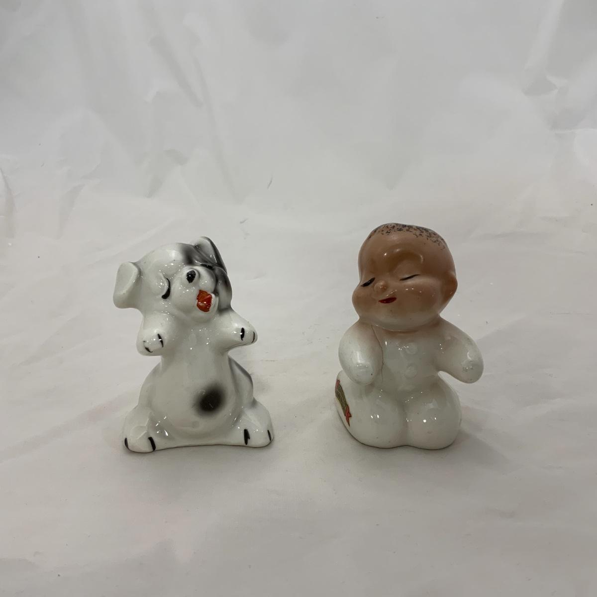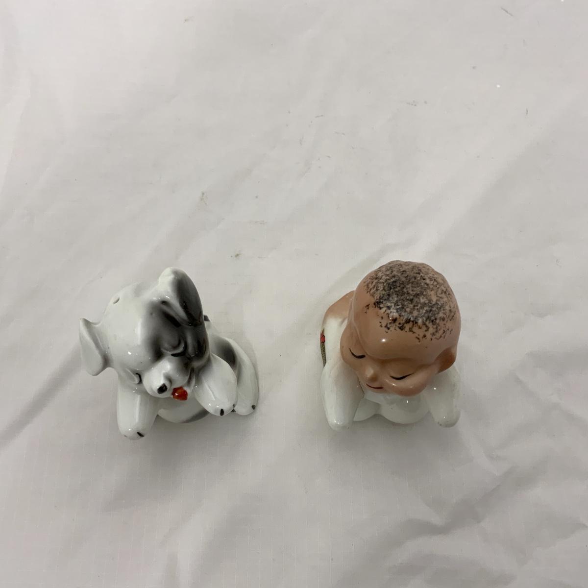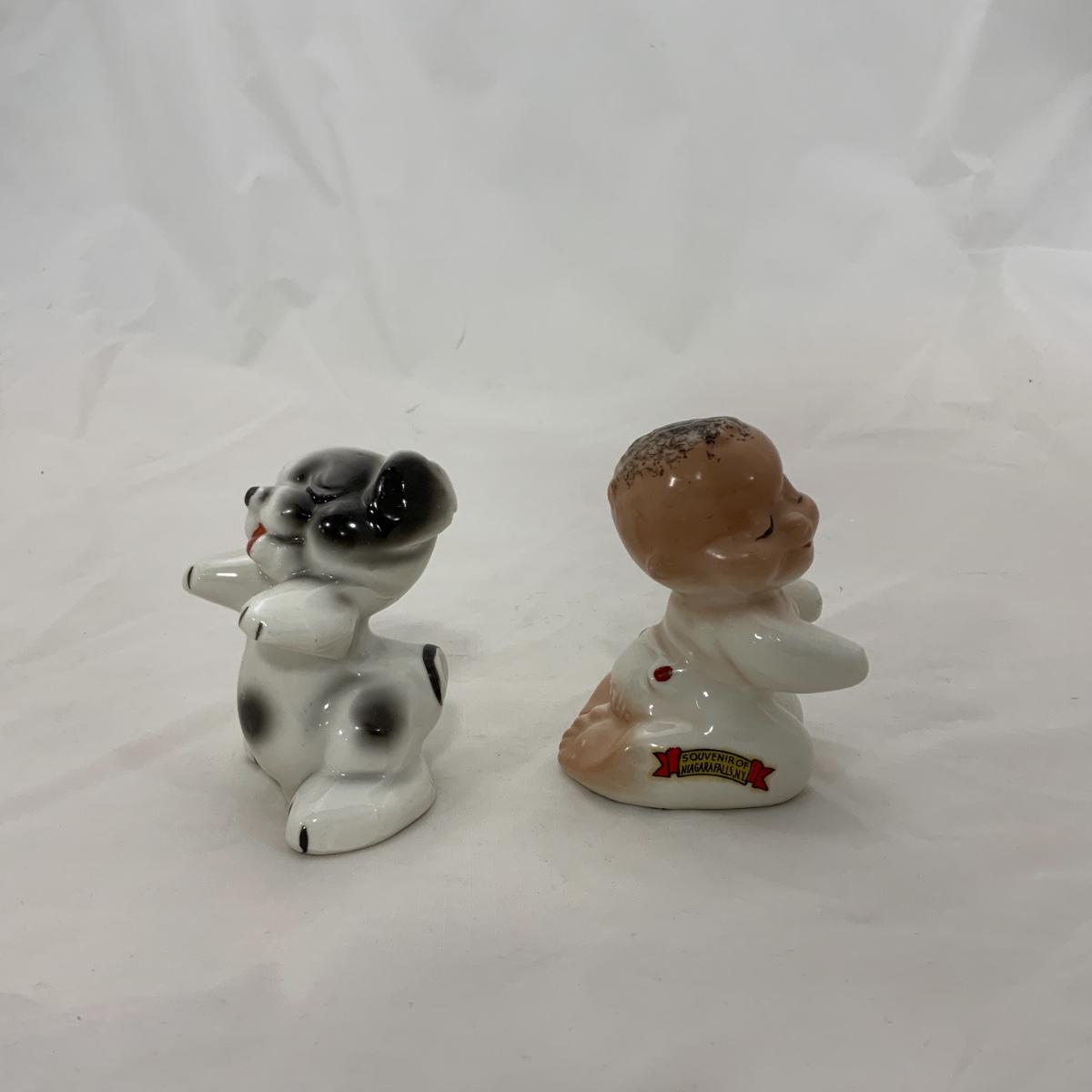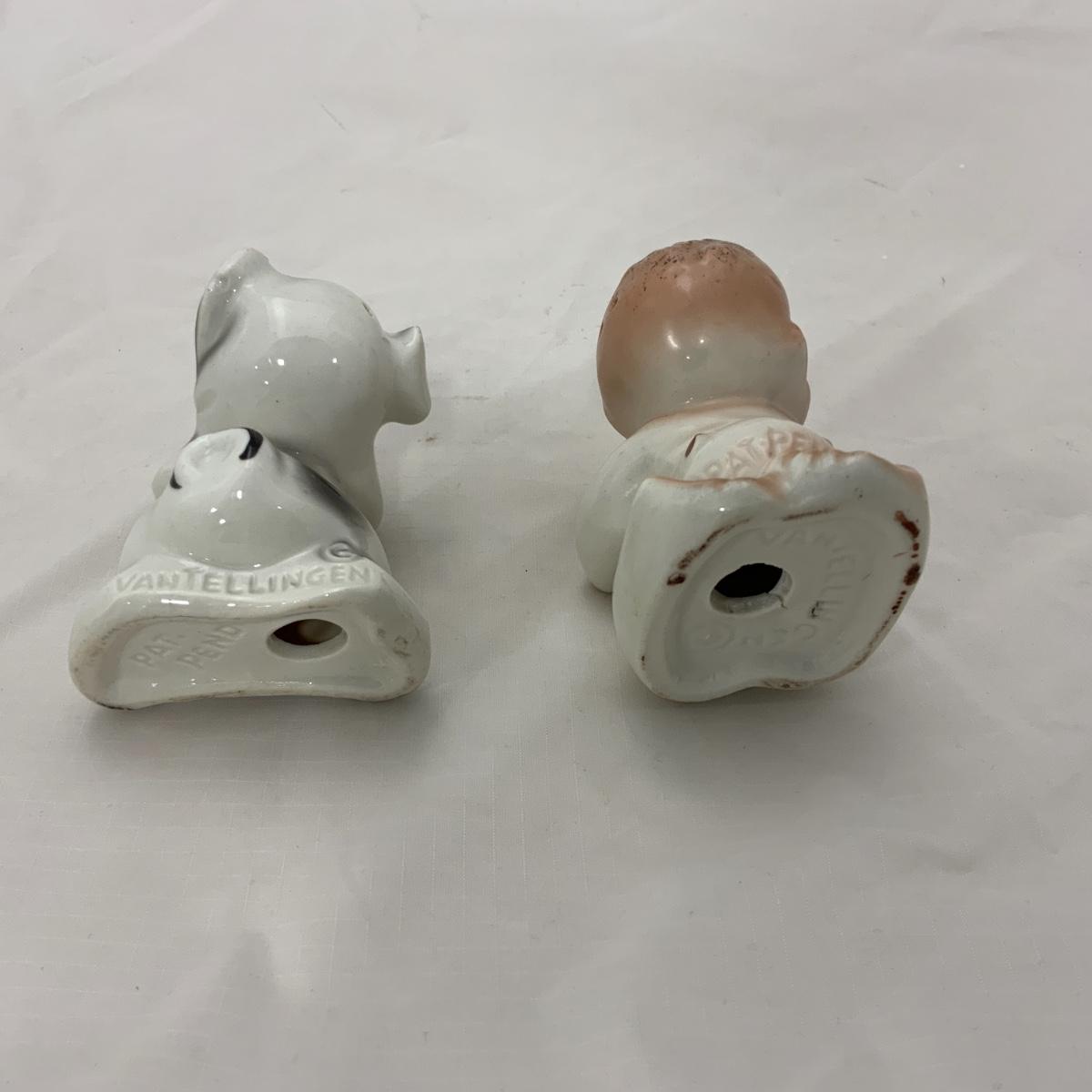 From the Estate of Peter and Alice Radovanovich: Nice set of 1950s Van Tellingen Boy and Dog Huggies. There is a manufacturing flaw on the boy, he has a crack in the bend of his arm, and at the base of the shaker. These Shakers are a souvenir from Niagara Falls. Please see photos for details and condition. ::: Shipping is available on this lot. If you require shipping you must let us know at the close of the auction. We will coordinate with you after the item has been won. Shipping fees will include insurance up to or exceeding the value of all items being mailed. If you have any questions regarding this lot please contact the auctioneer either via this website, by direct email or by phone. PICK UP TIMES and other important information can be found in the TERMS and DESCRIPTION of the auction. Please take a look for pertinent information. Thanks!