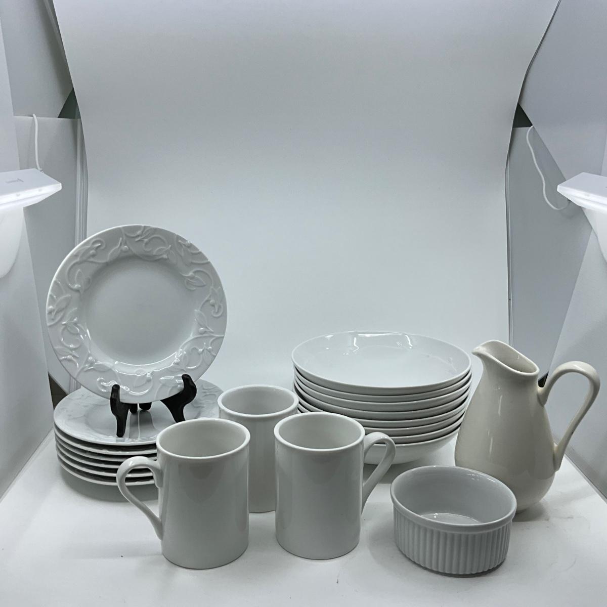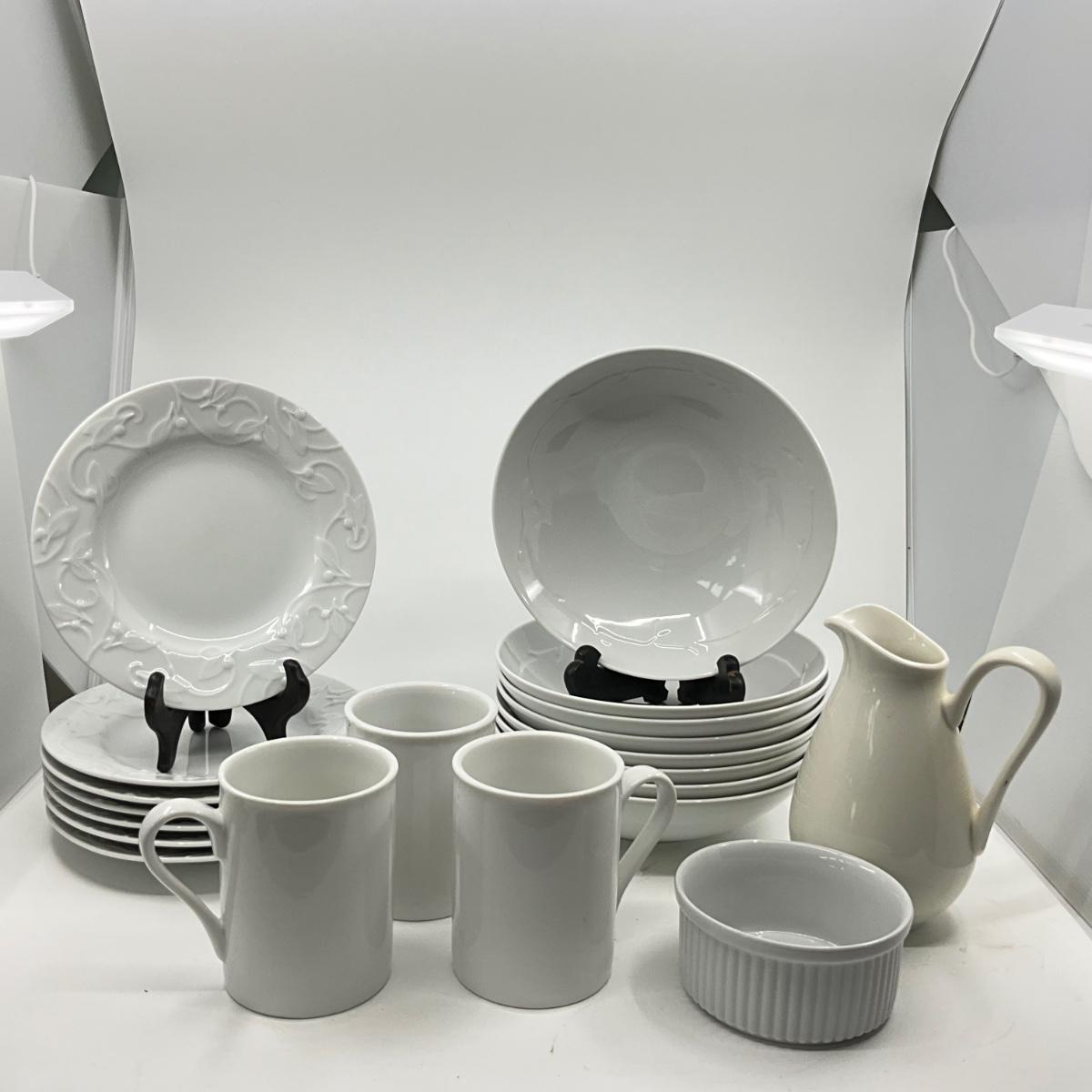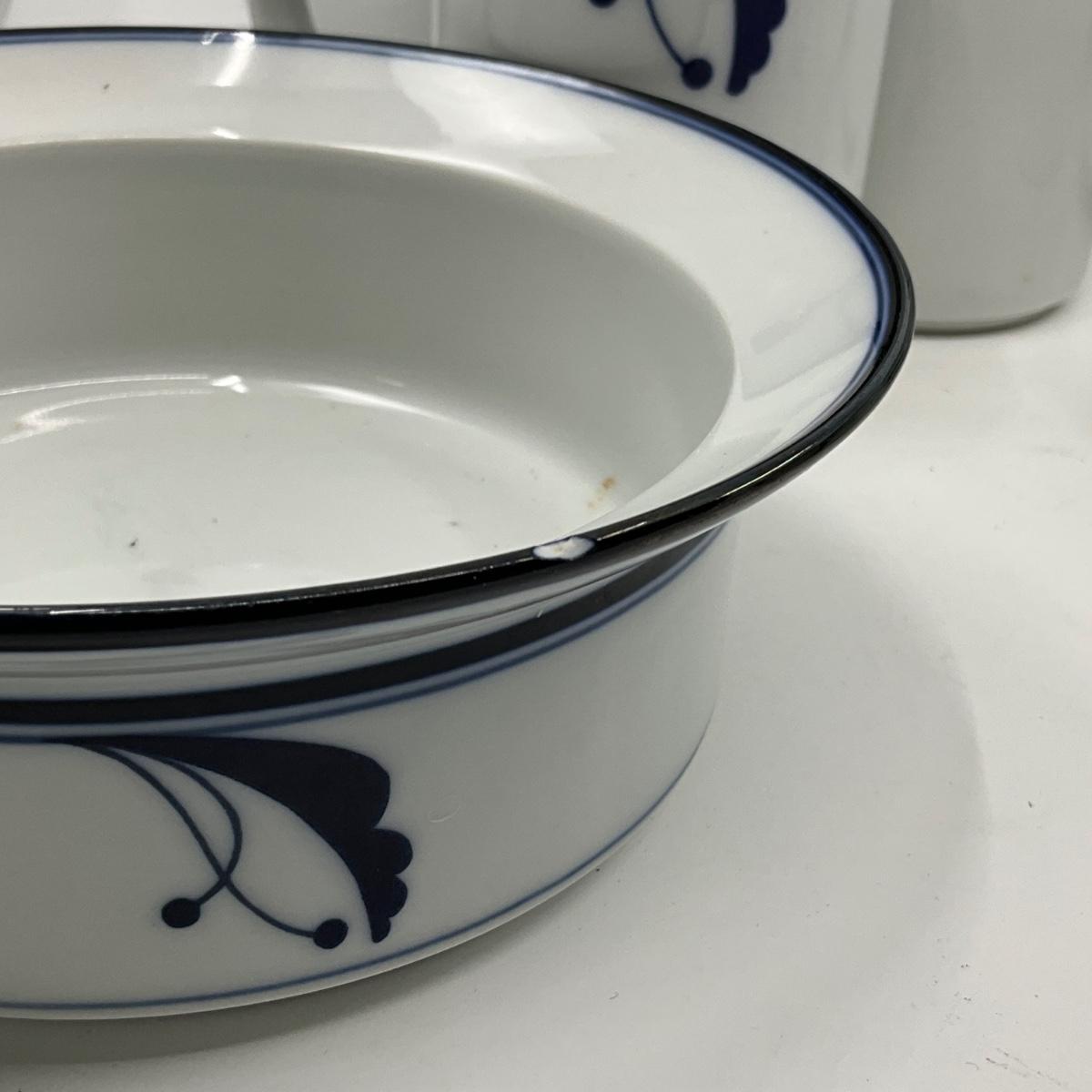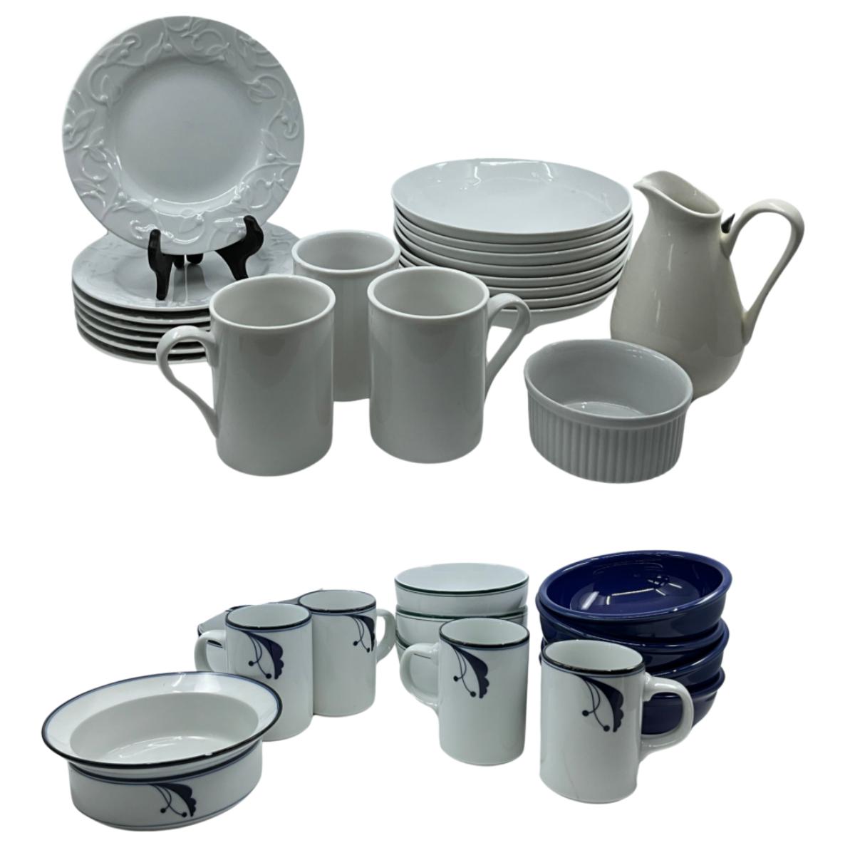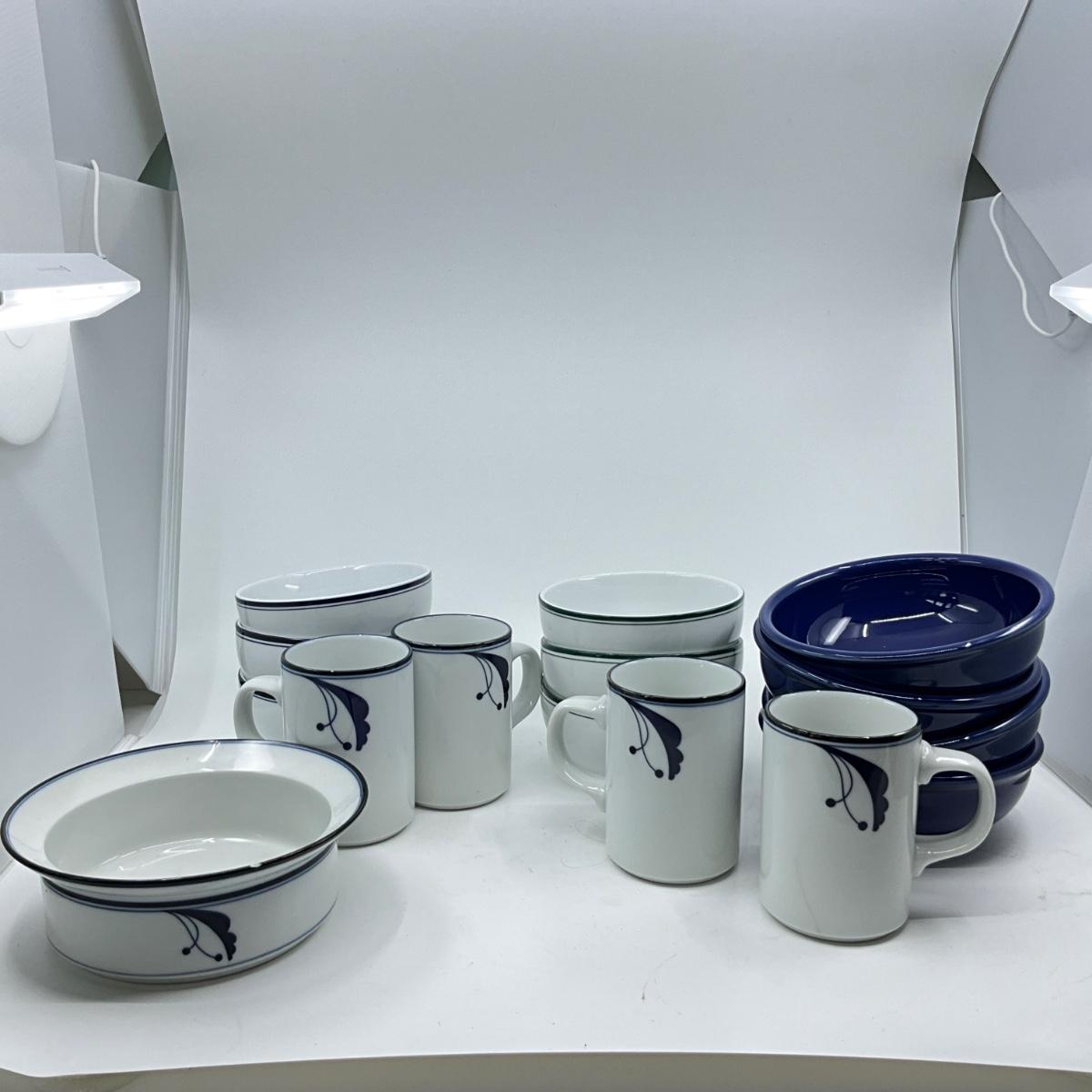 Blue and White Three bowls with 4 mugs and 3 solid blue bowls one rimmed soup bowl