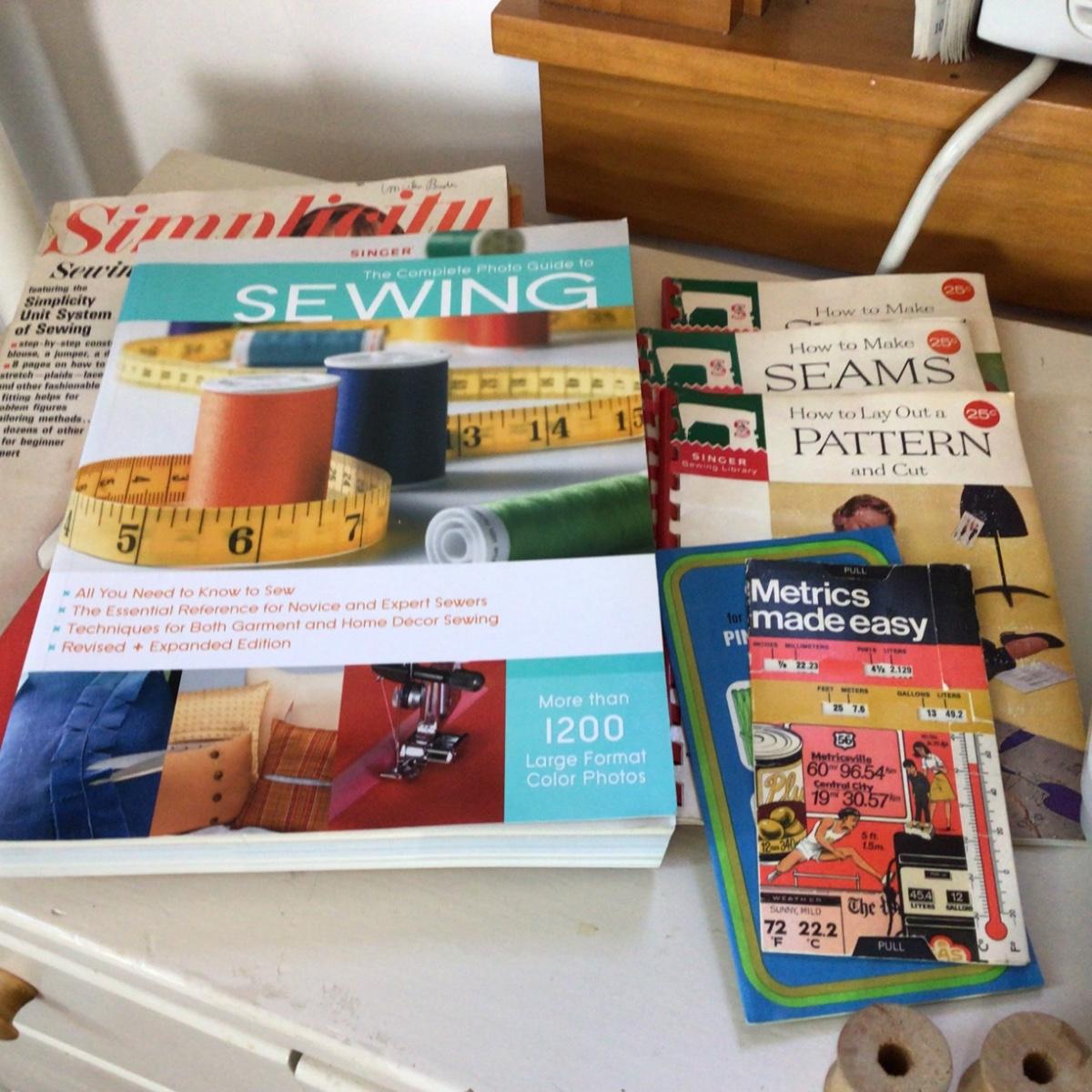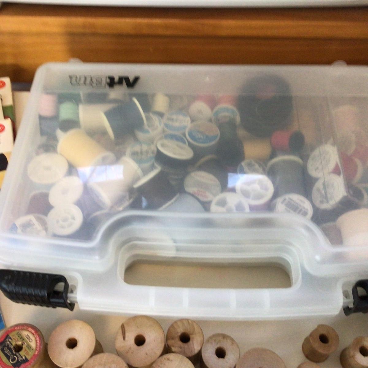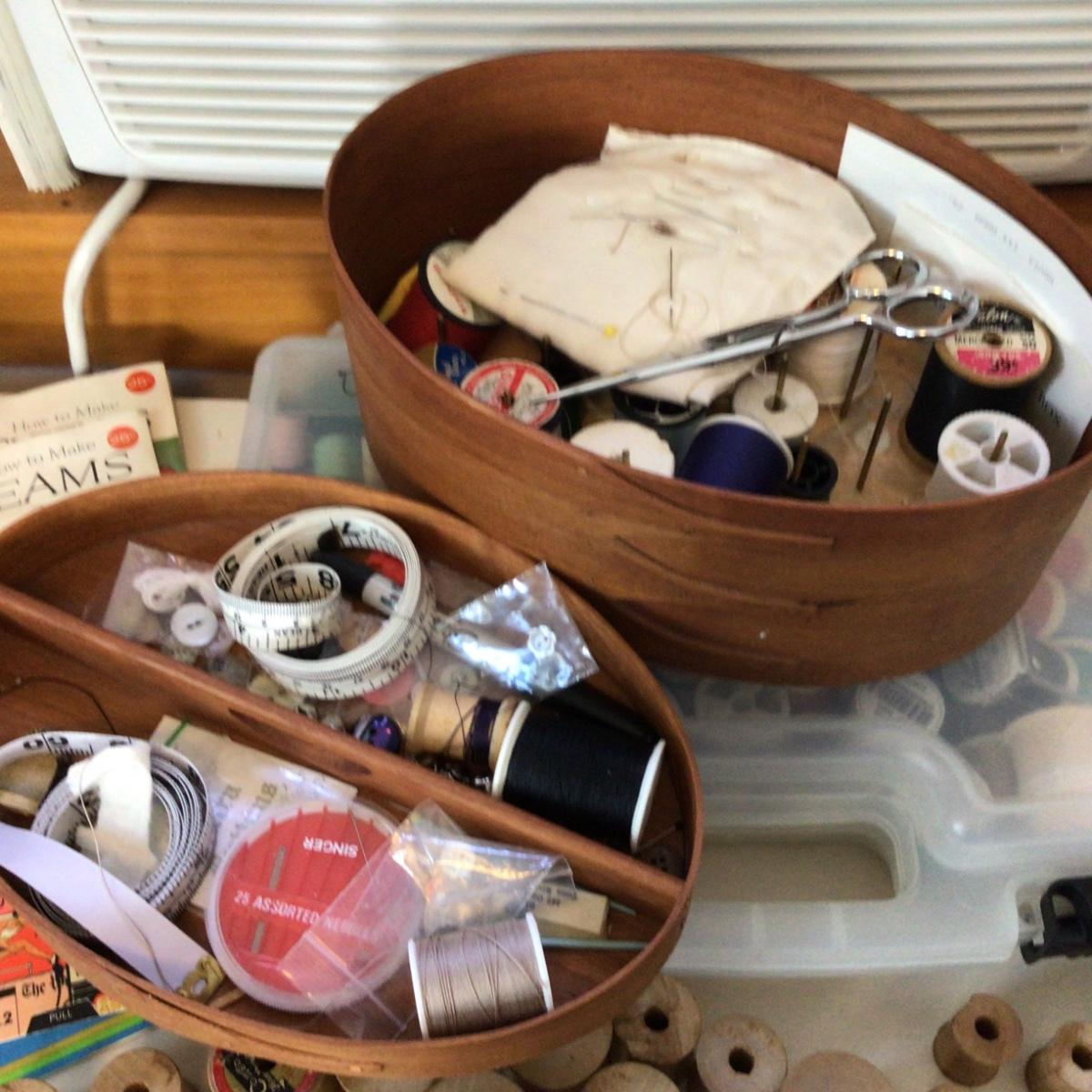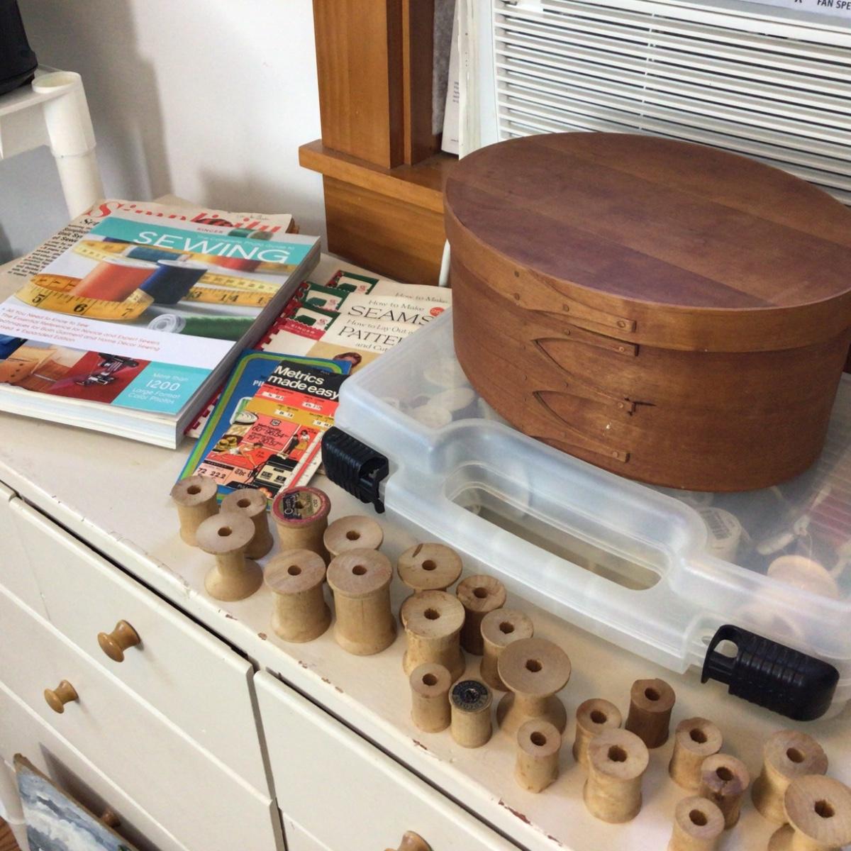 Lot contains sewing books, plastic container filled with various thread, vintage wooden spools and Shaker sewing box filled with various sewing items.