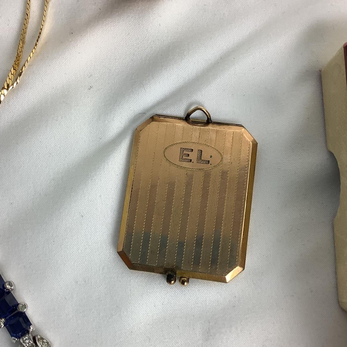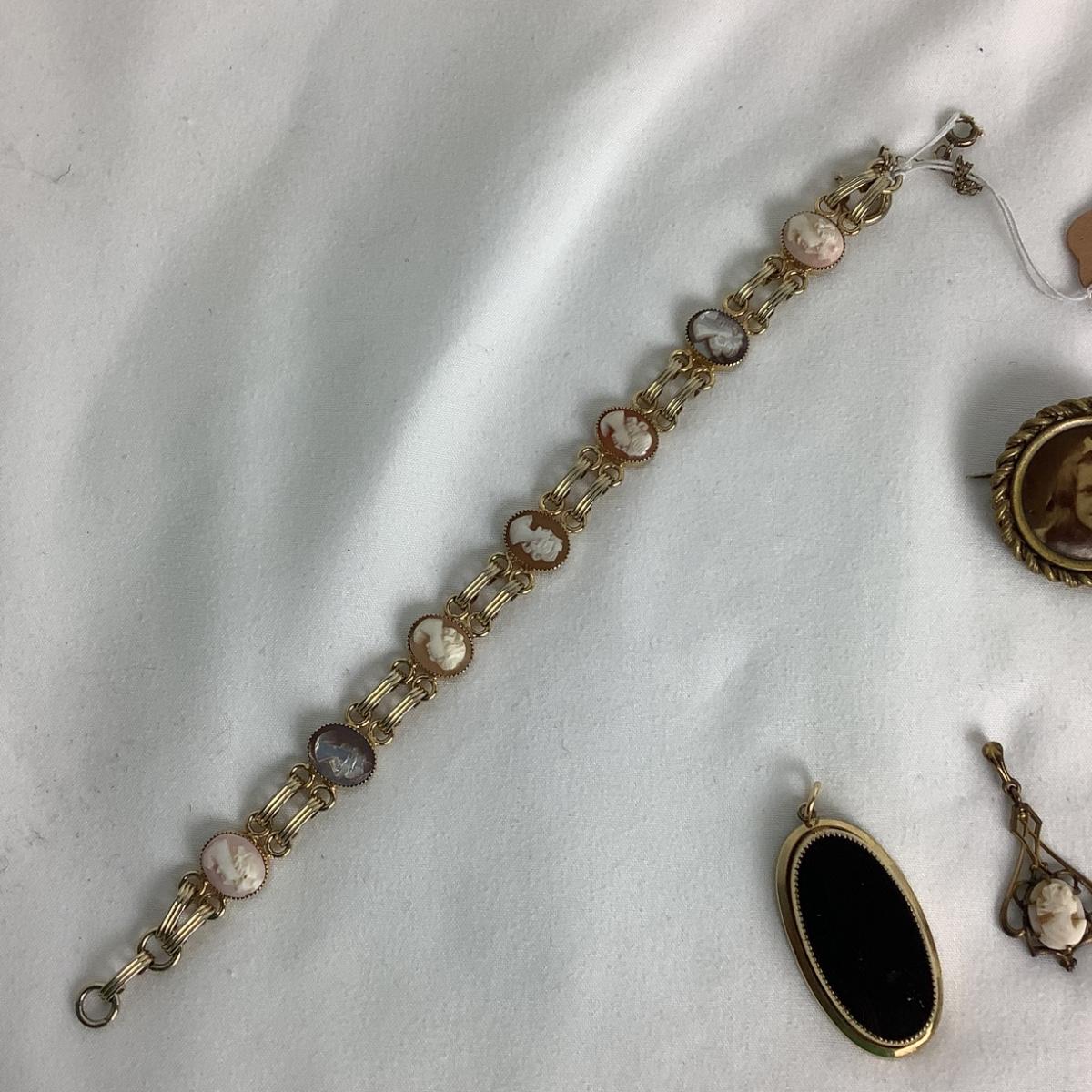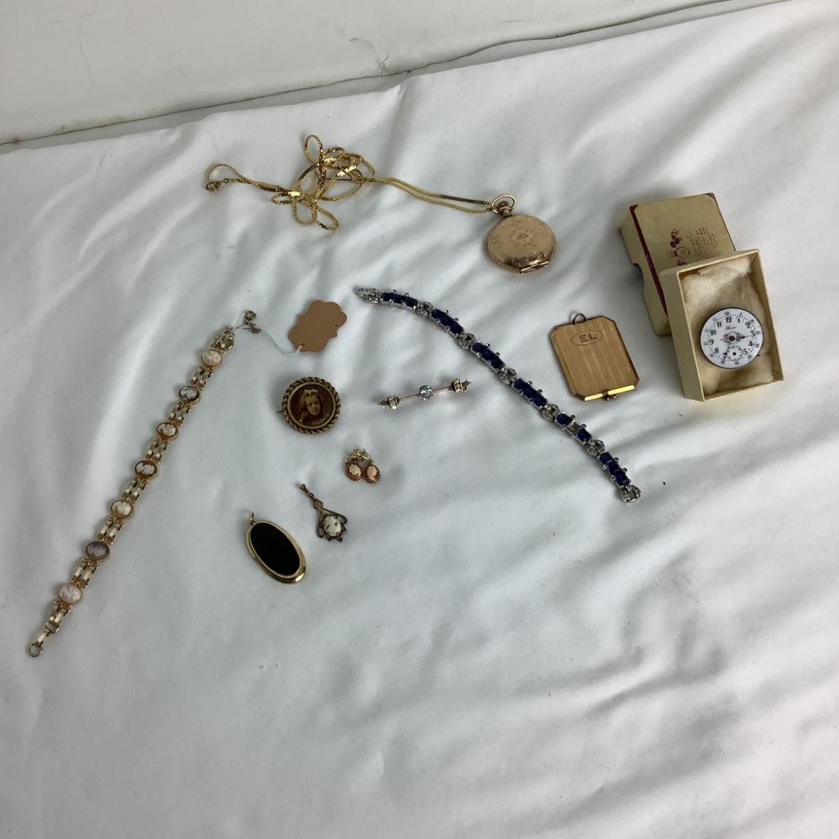 Ladies gold filled locket with parts, costume rhinestone and sapphire bracelet, gold filled black onyx pendant , brooch, and cameo bracelet with earring