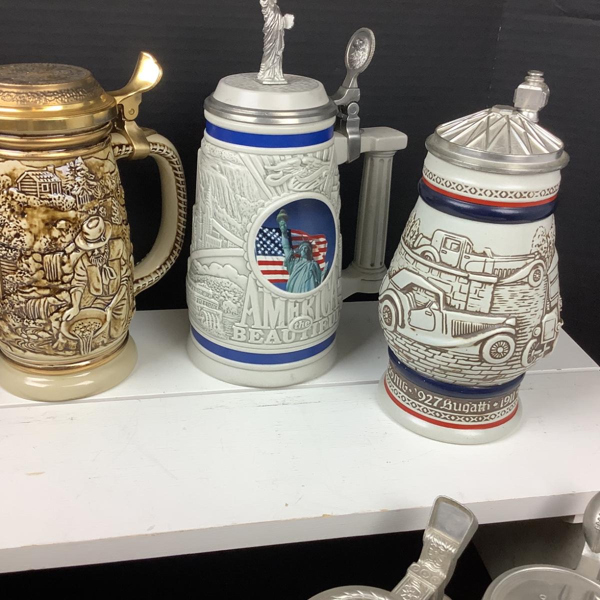 Ceramic steins with metal flip top lids, there are 10 in the lot.