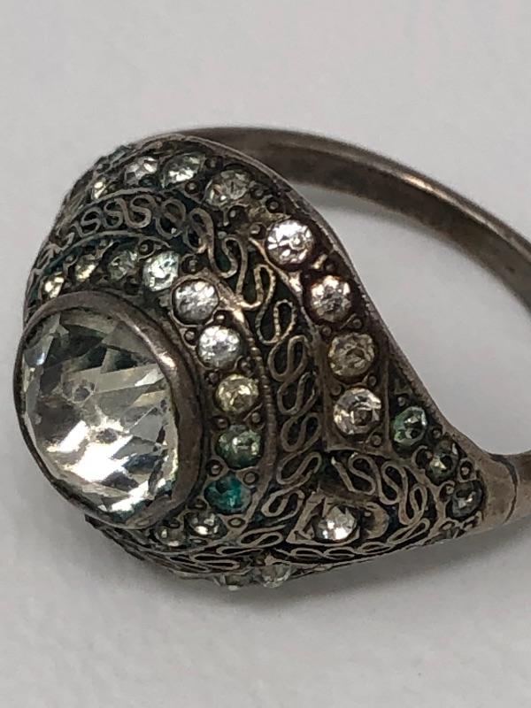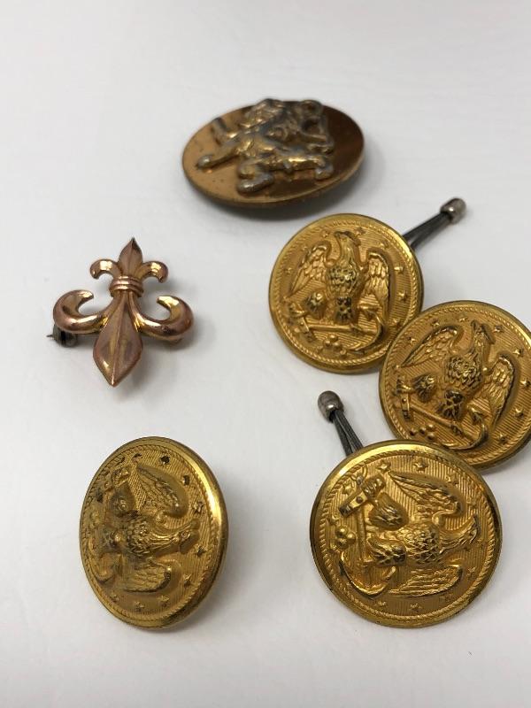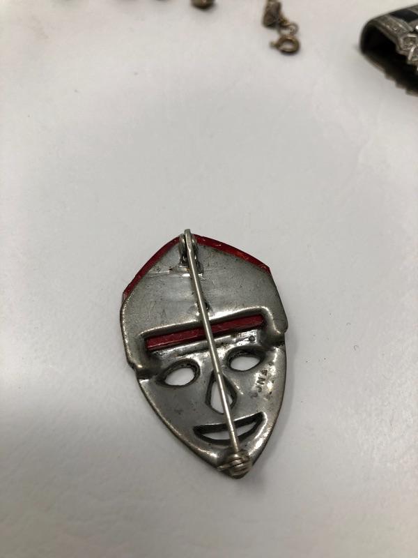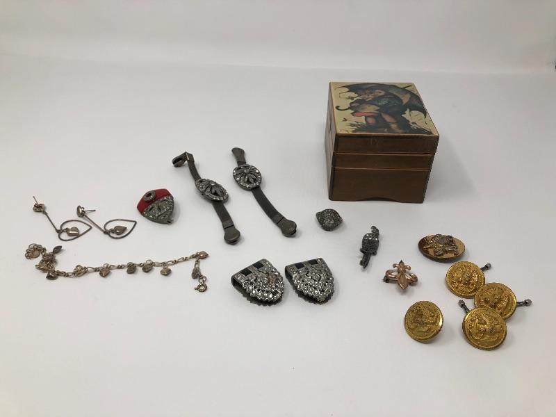 Art Deco rhinestone shoe clips, Hummel music box, Brooches, Girl Scout Pin, Vintage Ring and buttons.