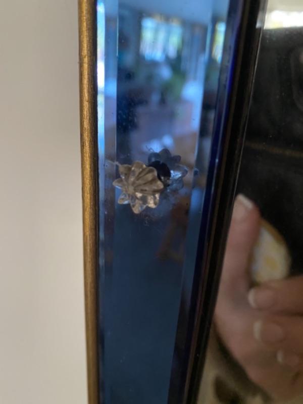 Antique Art Deco Period Blue Glass Frame Mirror with etched top and some decorative embellishments are broken