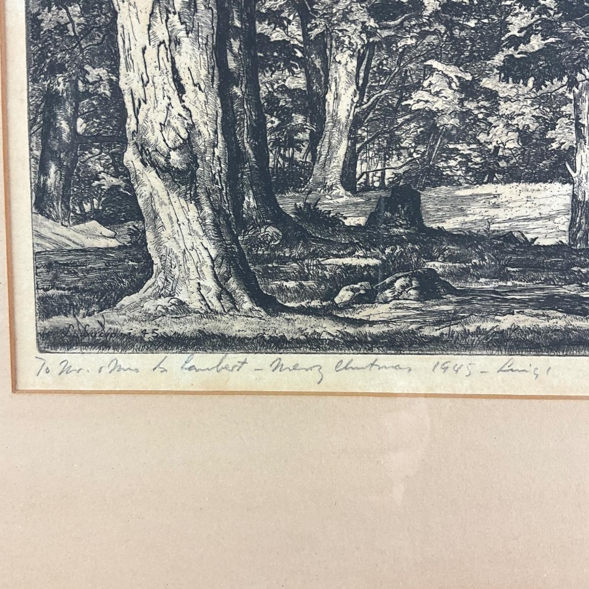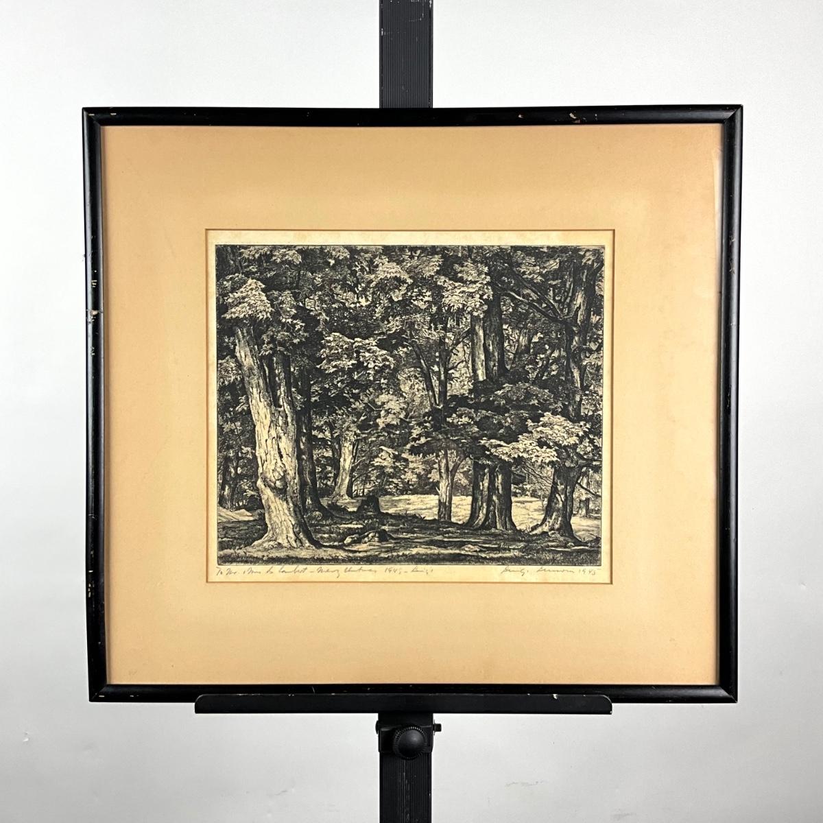 Original 20th-century etching depicting a tranquil forest interior with mature trees.