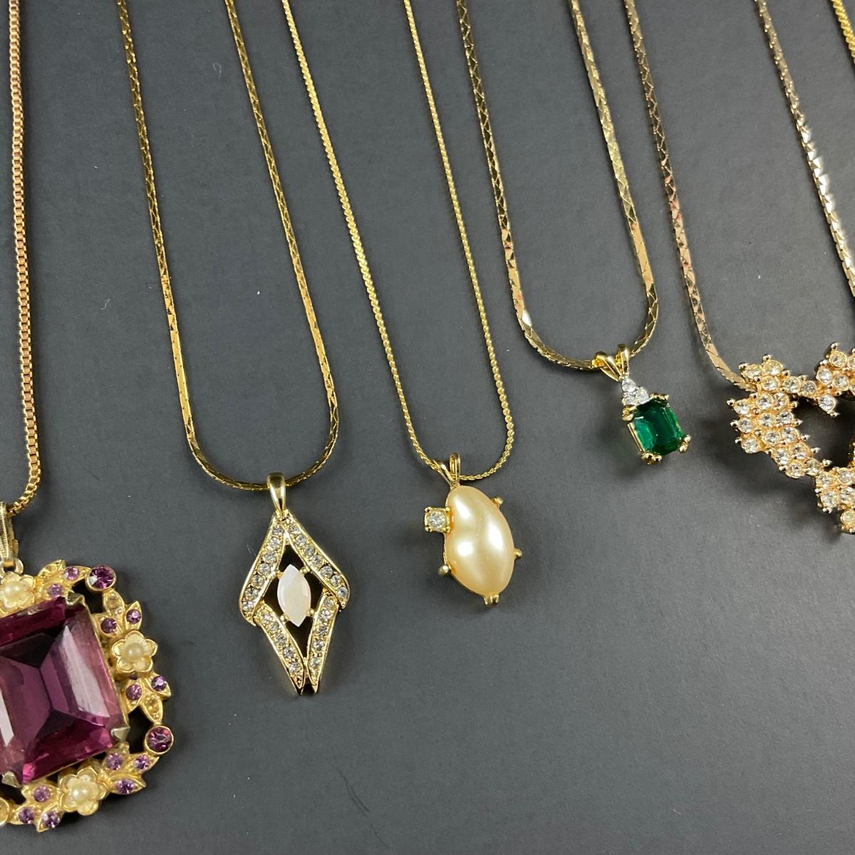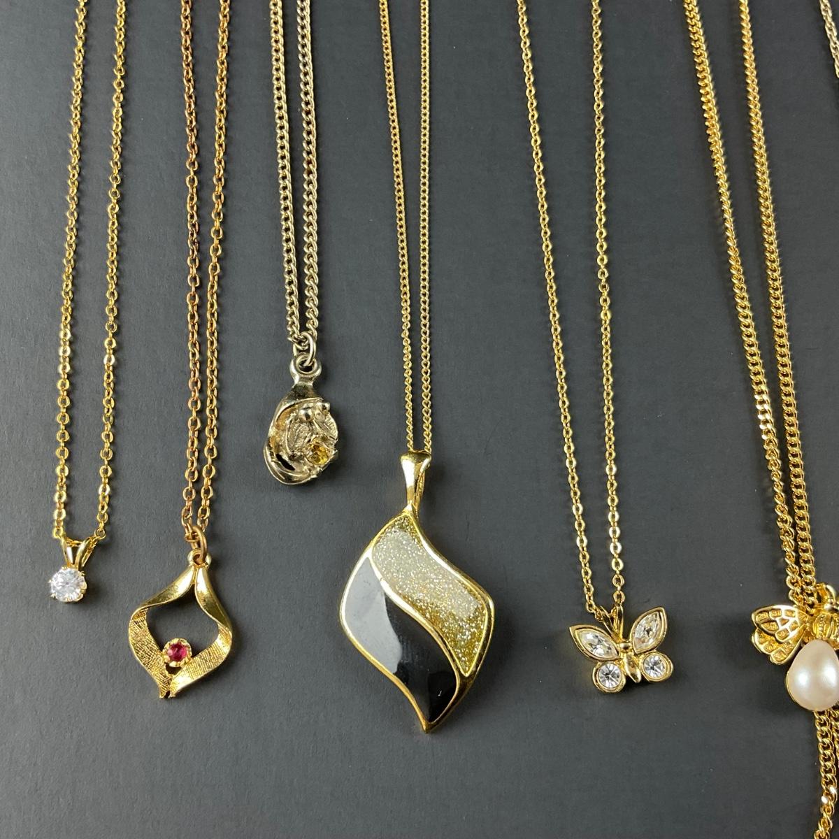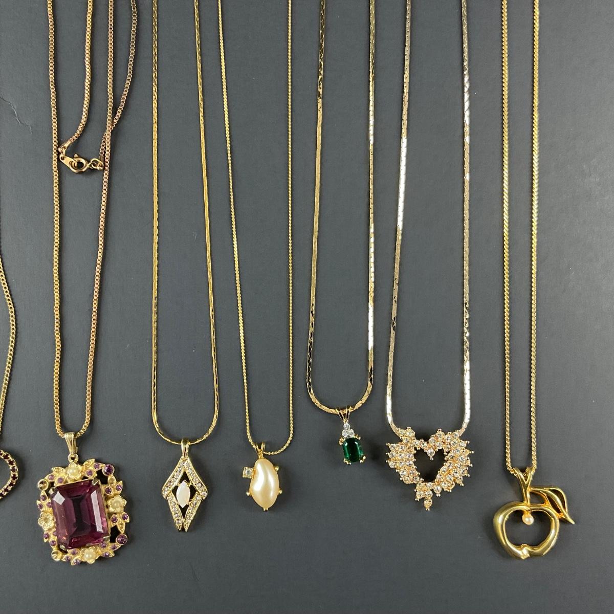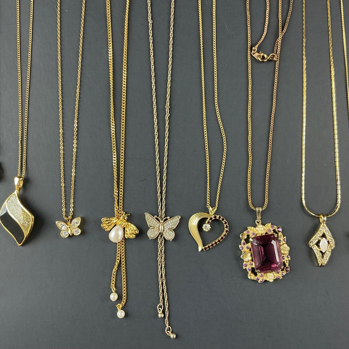 14 pieces of gold tone miscellaneous necklaces. This piece does have some scuffs, scratches, marks, or slight damage, but otherwise appears to be in great shape. Please see photos for details and condition. Any condition statement is given as a courtesy to a client, is an opinion, and should not be treated as a statement of fact. Reference to condition written, oral or within a condition report shall not be regarded as a full account of condition and may not include all defects, alterations, or restorations. Absence of a condition report does not imply a lot is flawless or lacking imperfections or damage. Katherine’s Auction & Appraisal Service shall have no responsibility for any error or omission. Returns shall not be accepted on the basis of condition. ::: Shipping is available on this lot. If you require shipping you must let us know at the close of the auction. We will coordinate with you after the item has been won. Shipping fees will include insurance up to or exceeding the value of all items being mailed. If you have any questions regarding this lot please contact the auctioneer either via this website, by direct email or by phone. PICK UP TIMES and other important information can be found in the TERMS and DESCRIPTION of the auction. Please take a look for pertinent information. Thanks!